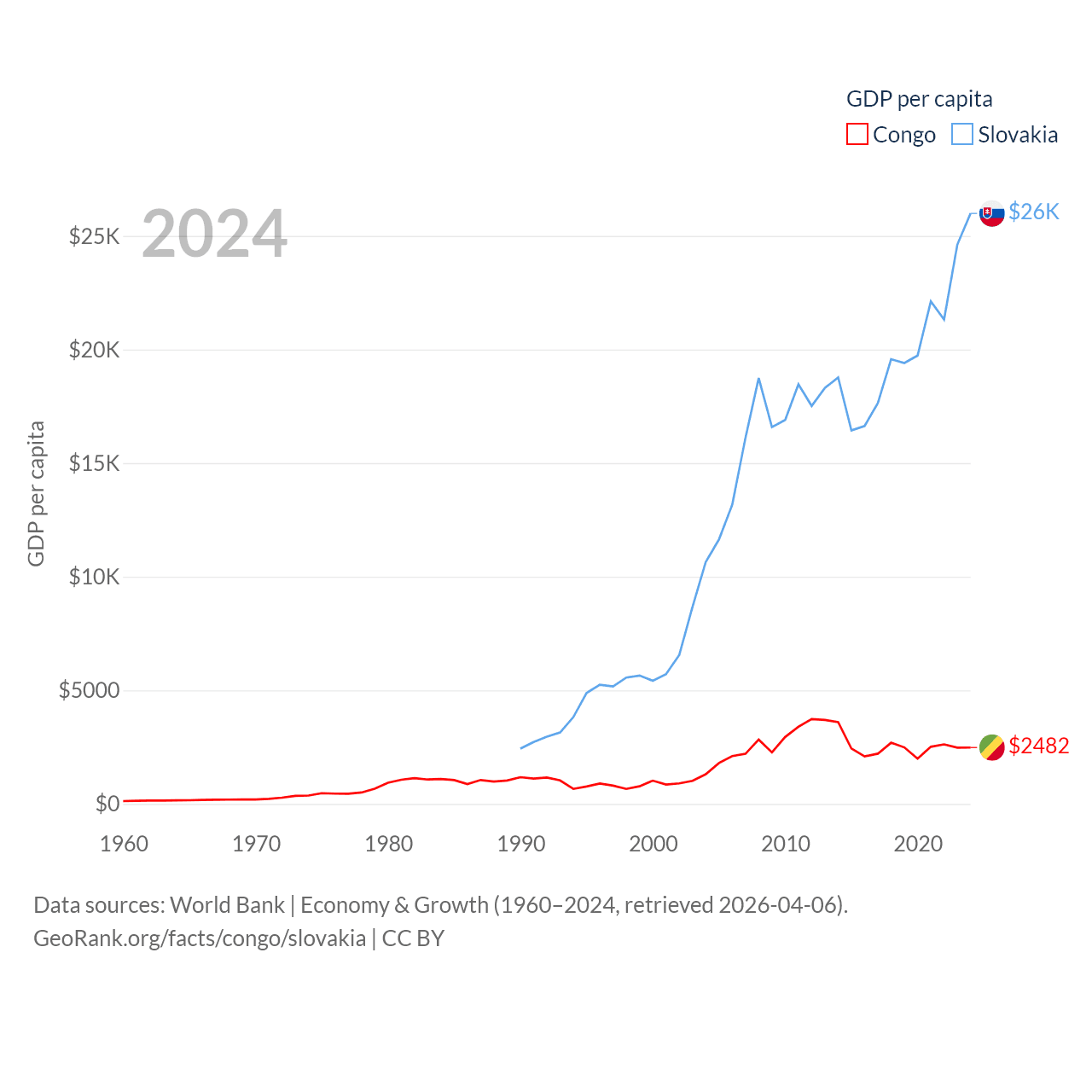 By GDP, The Congo ranks 141/197 ($15.7B) and Slovakia ranks 61/197 ($141B). By GDP per capita, The Congo ranks 149/197 ($2,482), while Slovakia ranks 47/197 ($25,993).
