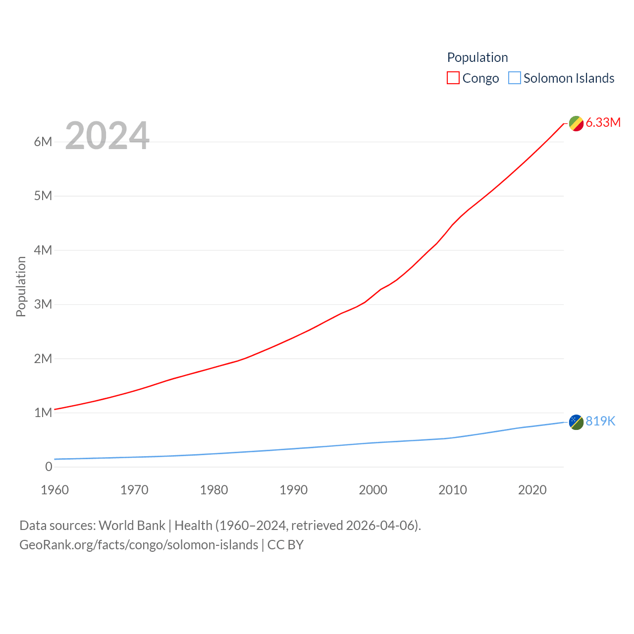 The Congo has a population of 6.33M (ranked 112/197), compared with 819K in The Solomon Islands (ranked 162/197). The Congo's land area is 131,854 sq mi versus 10,807 sq mi for The Solomon Islands (ranked 64th vs. 141st).