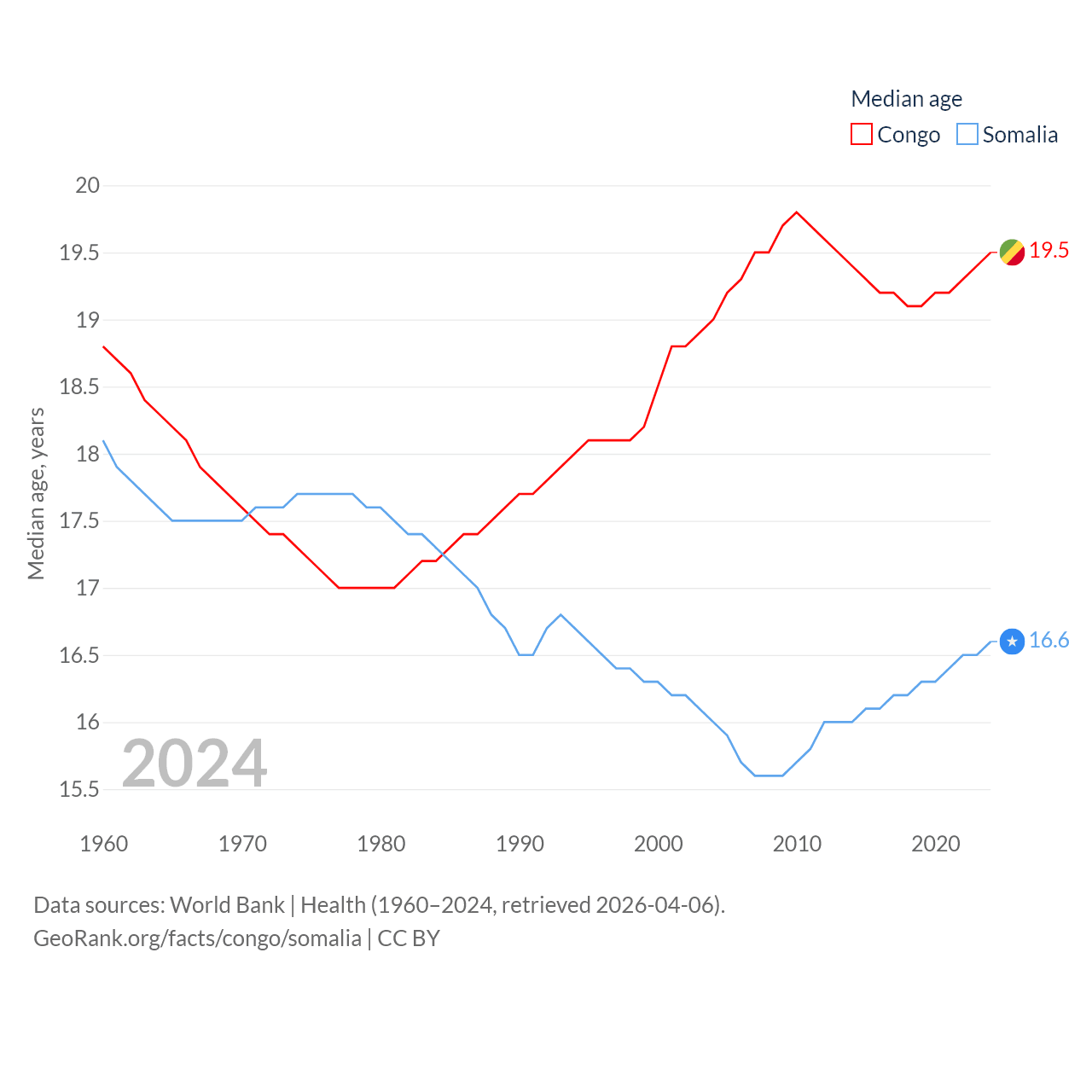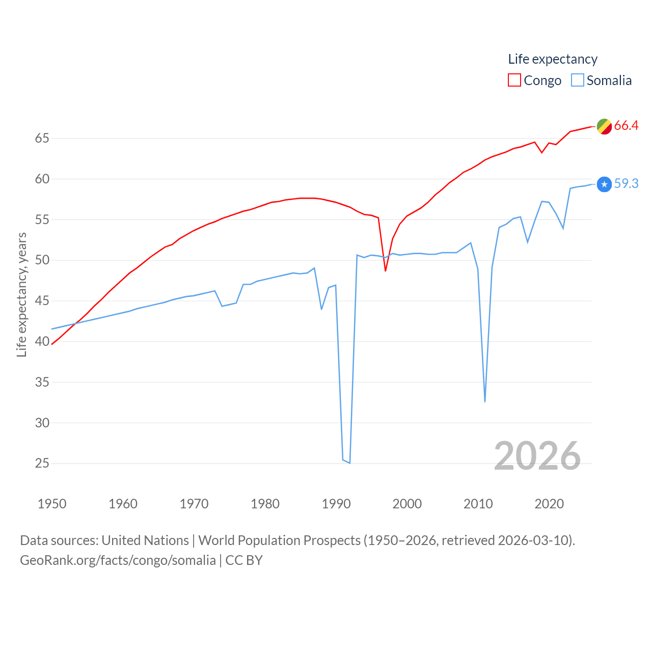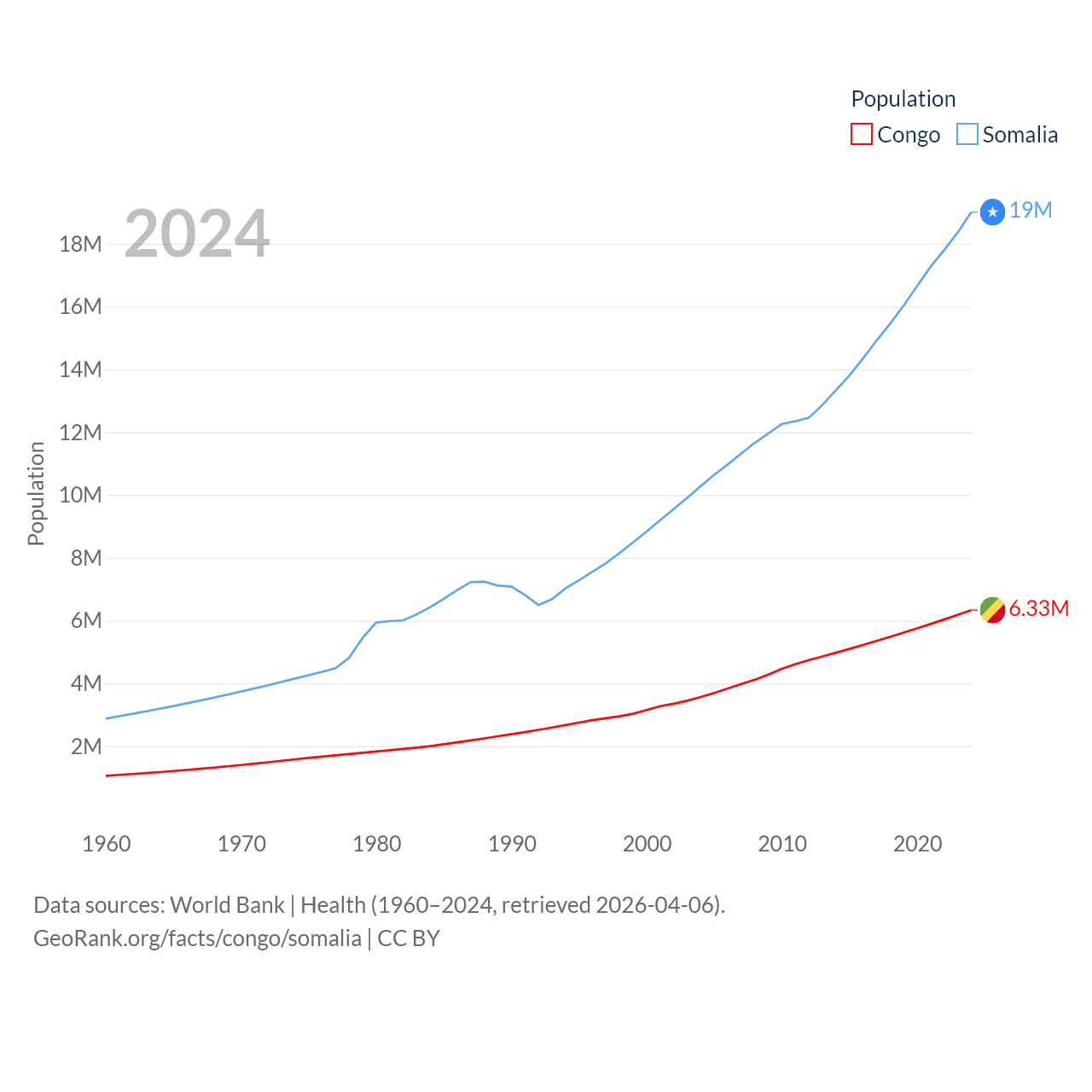 The Congo has a population of 6.33M (ranked 112/197), compared with 19M in Somalia (ranked 68/197). The Congo's land area is 131,854 sq mi versus 242,217 sq mi for Somalia (ranked 64th vs. 42nd).