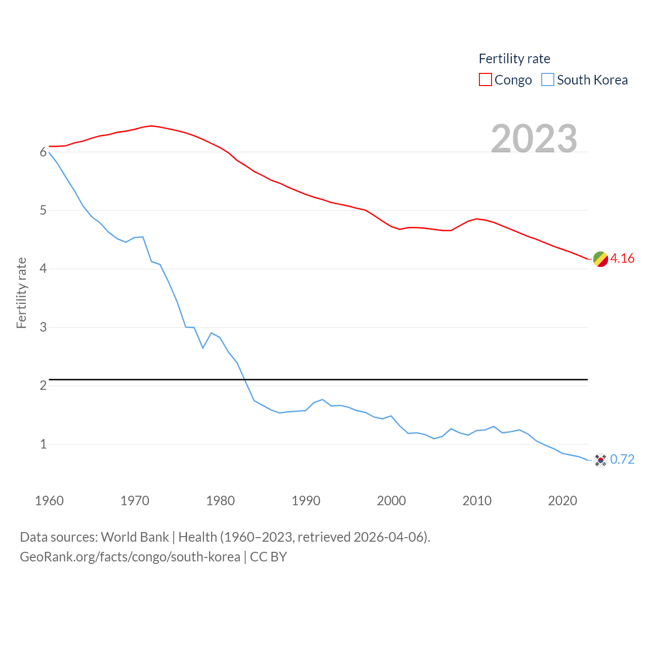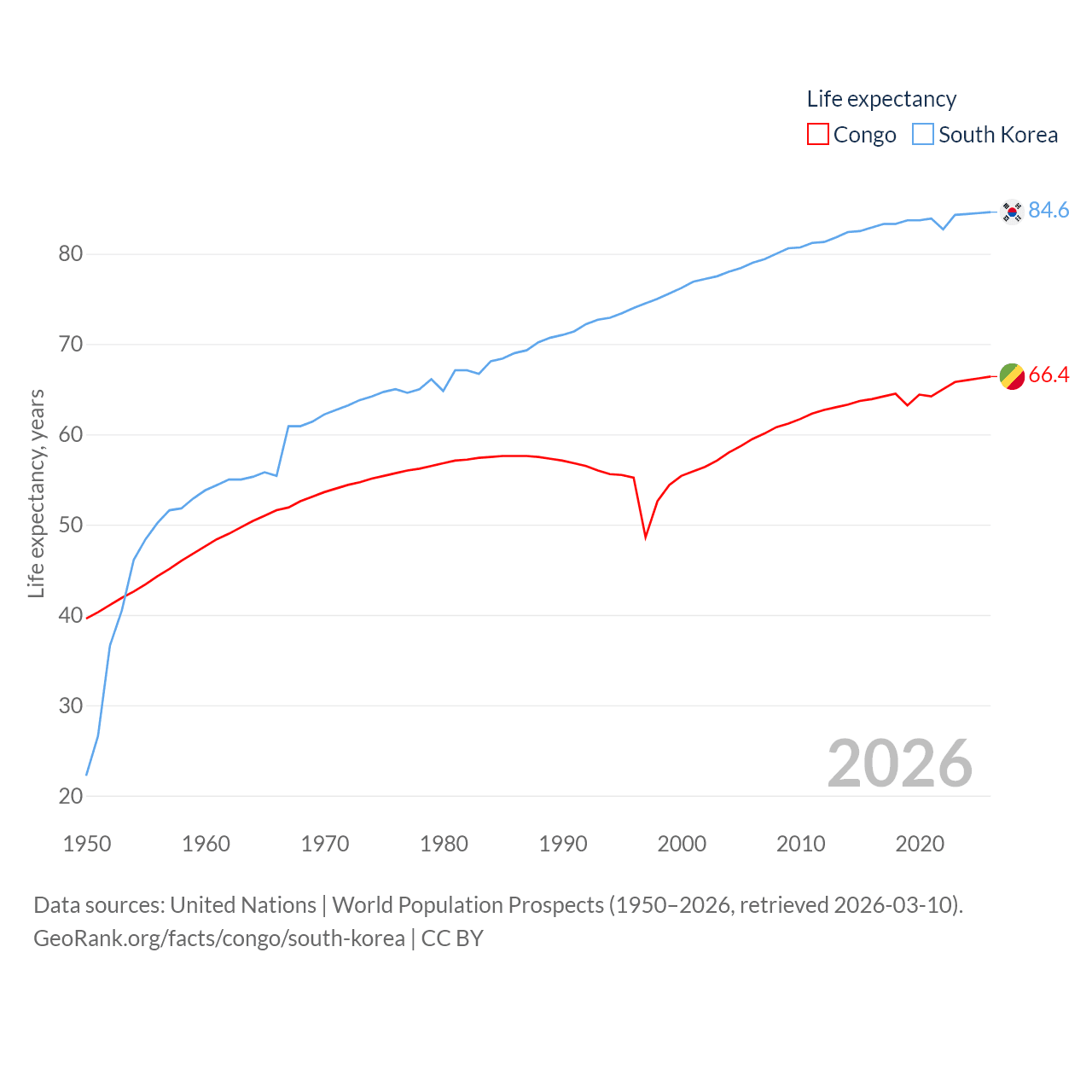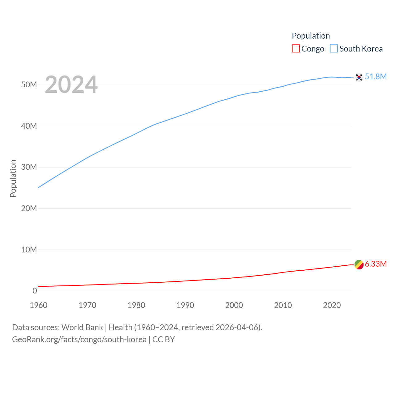 The Congo has a population of 6.33M (ranked 112/197), compared with 51.8M in South Korea (ranked 29/197). The Congo's land area is 131,854 sq mi versus 37,684 sq mi for South Korea (ranked 64th vs. 105th).