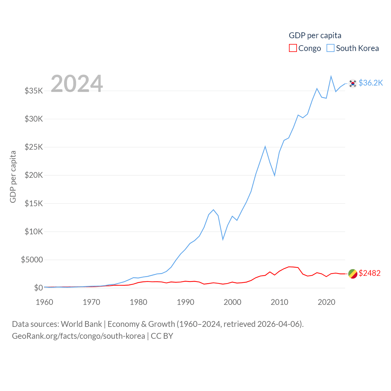 By GDP, The Congo ranks 141/197 ($15.7B) and South Korea ranks 12/197 ($1.88T). By GDP per capita, The Congo ranks 149/197 ($2,482), while South Korea ranks 31/197 ($36,239).