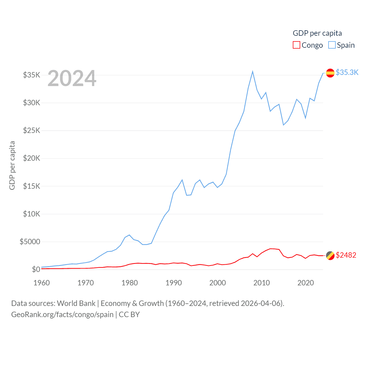 By GDP, The Congo ranks 141/197 ($15.7B) and Spain ranks 15/197 ($1.73T). By GDP per capita, The Congo ranks 149/197 ($2,482), while Spain ranks 32/197 ($35,327).