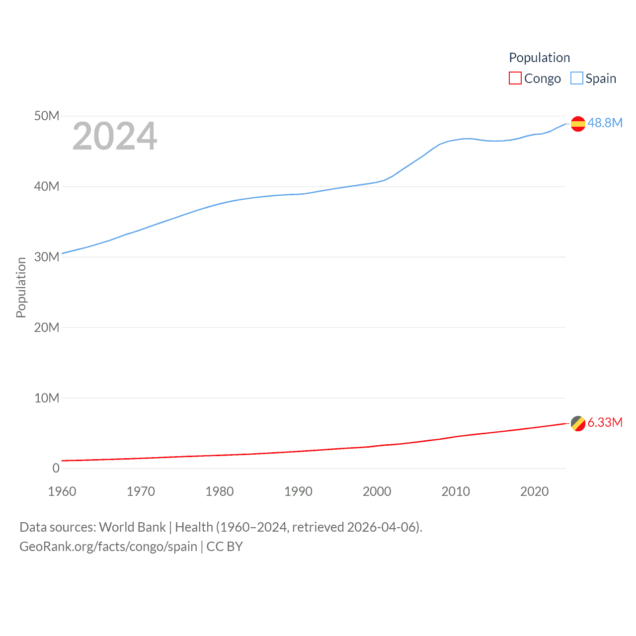 The Congo has a population of 6.33M (ranked 112/197), compared with 48.8M in Spain (ranked 32/197). The Congo's land area is 131,854 sq mi versus 192,934 sq mi for Spain (ranked 64th vs. 51st).