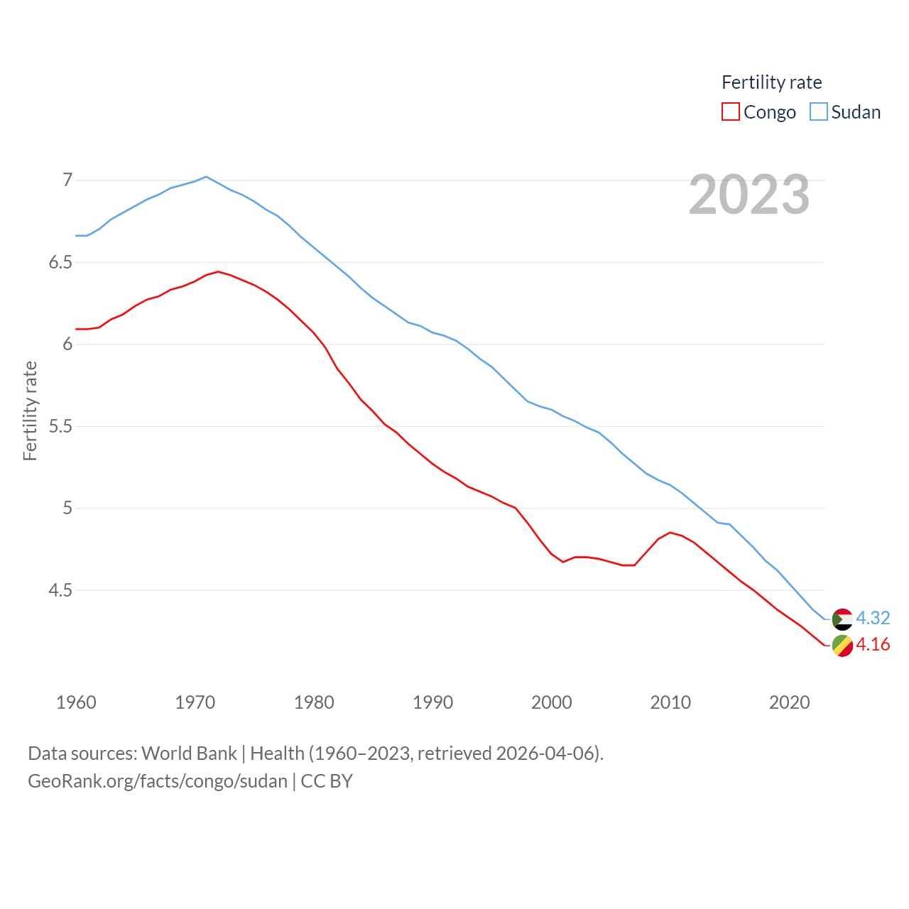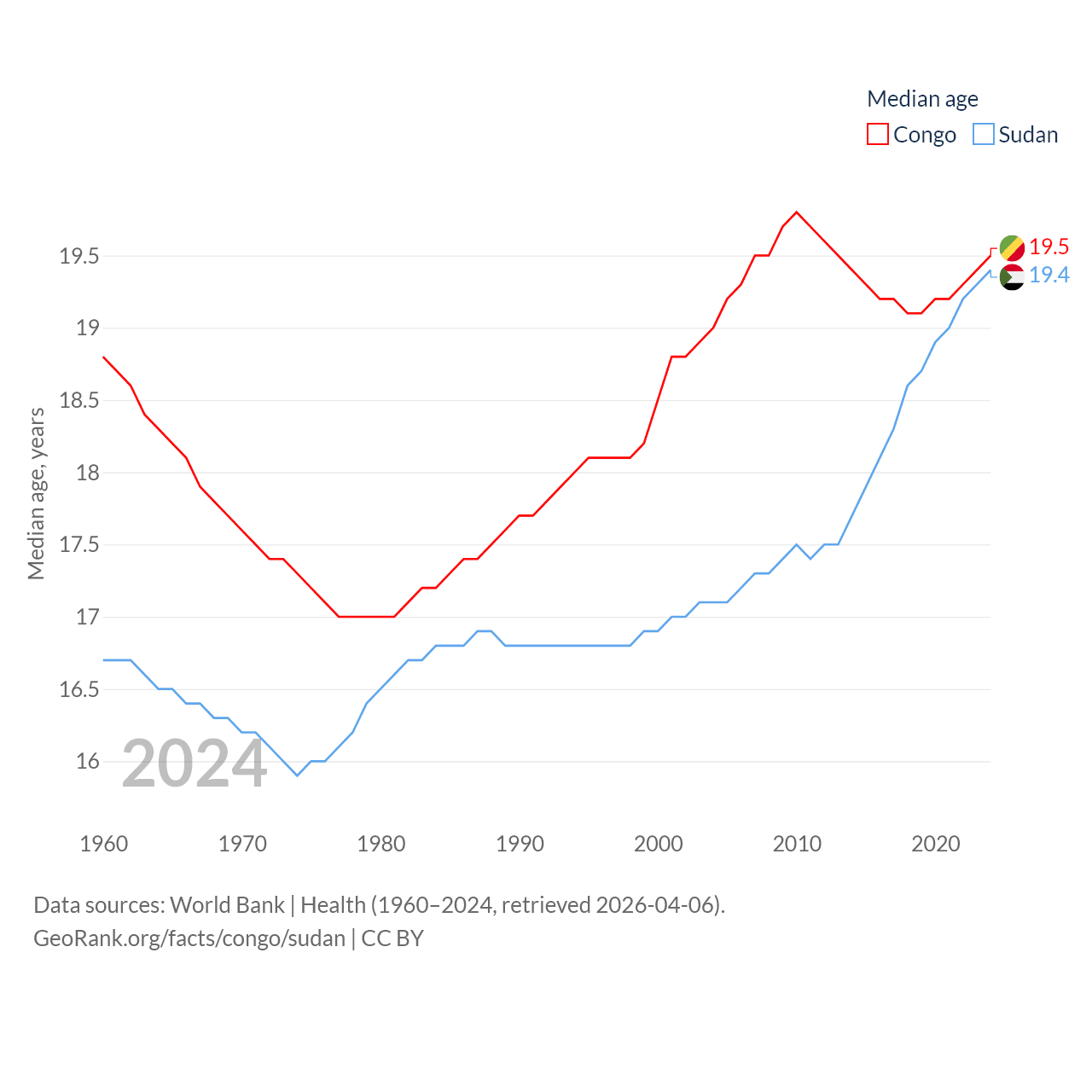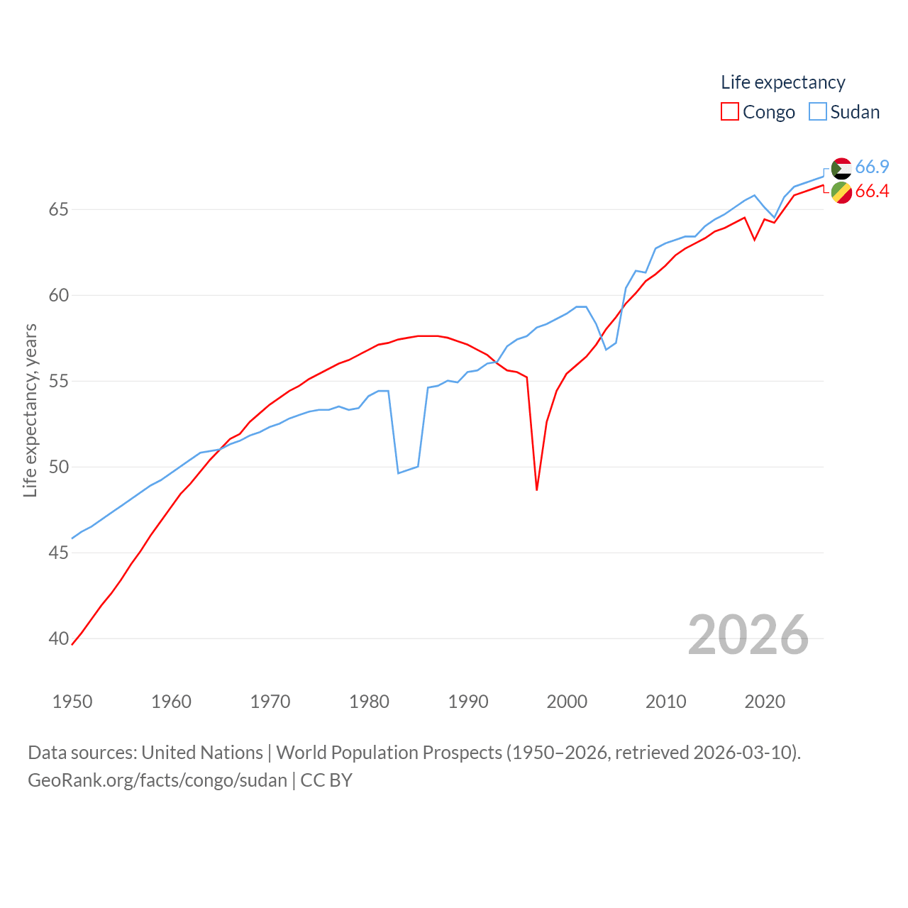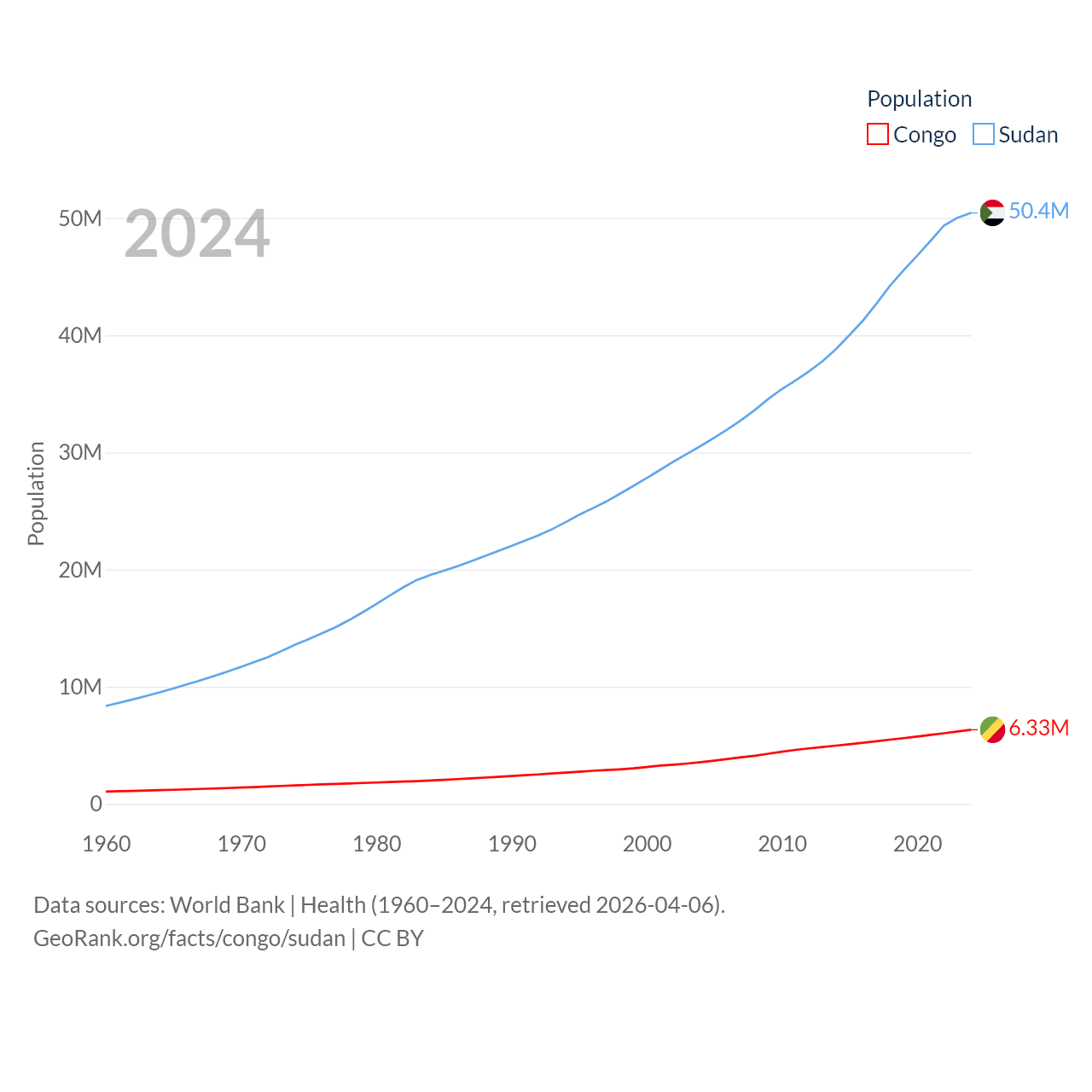 The Congo has a population of 6.33M (ranked 112/197), compared with 50.4M in Sudan (ranked 30/197). The Congo's land area is 131,854 sq mi versus 721,239 sq mi for Sudan (ranked 64th vs. 15th).