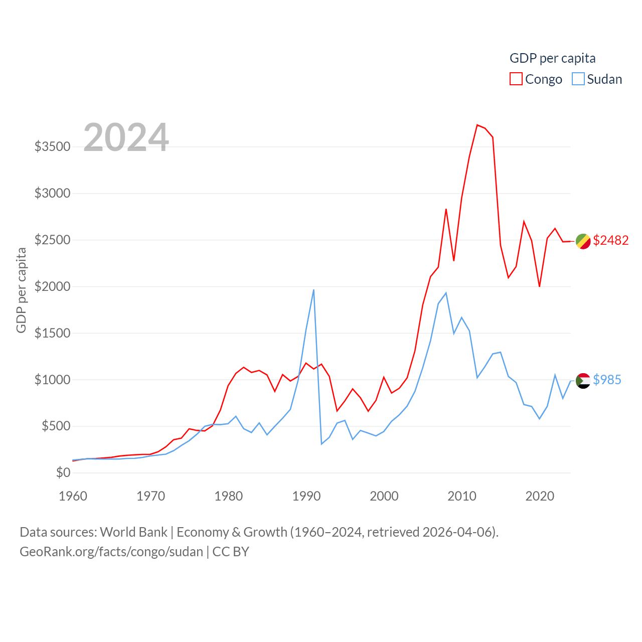 By GDP, The Congo ranks 141/197 ($15.7B) and Sudan ranks 94/197 ($49.7B). By GDP per capita, The Congo ranks 149/197 ($2,482), while Sudan ranks 179/197 ($985).