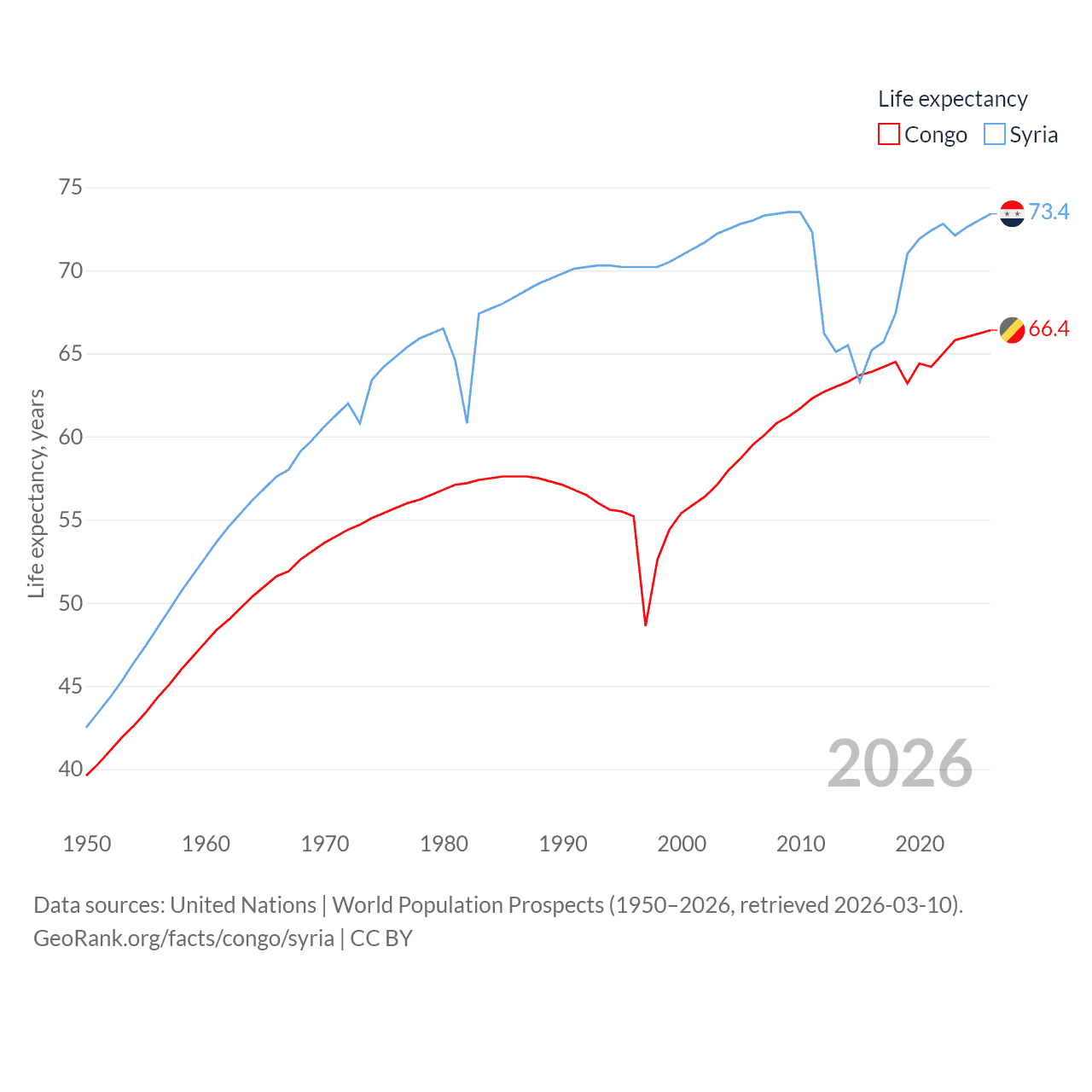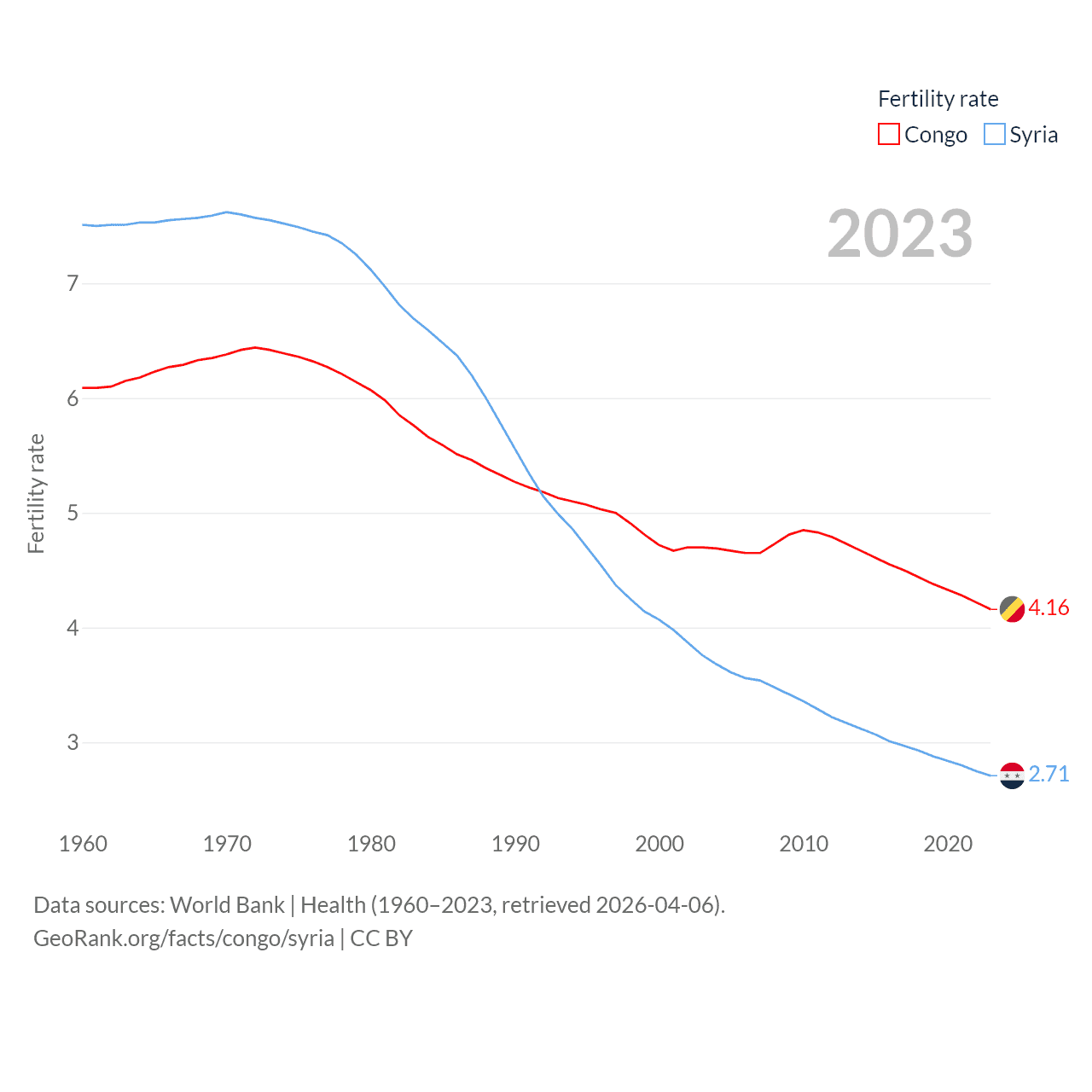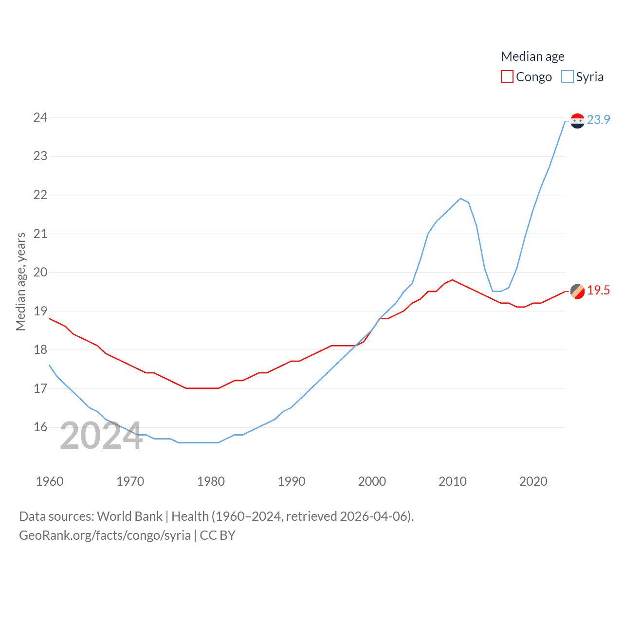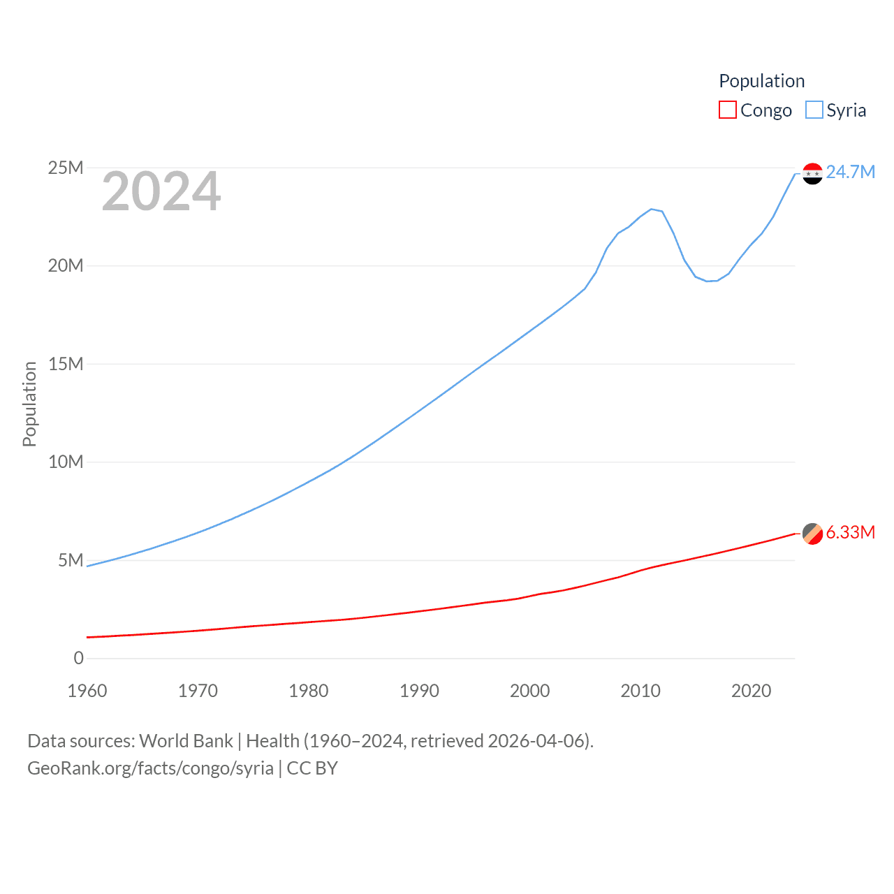 The Congo has a population of 6.33M (ranked 112/197), compared with 24.7M in Syria (ranked 57/197). The Congo's land area is 131,854 sq mi versus 70,900 sq mi for Syria (ranked 64th vs. 87th).