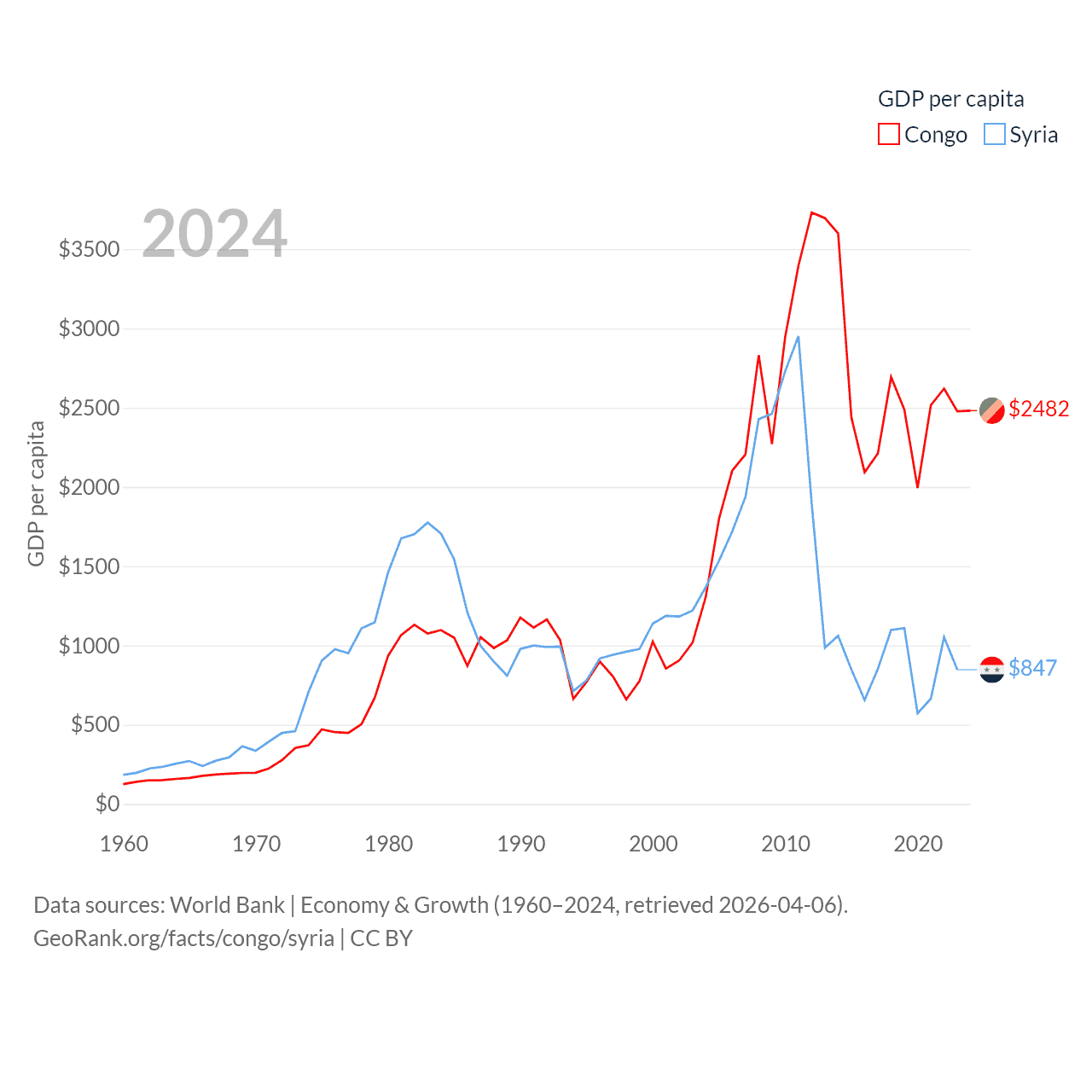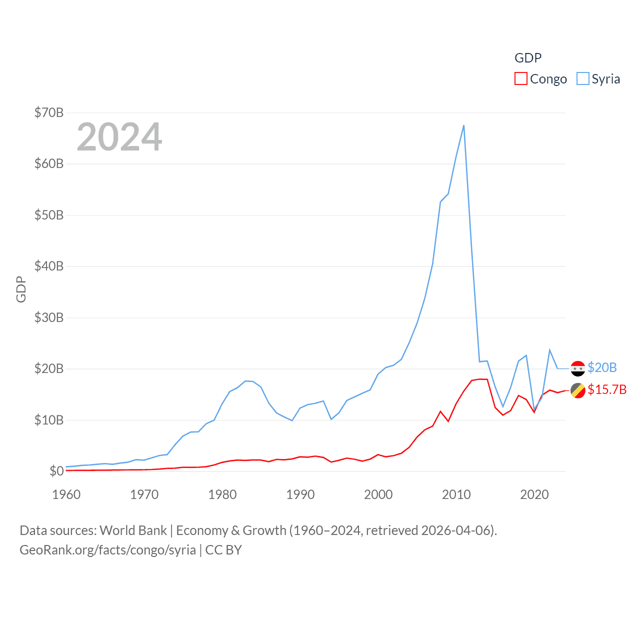 By GDP, The Congo ranks 141/197 ($15.7B) and Syria ranks 129/197 ($20B). By GDP per capita, The Congo ranks 149/197 ($2,482), while Syria ranks 185/197 ($847).