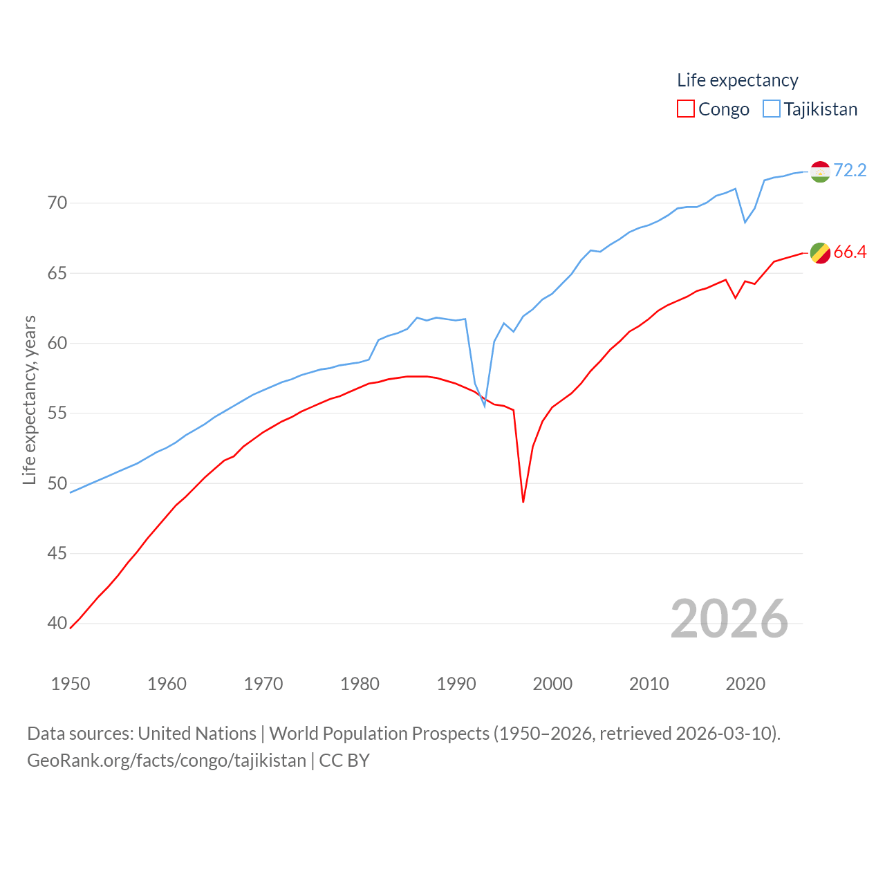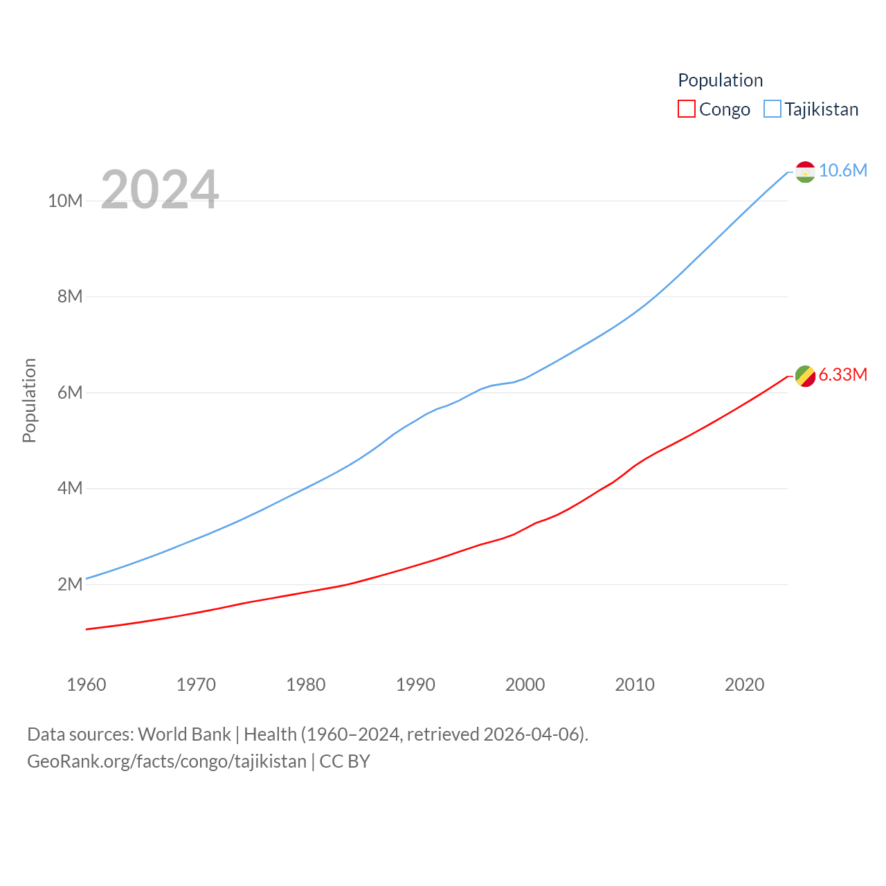 The Congo has a population of 6.33M (ranked 112/197), compared with 10.6M in Tajikistan (ranked 91/197). The Congo's land area is 131,854 sq mi versus 53,587 sq mi for Tajikistan (ranked 64th vs. 93rd).