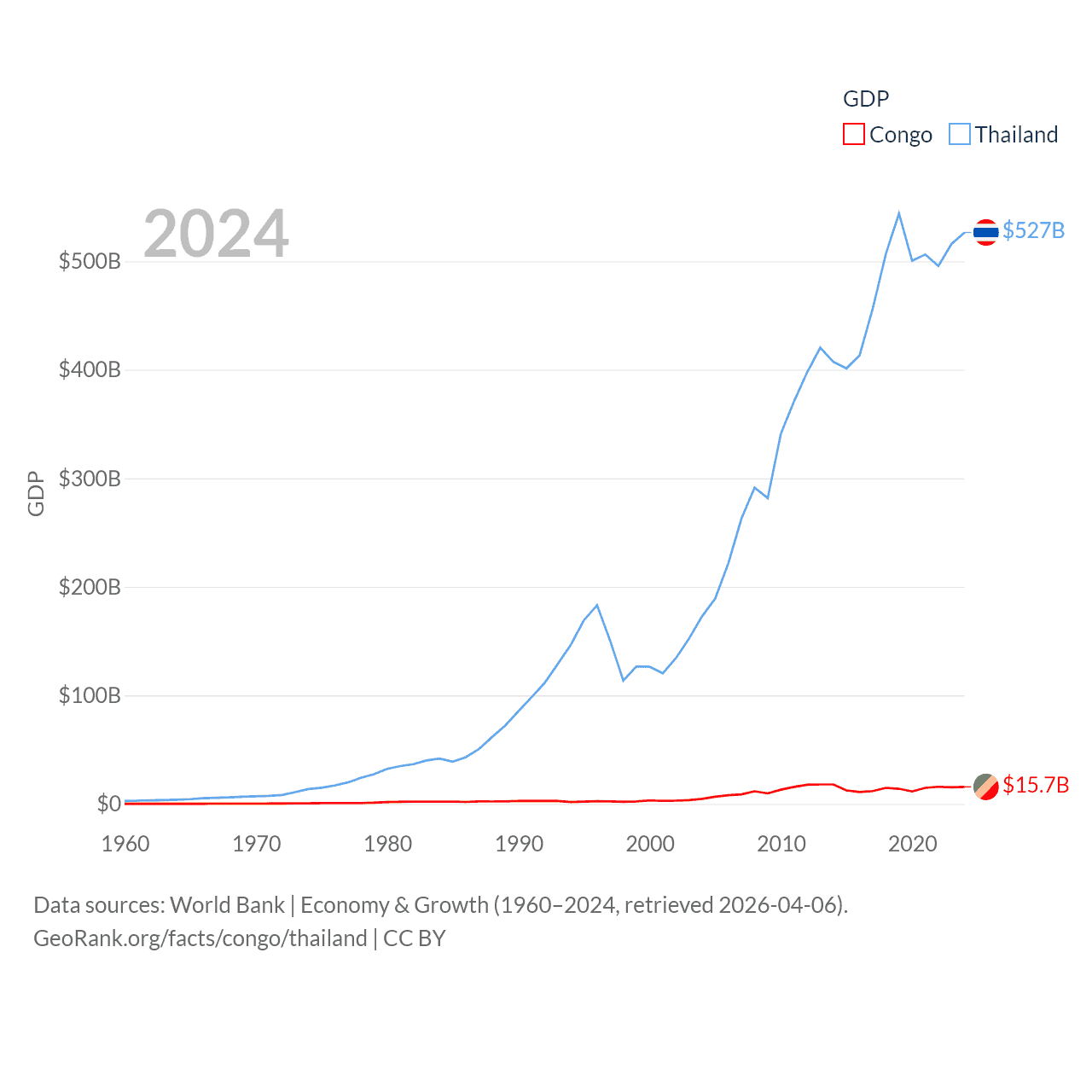 By GDP, The Congo ranks 141/197 ($15.7B) and Thailand ranks 31/197 ($527B). By GDP per capita, The Congo ranks 149/197 ($2,482), while Thailand ranks 100/197 ($7,347).
