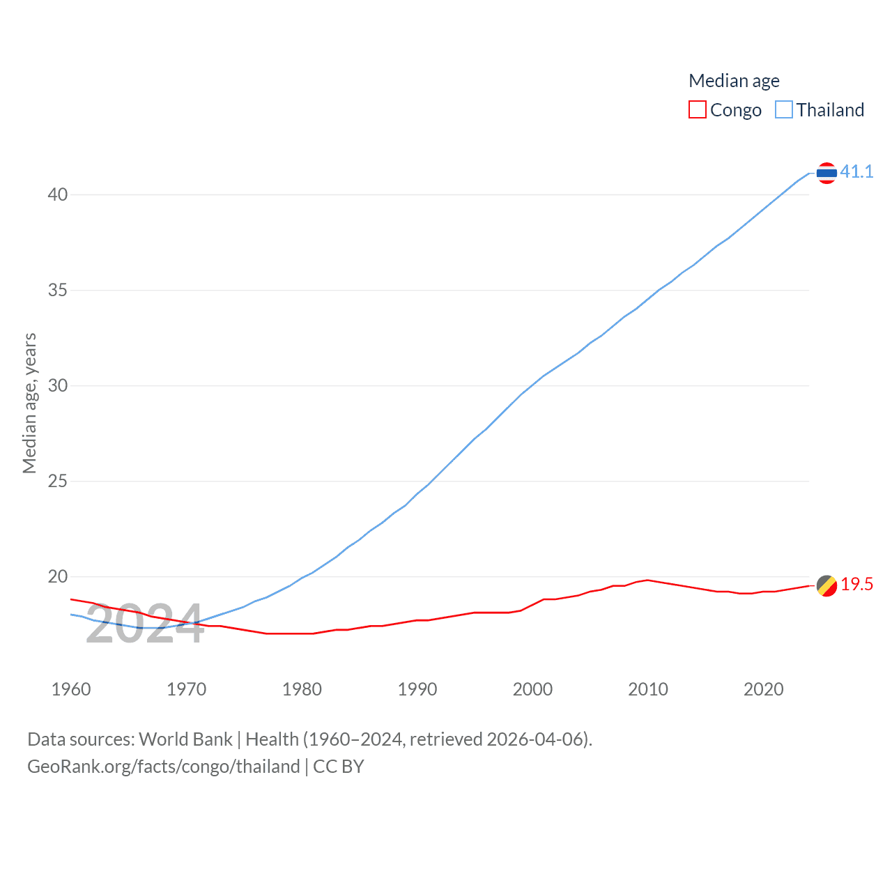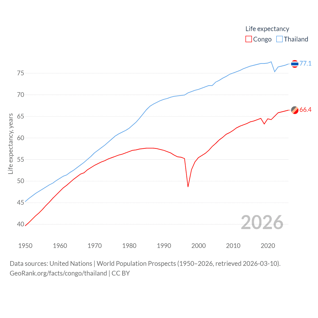 The Congo has a population of 6.33M (ranked 112/197), compared with 71.7M in Thailand (ranked 20/197). The Congo's land area is 131,854 sq mi versus 197,256 sq mi for Thailand (ranked 64th vs. 50th).