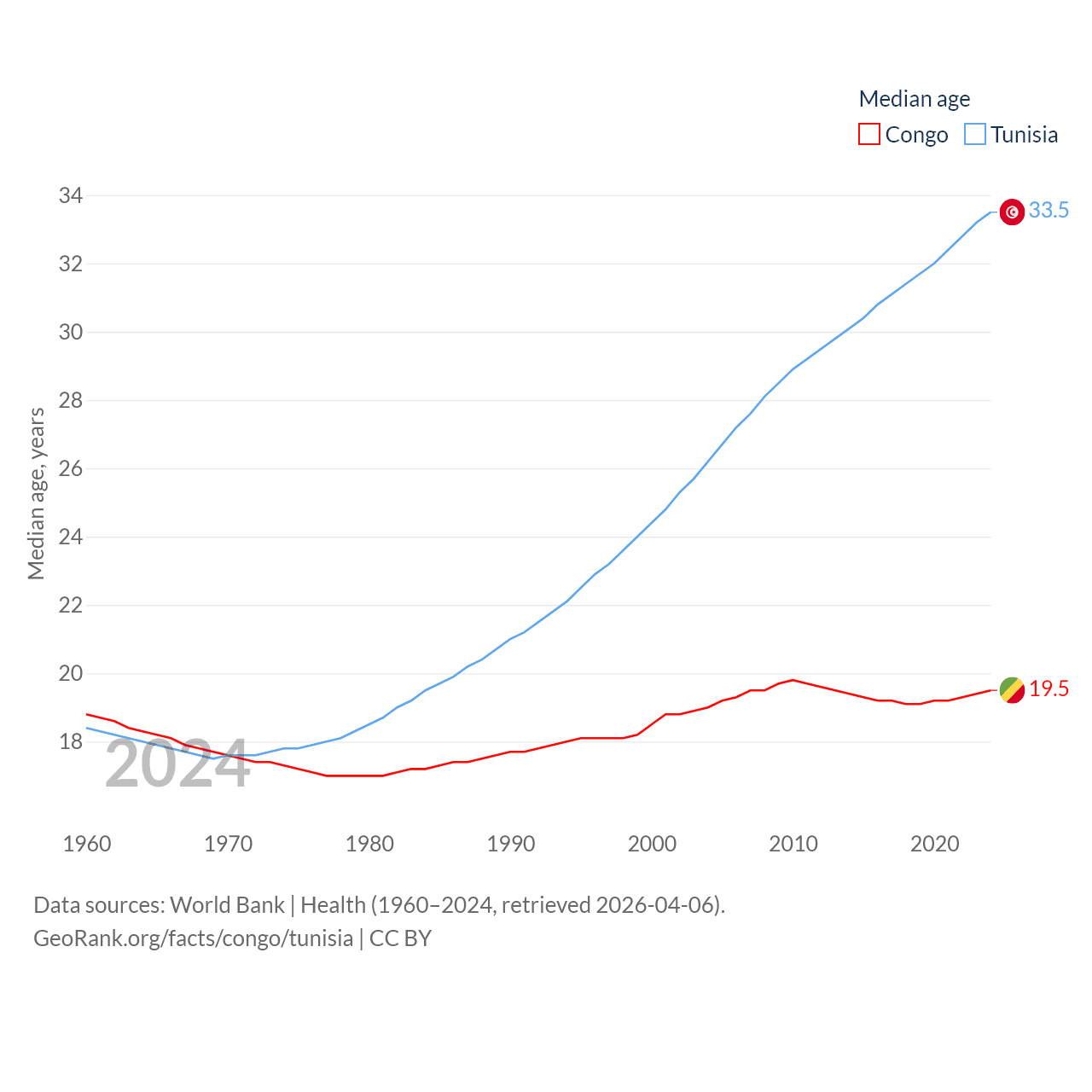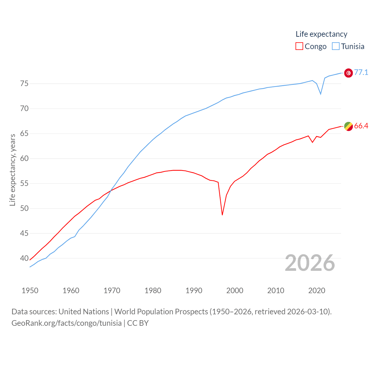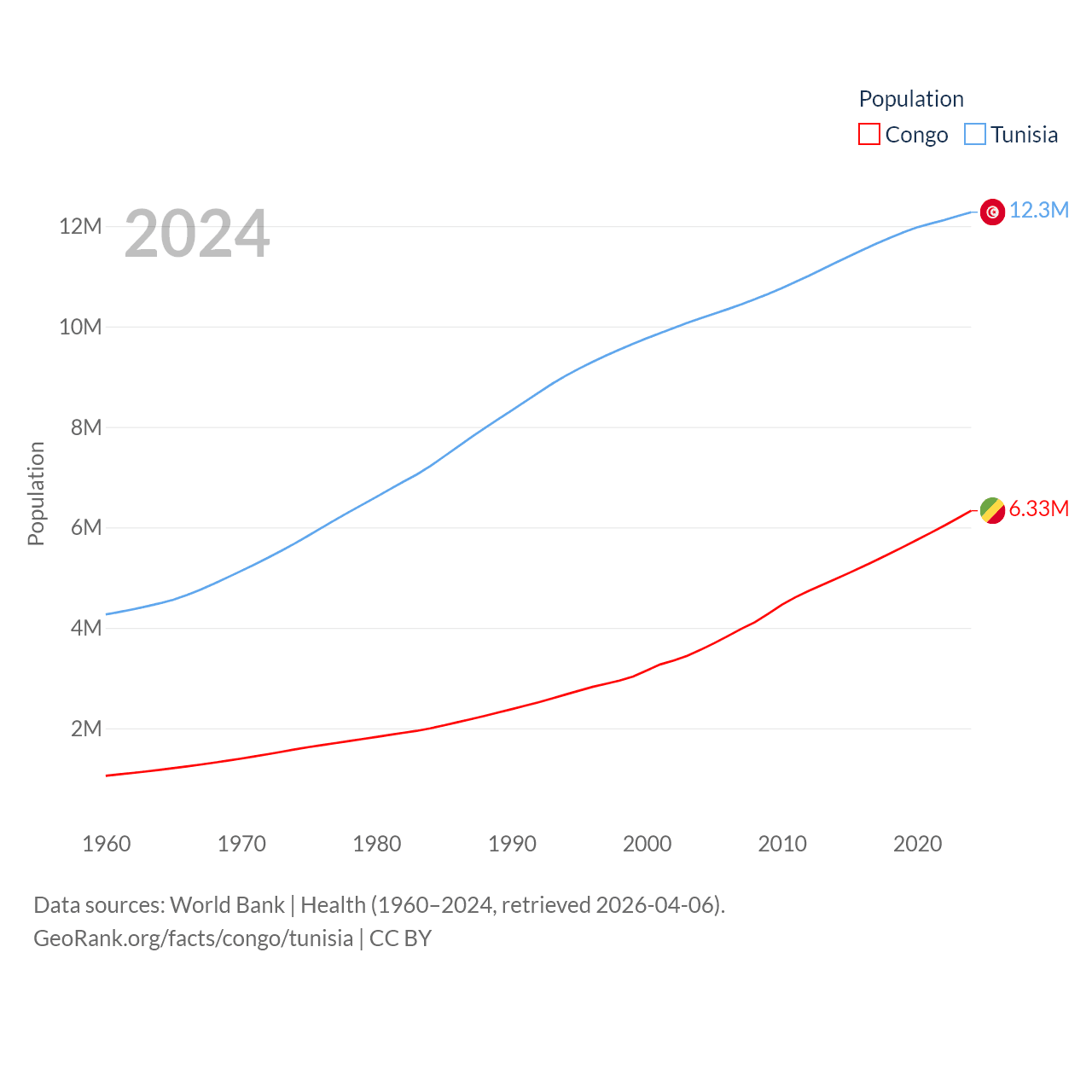 The Congo has a population of 6.33M (ranked 112/197), compared with 12.3M in Tunisia (ranked 80/197). The Congo's land area is 131,854 sq mi versus 59,985 sq mi for Tunisia (ranked 64th vs. 91st).