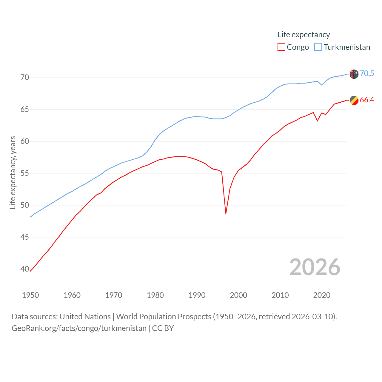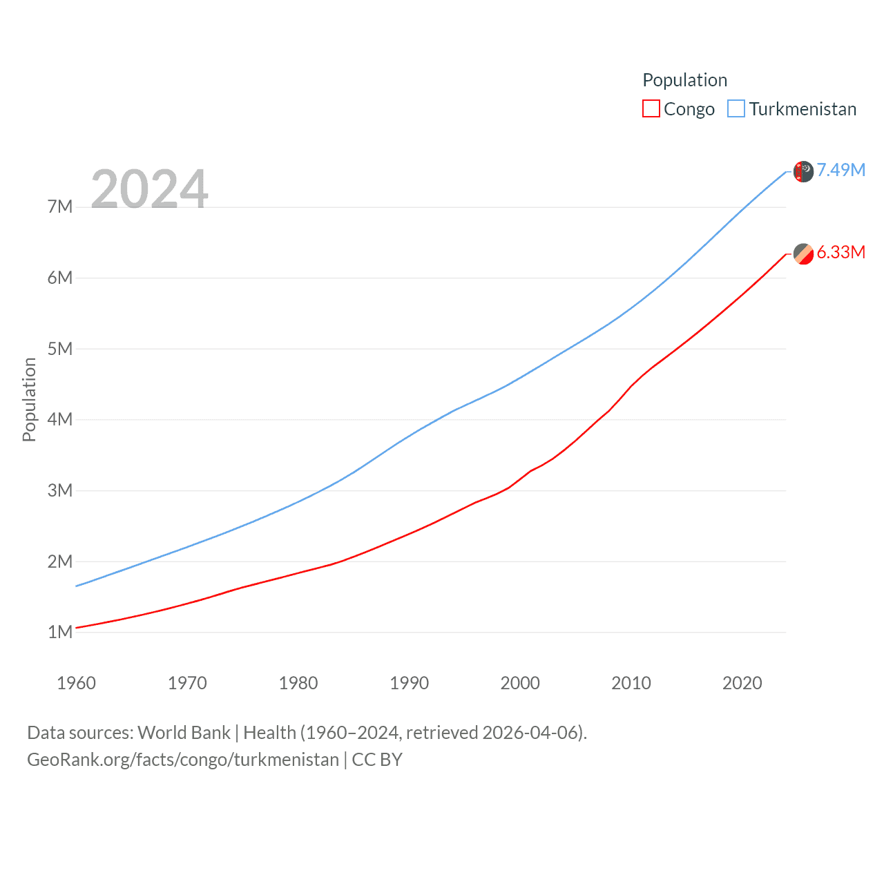 The Congo has a population of 6.33M (ranked 112/197), compared with 7.49M in Turkmenistan (ranked 104/197). The Congo's land area is 131,854 sq mi versus 181,441 sq mi for Turkmenistan (ranked 64th vs. 53rd).