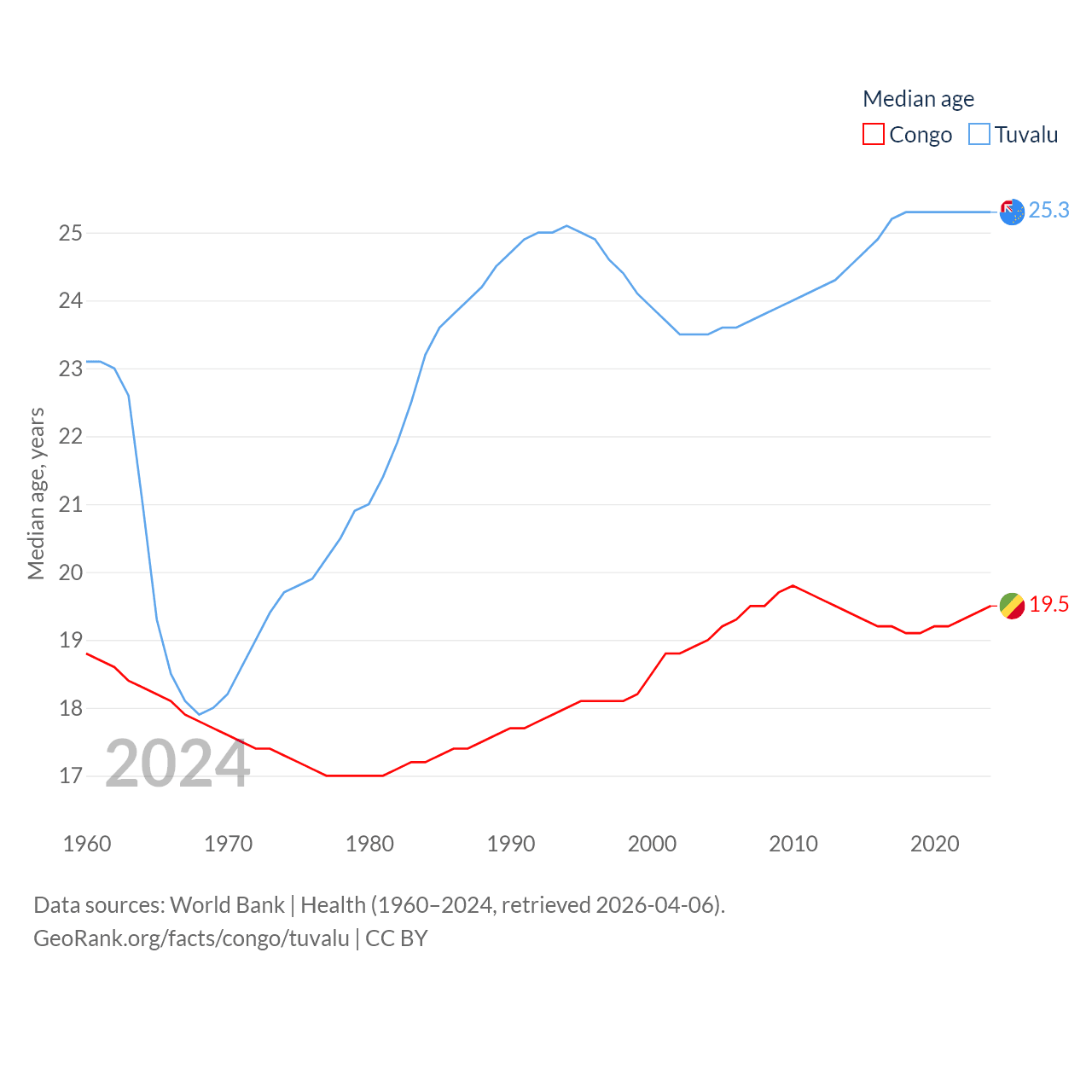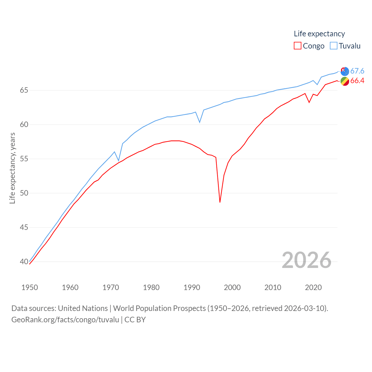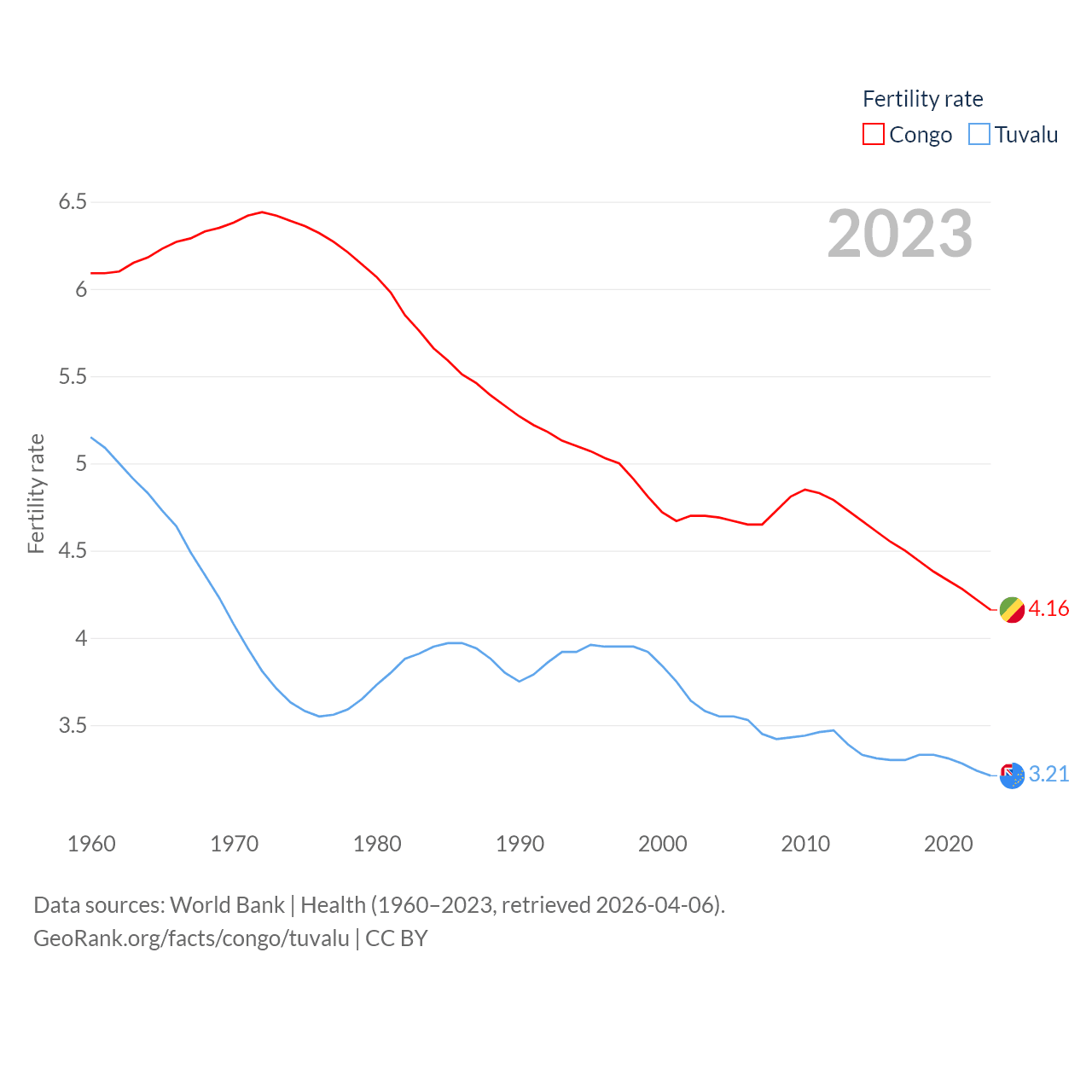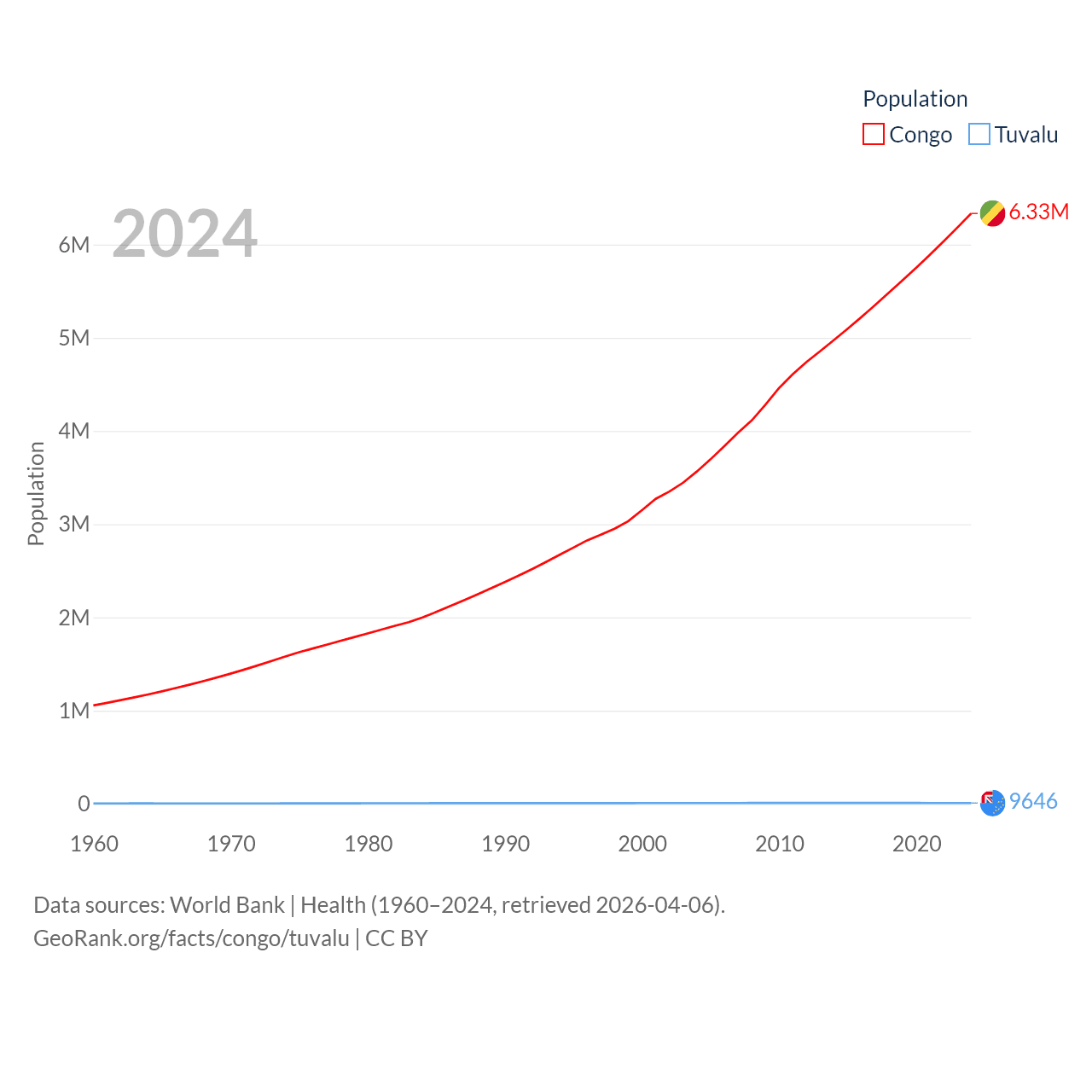 The Congo has a population of 6.33M (ranked 112/197), compared with 9.65K in Tuvalu (ranked 196/197). The Congo's land area is 131,854 sq mi versus 11.6 sq mi for Tuvalu (ranked 64th vs. 194th).