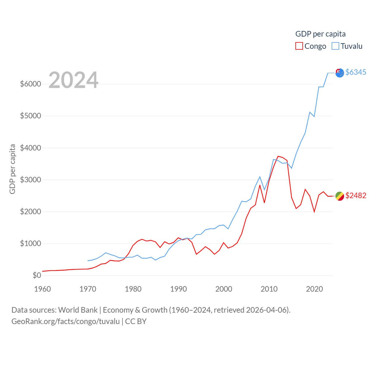 By GDP, The Congo ranks 141/197 ($15.7B) and Tuvalu ranks 196/197 ($62.3M). By GDP per capita, The Congo ranks 149/197 ($2,482), while Tuvalu ranks 110/197 ($6,345).