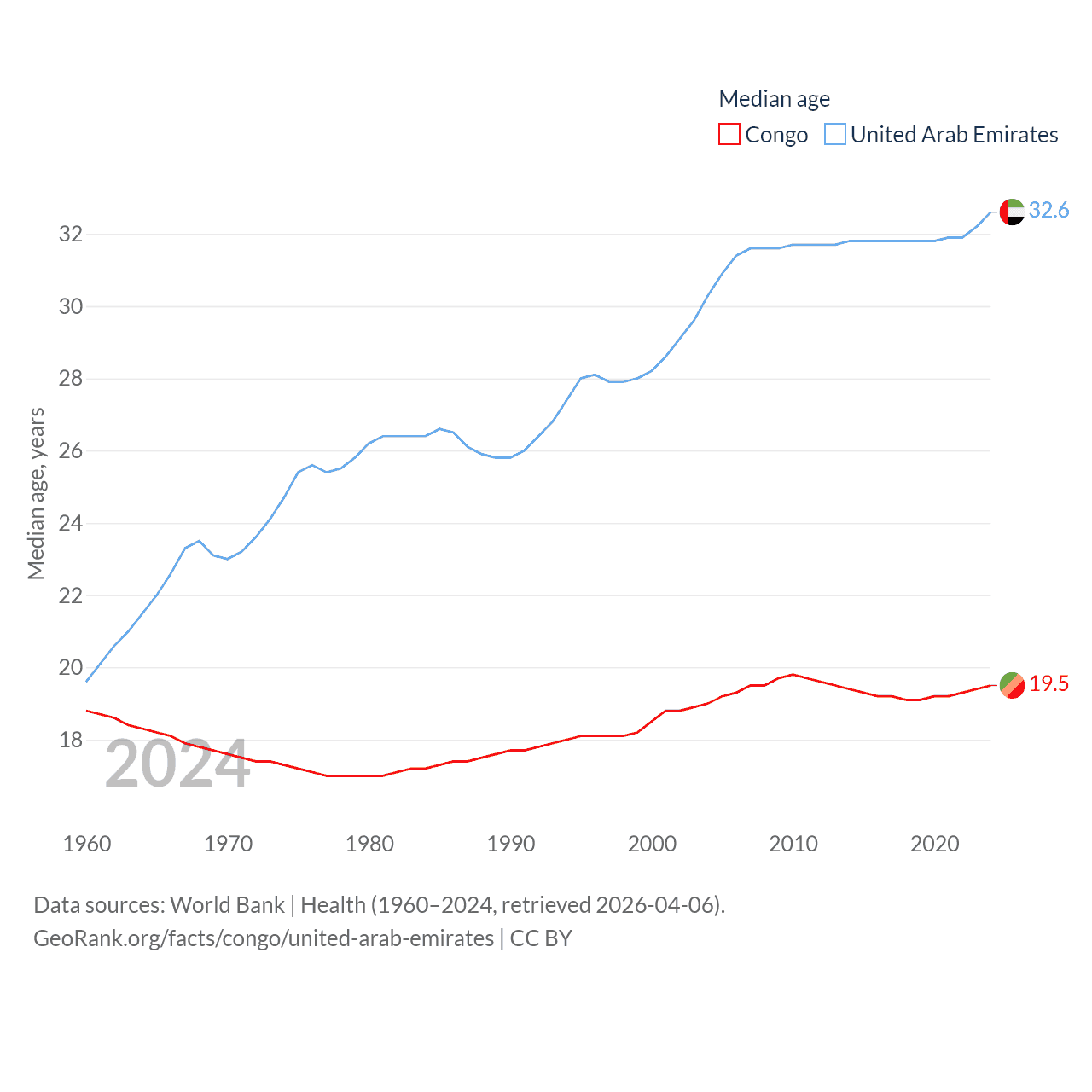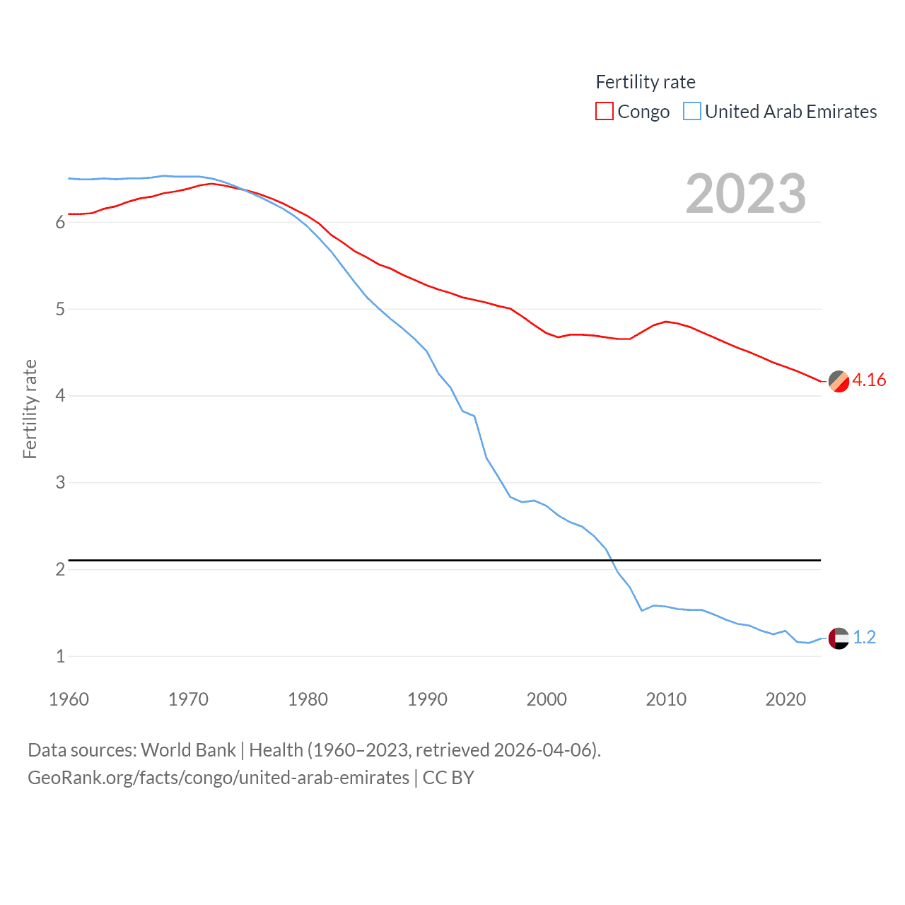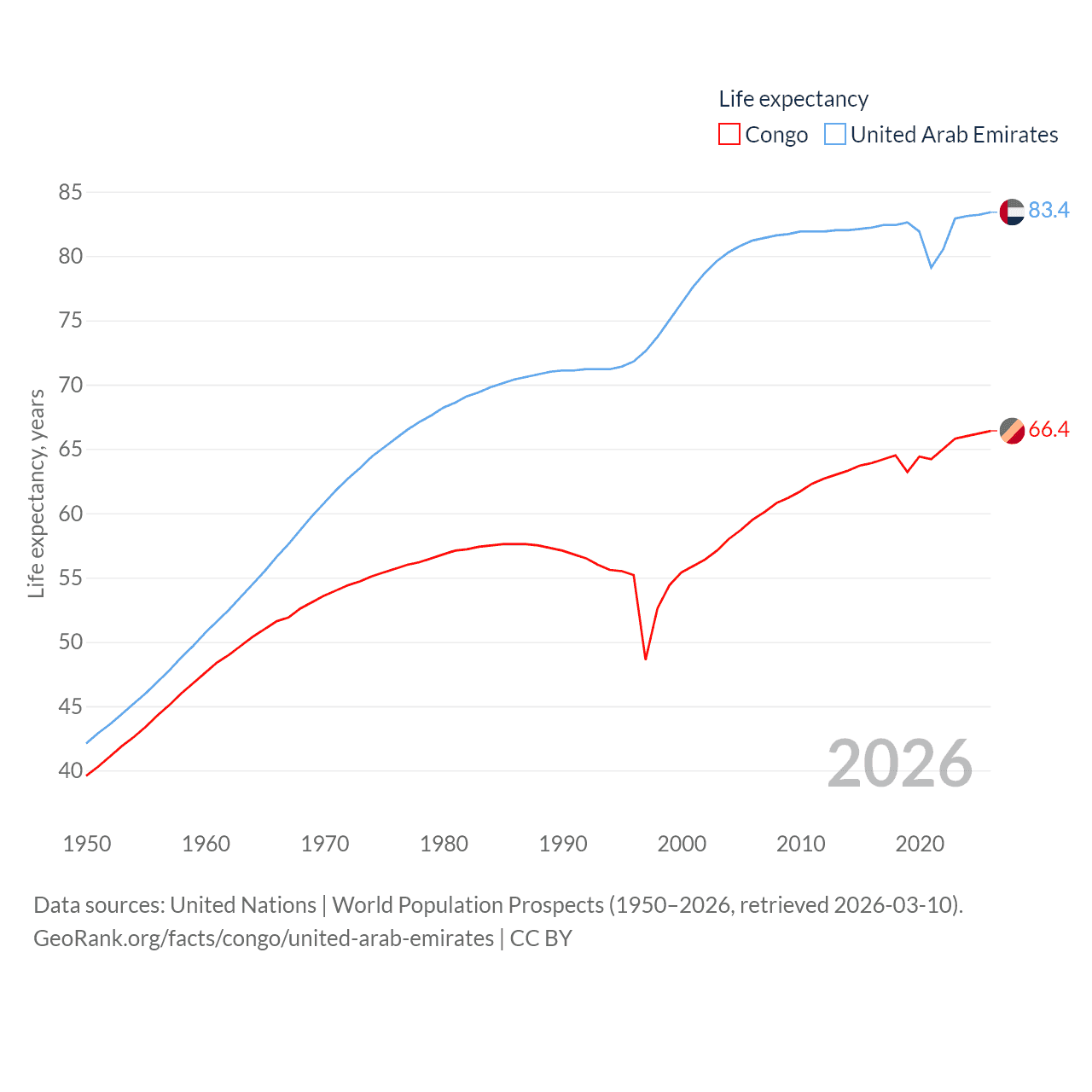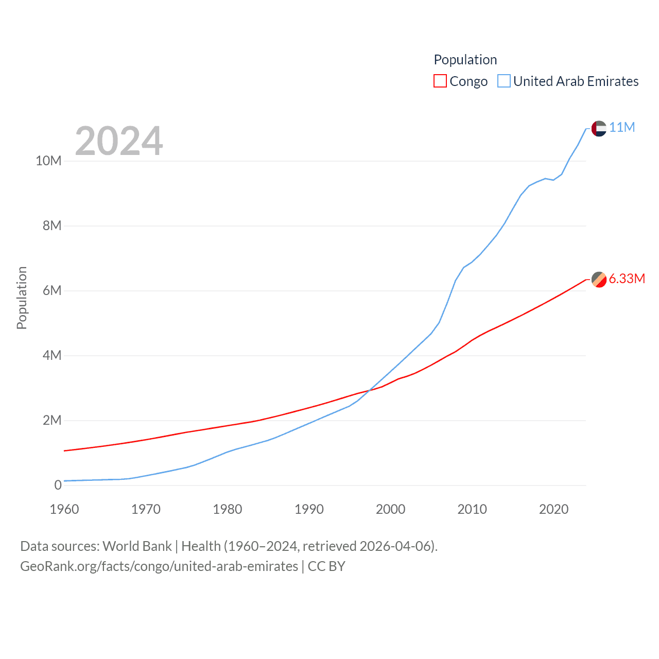 The Congo has a population of 6.33M (ranked 112/197), compared with 11M in The United Arab Emirates (ranked 86/197). The Congo's land area is 131,854 sq mi versus 27,421 sq mi for The United Arab Emirates (ranked 64th vs. 117th).