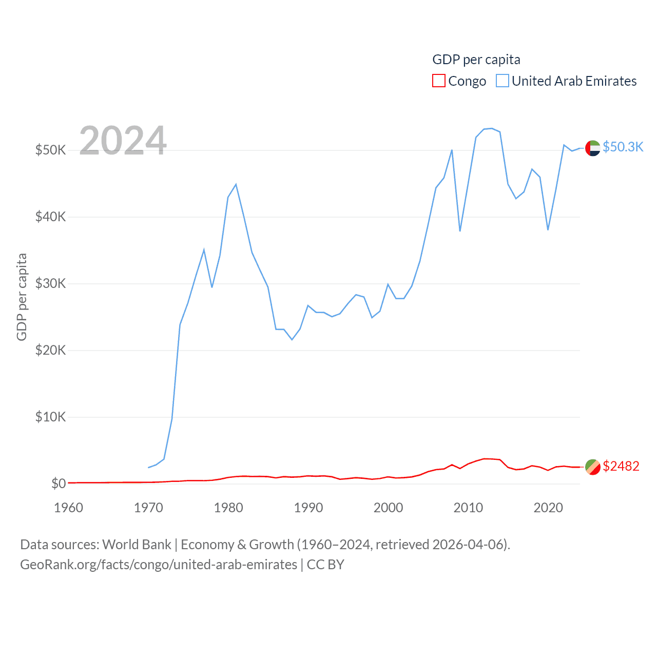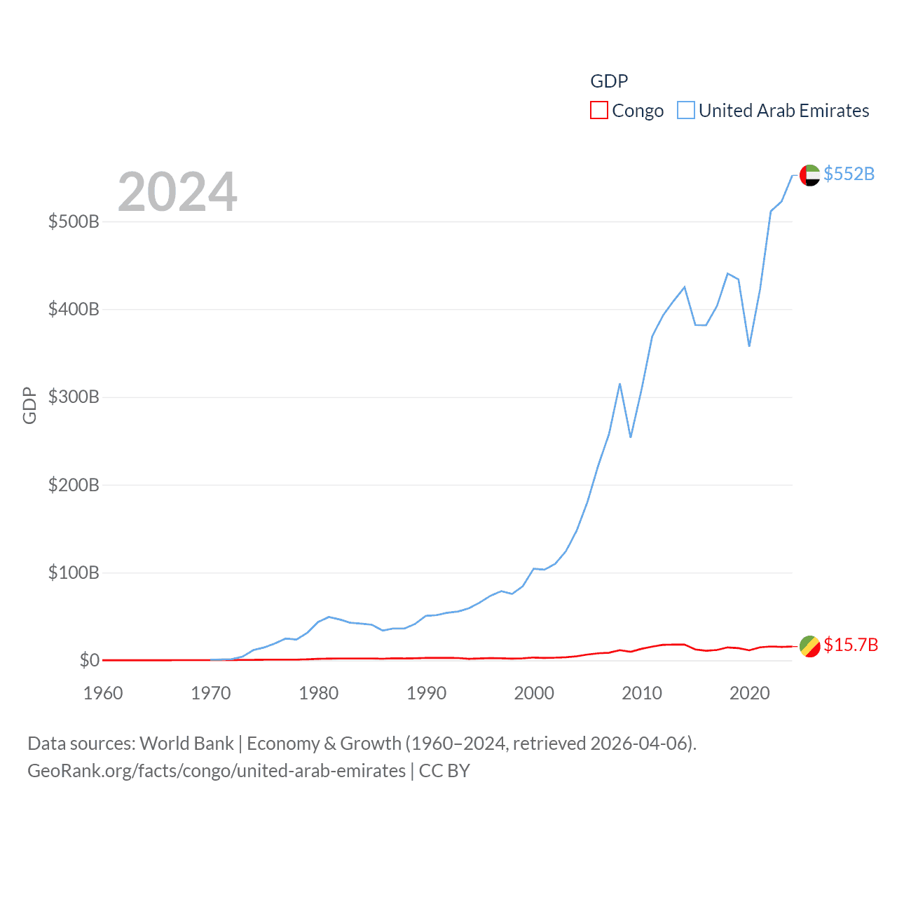 By GDP, The Congo ranks 141/197 ($15.7B) and The United Arab Emirates ranks 27/197 ($552B). By GDP per capita, The Congo ranks 149/197 ($2,482), while The United Arab Emirates ranks 24/197 ($50,274).