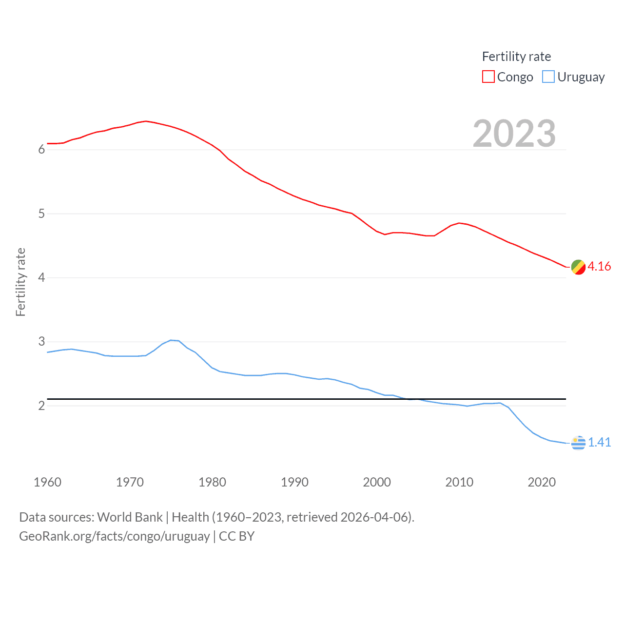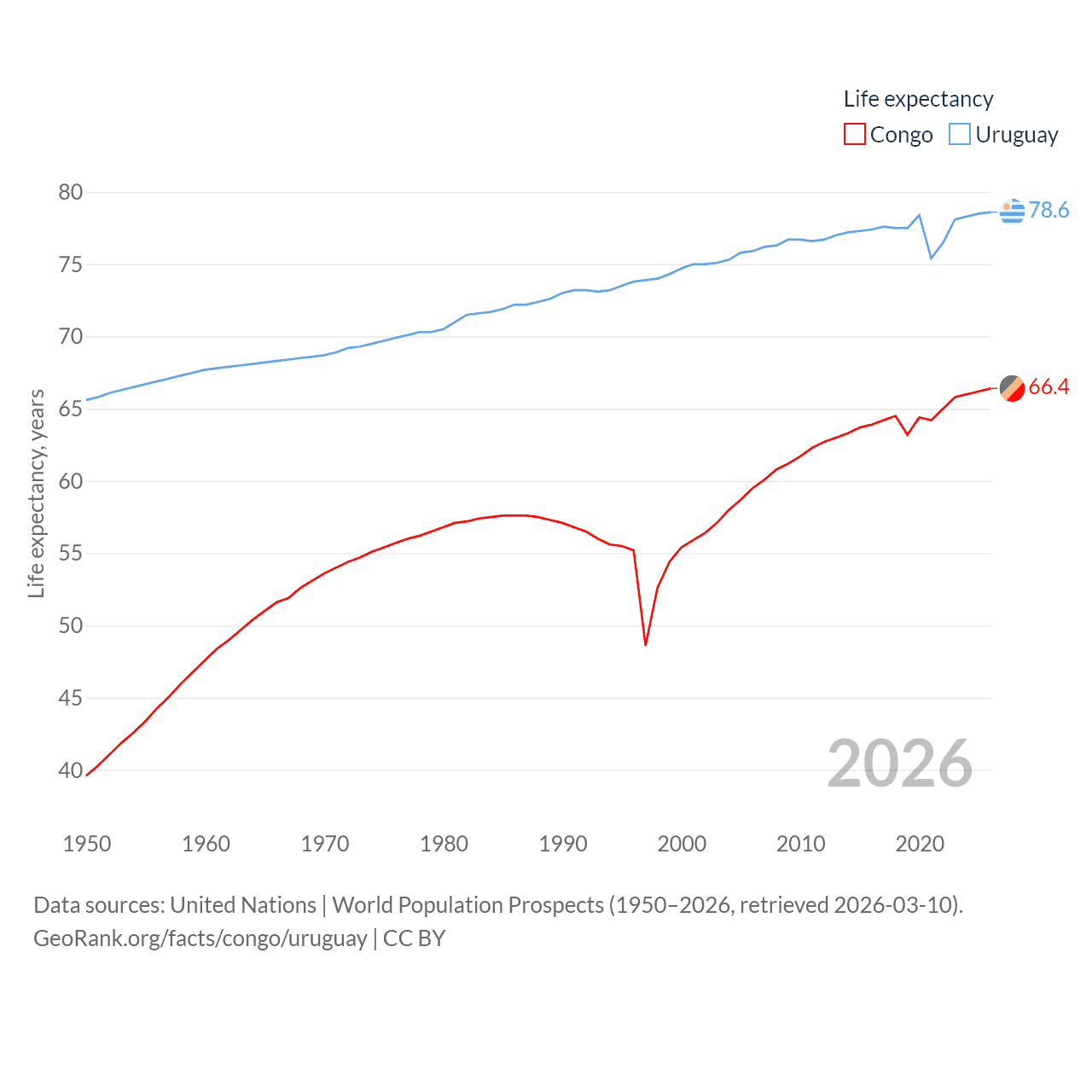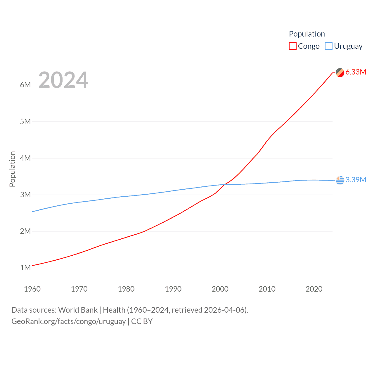 The Congo has a population of 6.33M (ranked 112/197), compared with 3.39M in Uruguay (ranked 133/197). The Congo's land area is 131,854 sq mi versus 67,576 sq mi for Uruguay (ranked 64th vs. 89th).