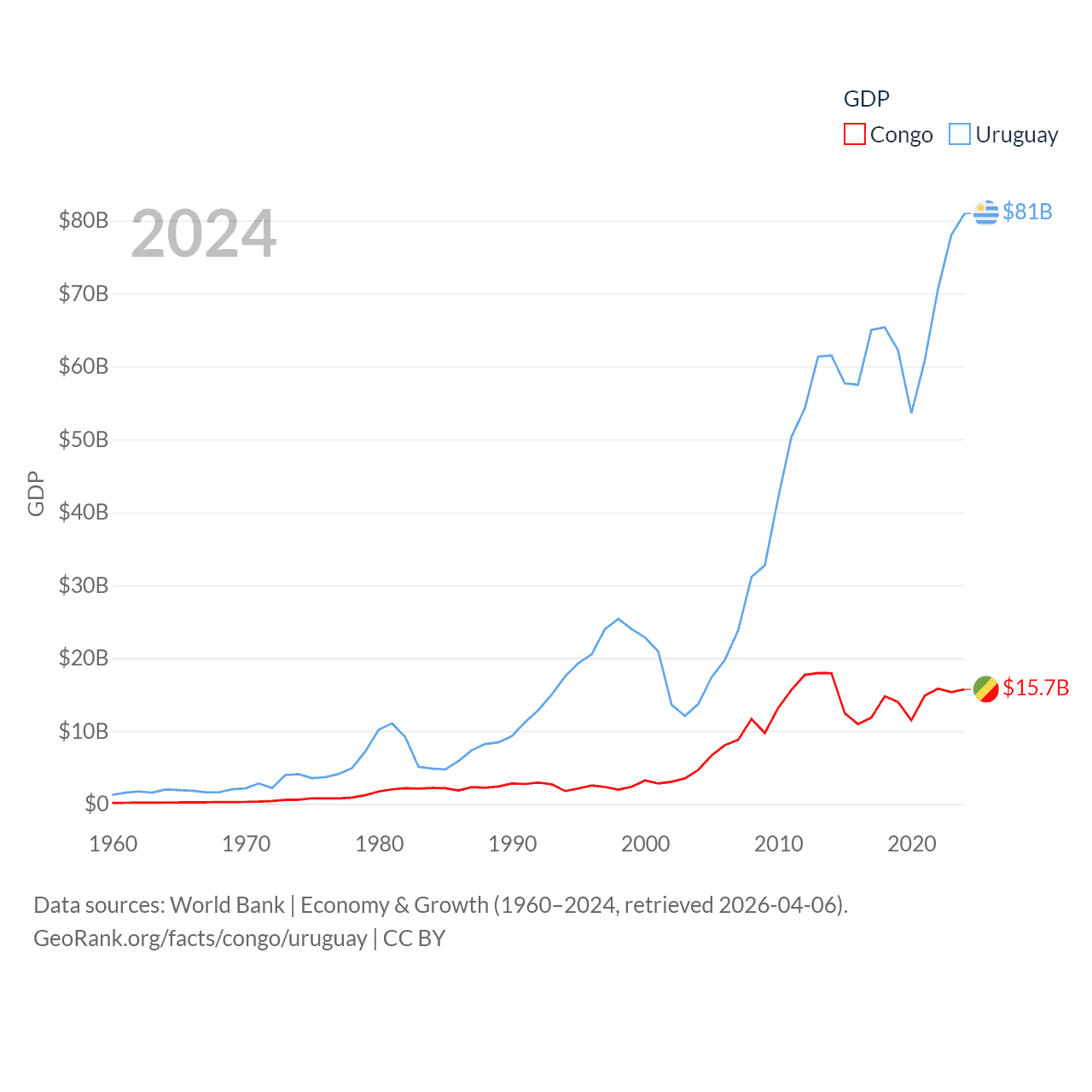 By GDP, The Congo ranks 141/197 ($15.7B) and Uruguay ranks 81/197 ($81B). By GDP per capita, The Congo ranks 149/197 ($2,482), while Uruguay ranks 52/197 ($23,907).