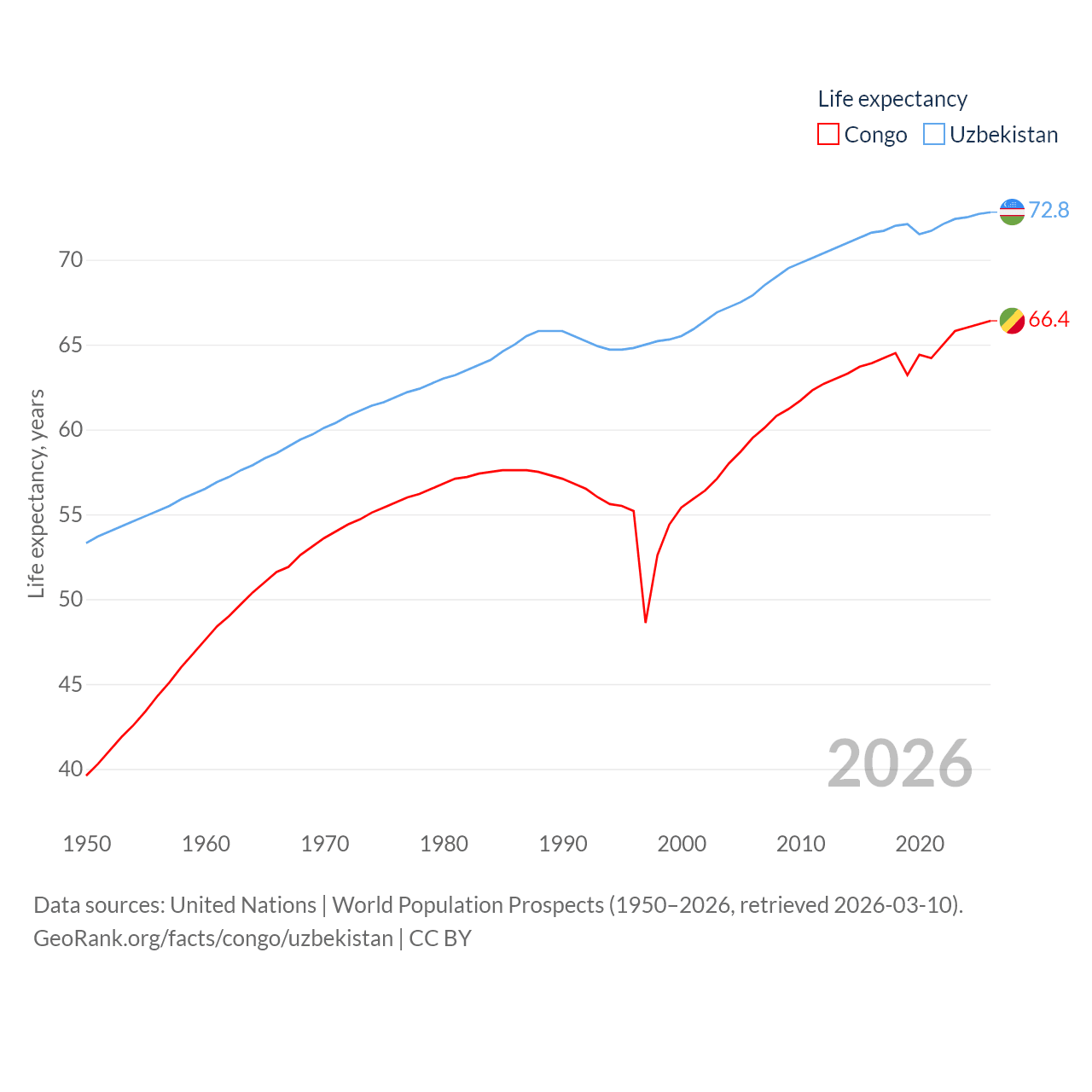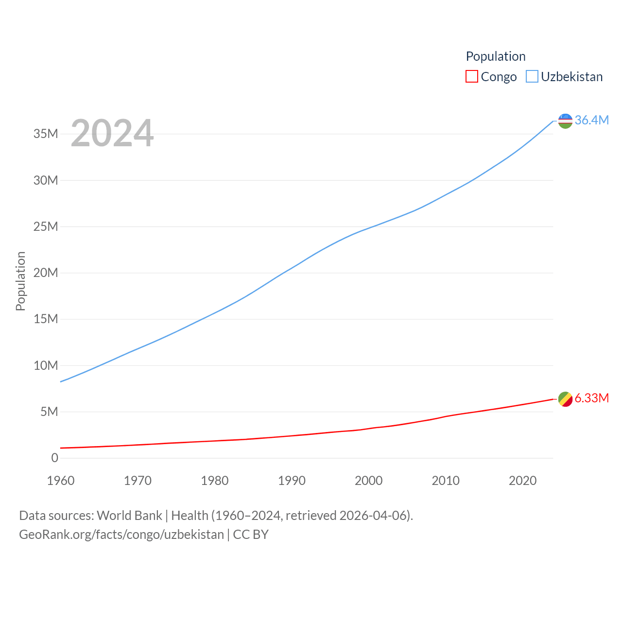 The Congo has a population of 6.33M (ranked 112/197), compared with 36.4M in Uzbekistan (ranked 43/197). The Congo's land area is 131,854 sq mi versus 170,136 sq mi for Uzbekistan (ranked 64th vs. 56th).