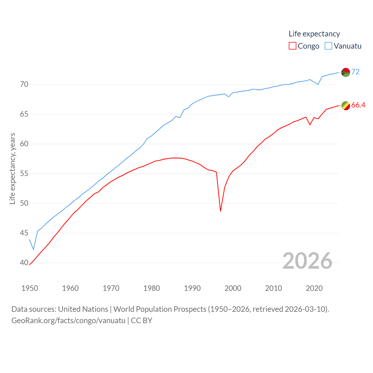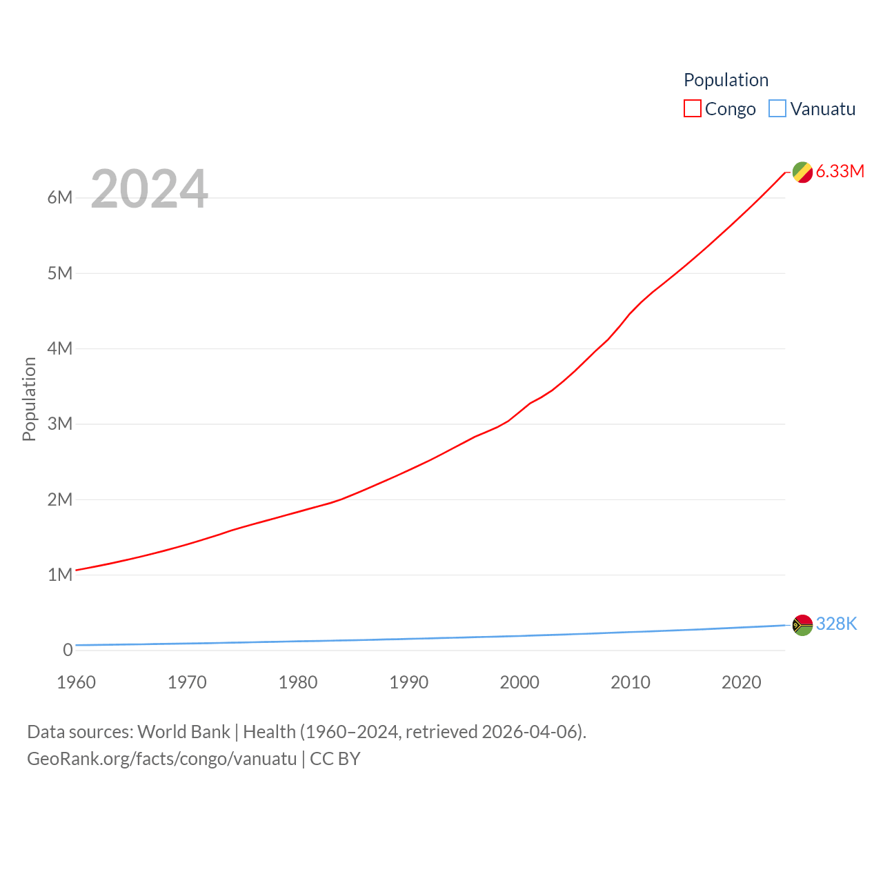 The Congo has a population of 6.33M (ranked 112/197), compared with 328K in Vanuatu (ranked 174/197). The Congo's land area is 131,854 sq mi versus 4,707 sq mi for Vanuatu (ranked 64th vs. 157th).
