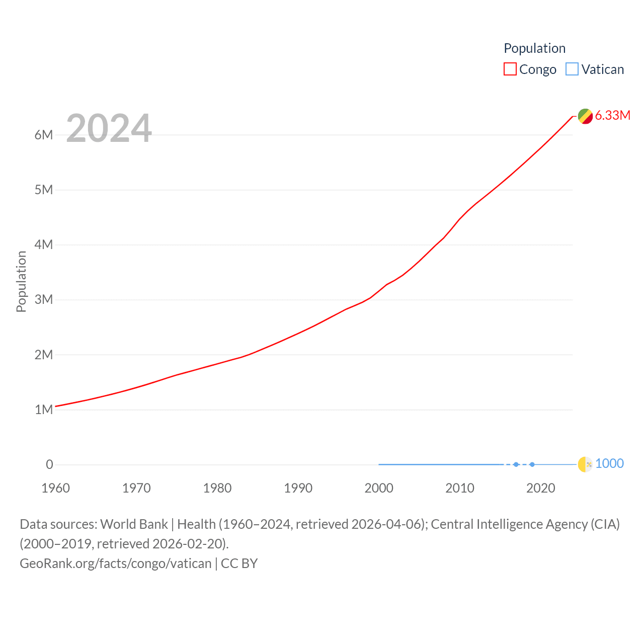 The Congo has a population of 6.33M (ranked 112/197), compared with 1K in The Vatican (ranked 197/197). The Congo's land area is 131,854 sq mi versus 0.17 sq mi for The Vatican (ranked 64th vs. 197th).