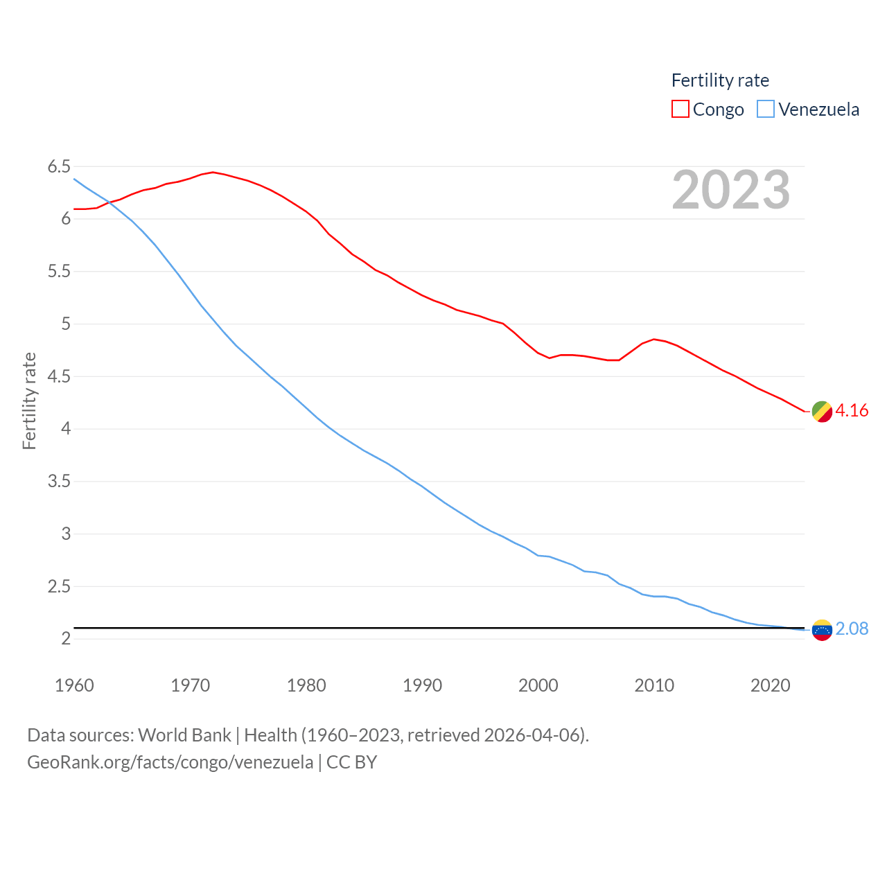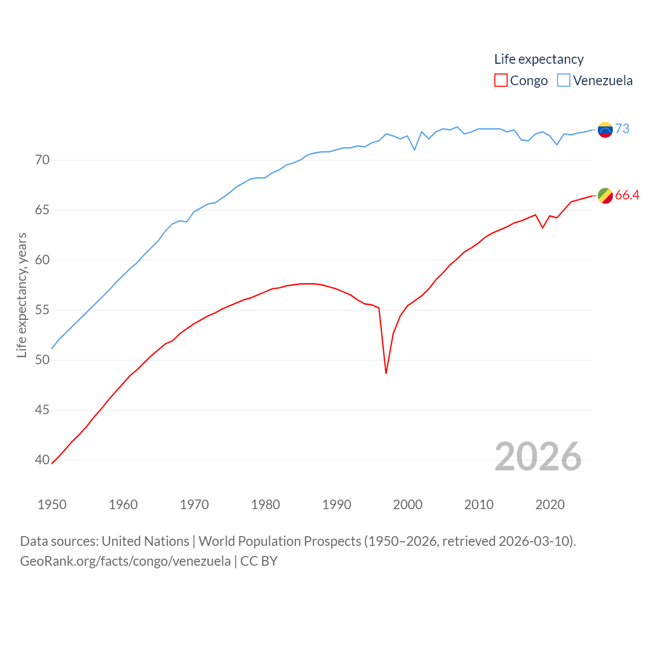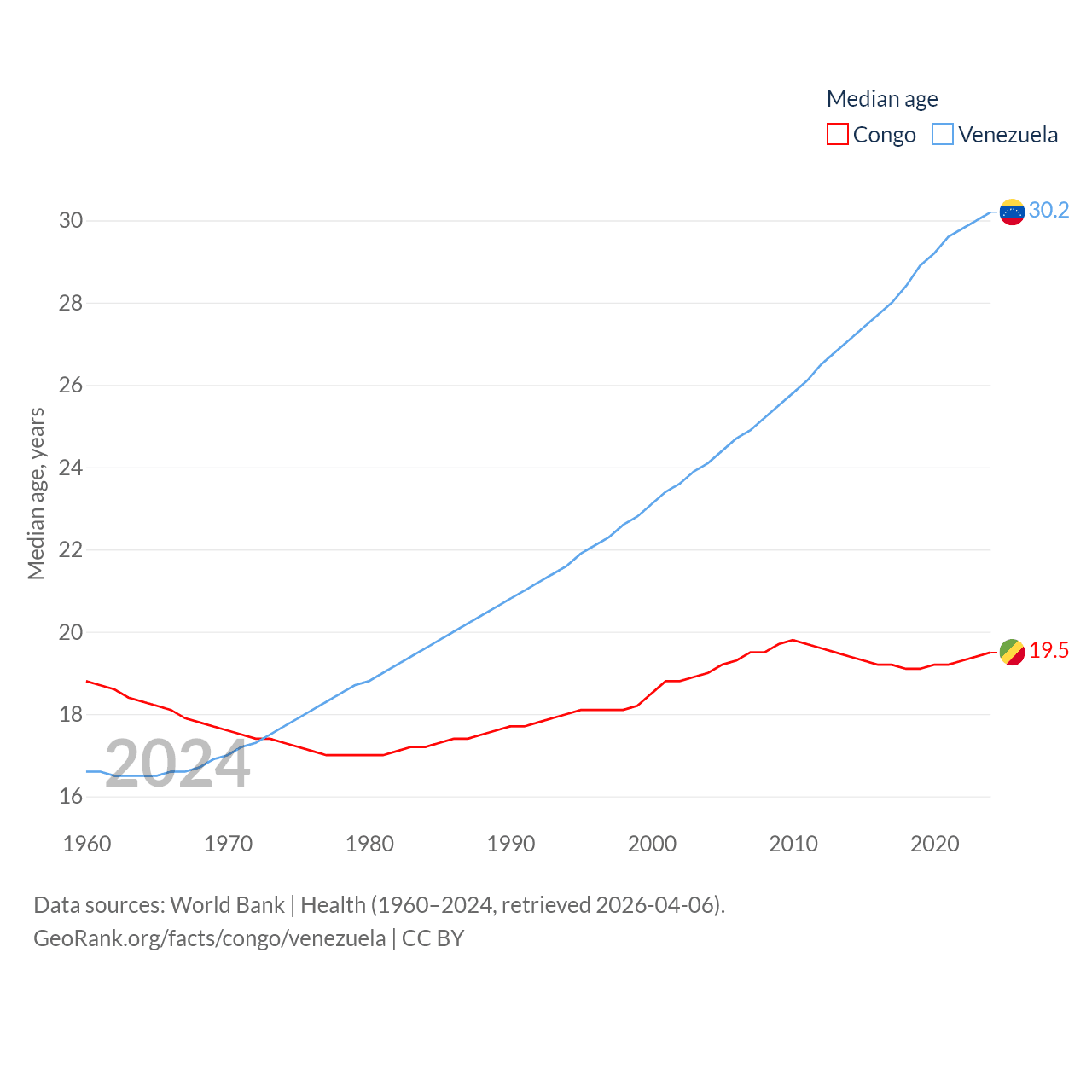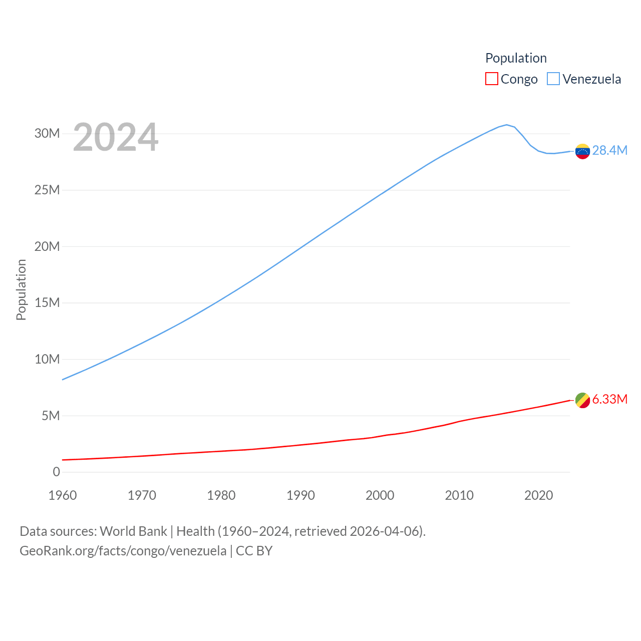 The Congo has a population of 6.33M (ranked 112/197), compared with 28.4M in Venezuela (ranked 53/197). The Congo's land area is 131,854 sq mi versus 340,561 sq mi for Venezuela (ranked 64th vs. 32nd).