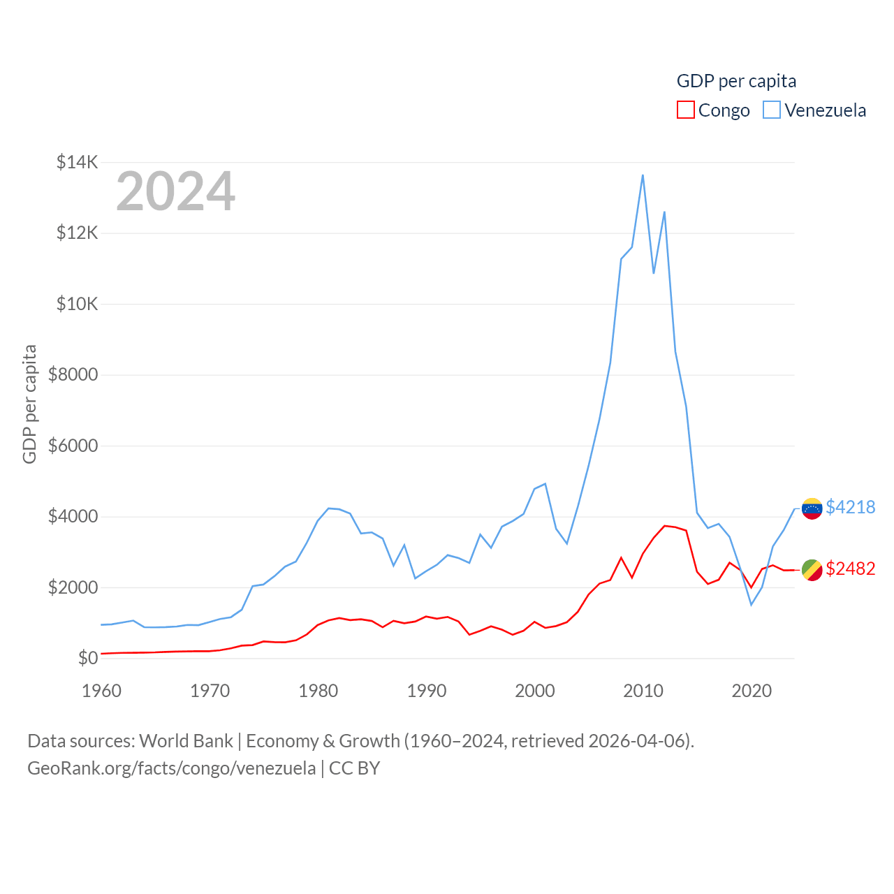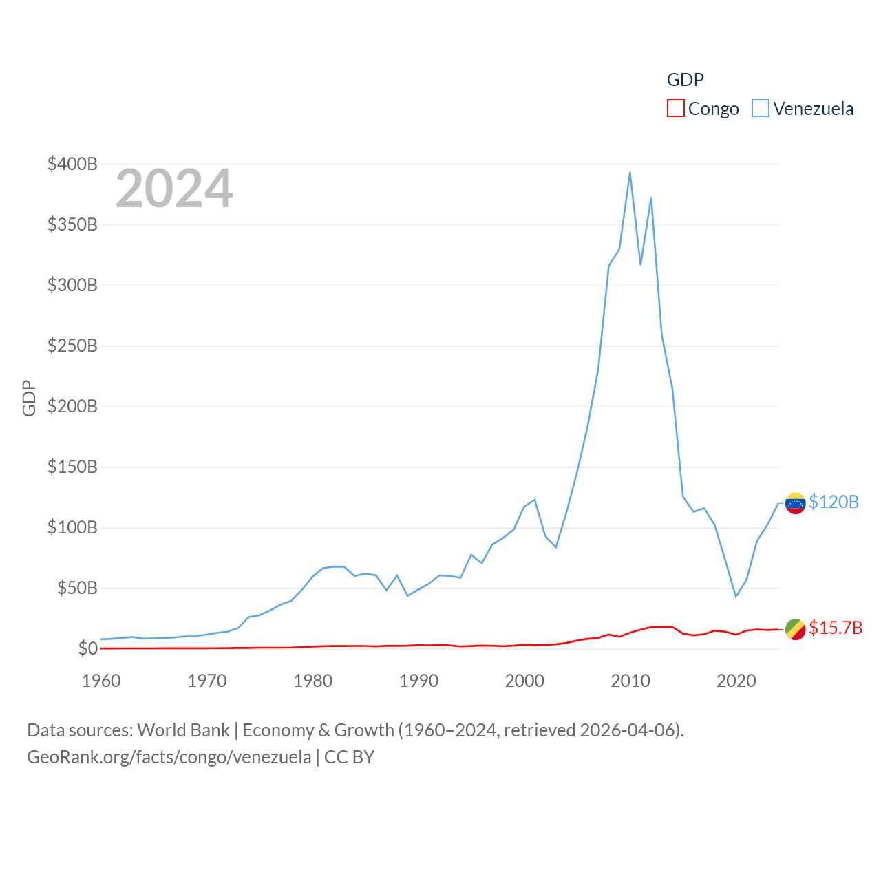 By GDP, The Congo ranks 141/197 ($15.7B) and Venezuela ranks 65/197 ($120B). By GDP per capita, The Congo ranks 149/197 ($2,482), while Venezuela ranks 128/197 ($4,218).