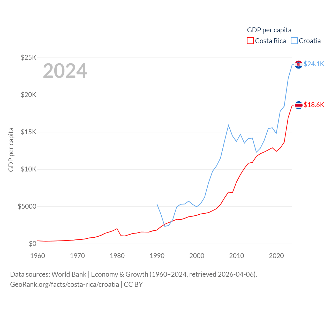 By GDP, Costa Rica ranks 73/197 ($95.4B) and Croatia ranks 75/197 ($93B). By GDP per capita, Costa Rica ranks 62/197 ($18,587), while Croatia ranks 50/197 ($24,050).