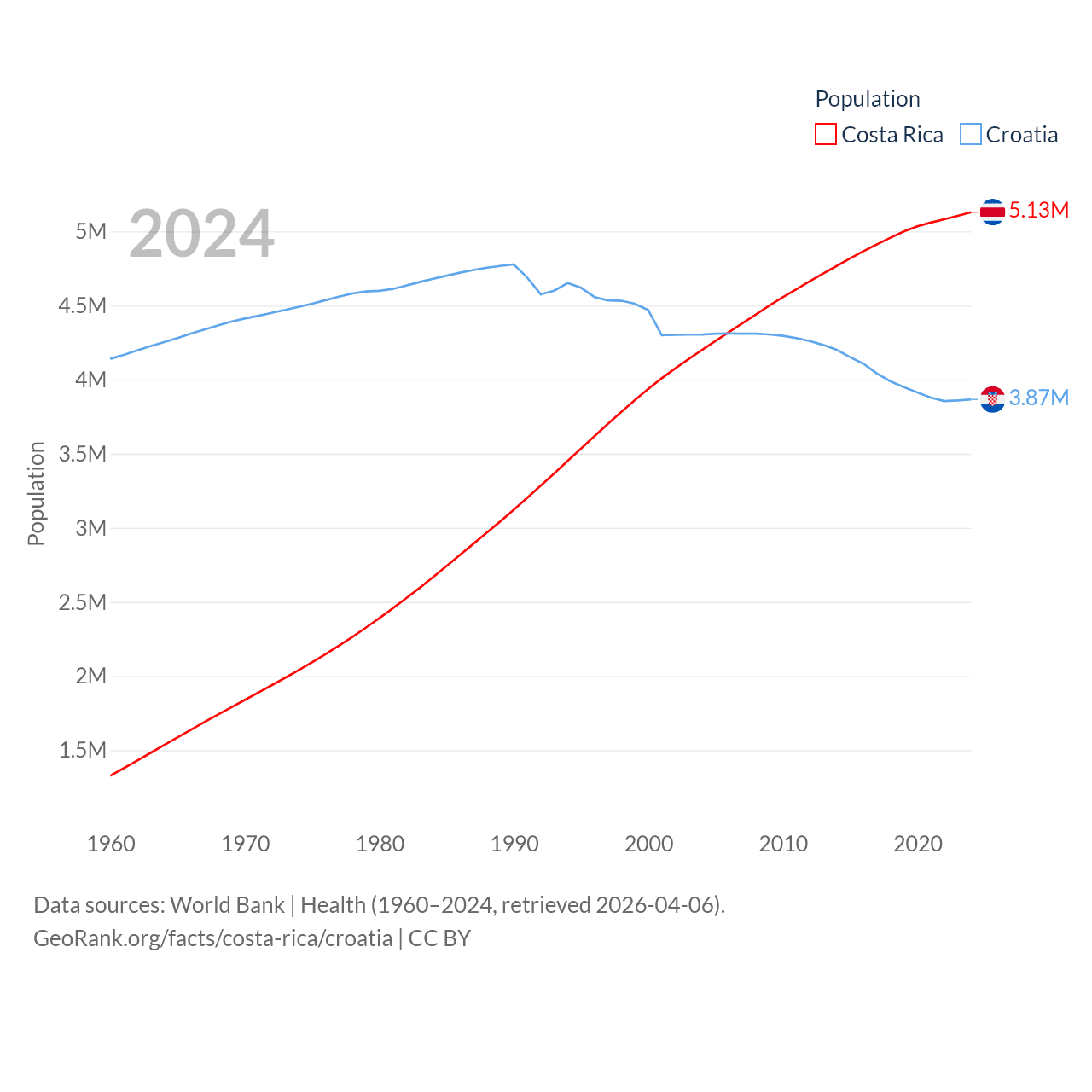 Costa Rica has a population of 5.13M (ranked 126/197), compared with 3.87M in Croatia (ranked 129/197). Costa Rica's land area is 19,714 sq mi versus 21,606 sq mi for Croatia (ranked 126th vs. 123rd).