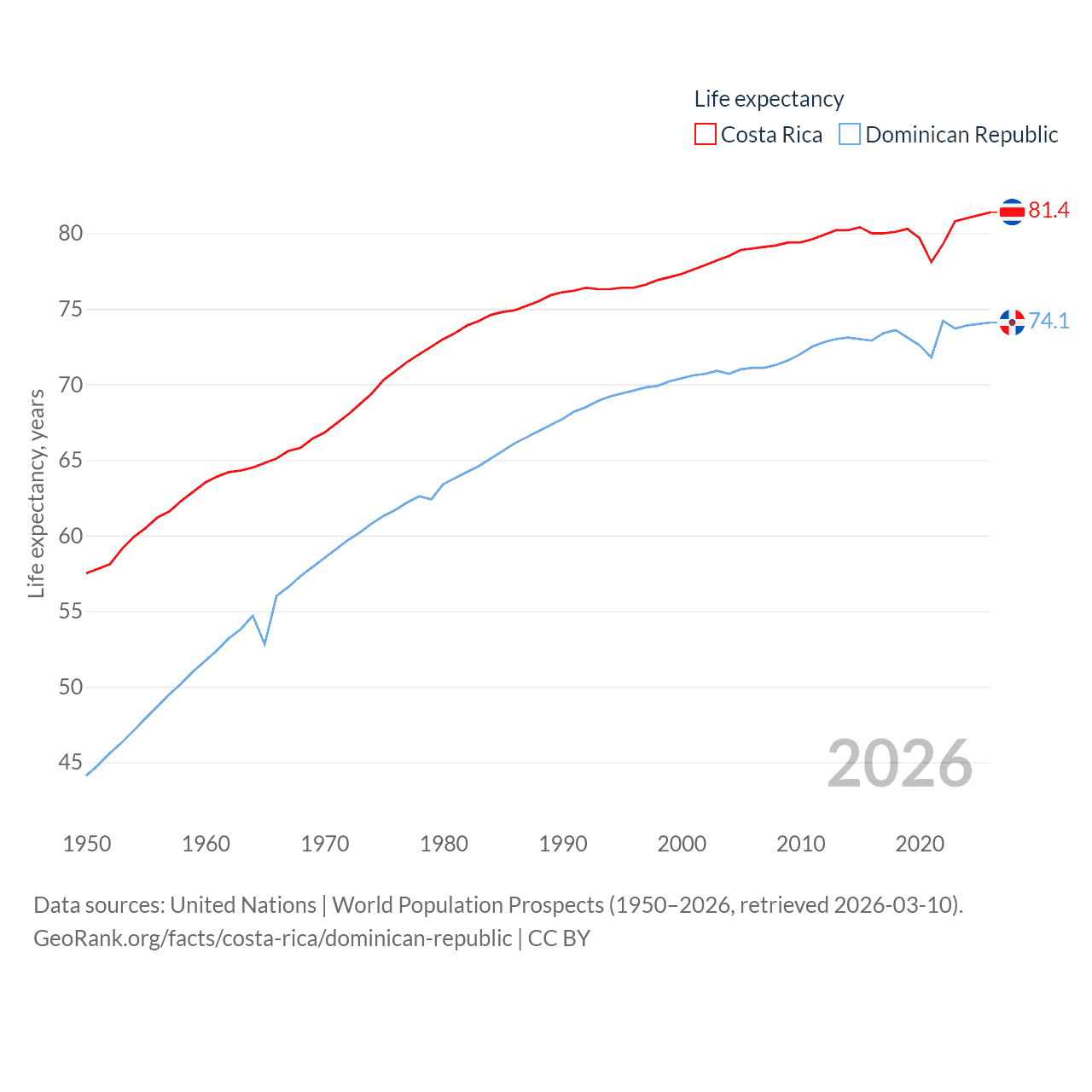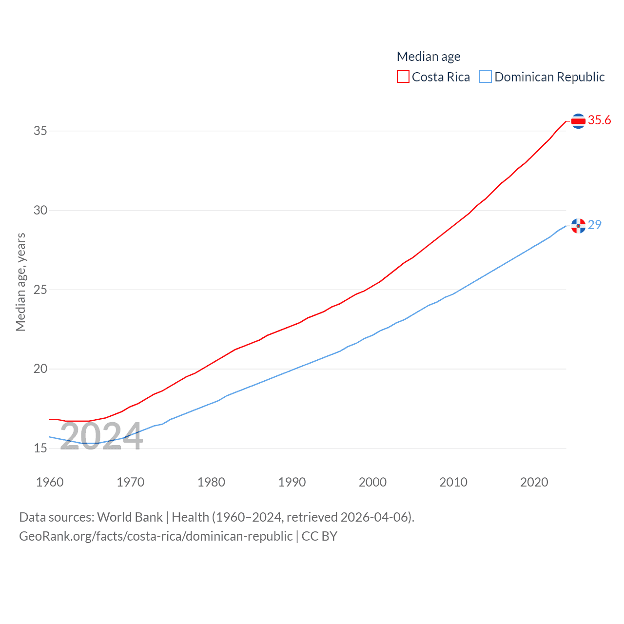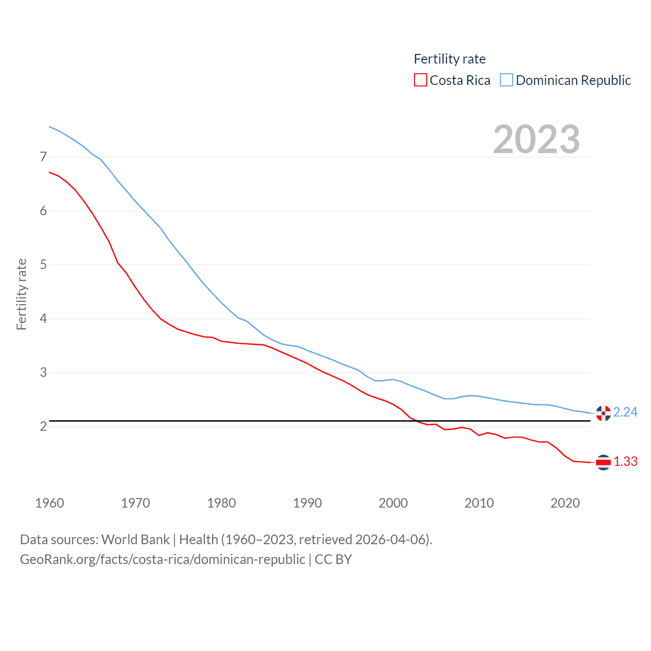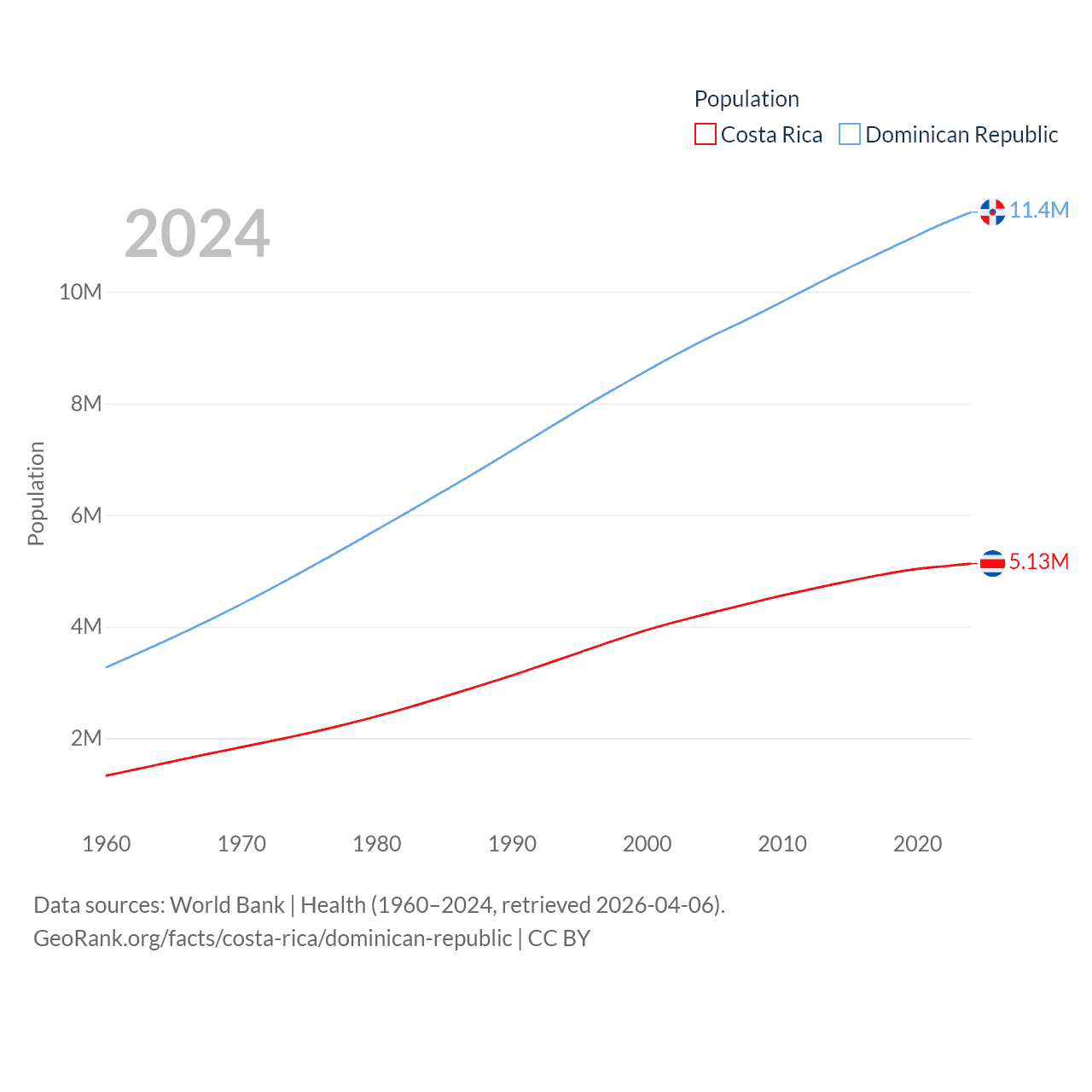 Costa Rica has a population of 5.13M (ranked 126/197), compared with 11.4M in The Dominican Republic (ranked 85/197). Costa Rica's land area is 19,714 sq mi versus 18,609 sq mi for The Dominican Republic (ranked 126th vs. 127th).
