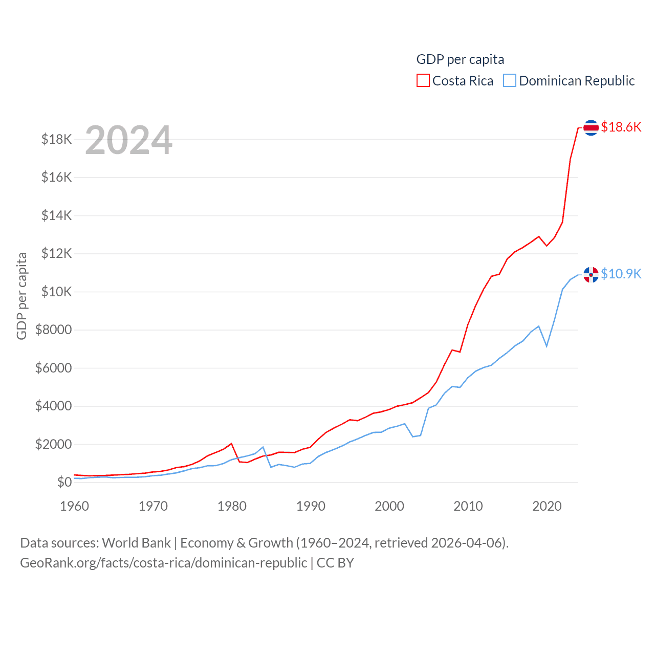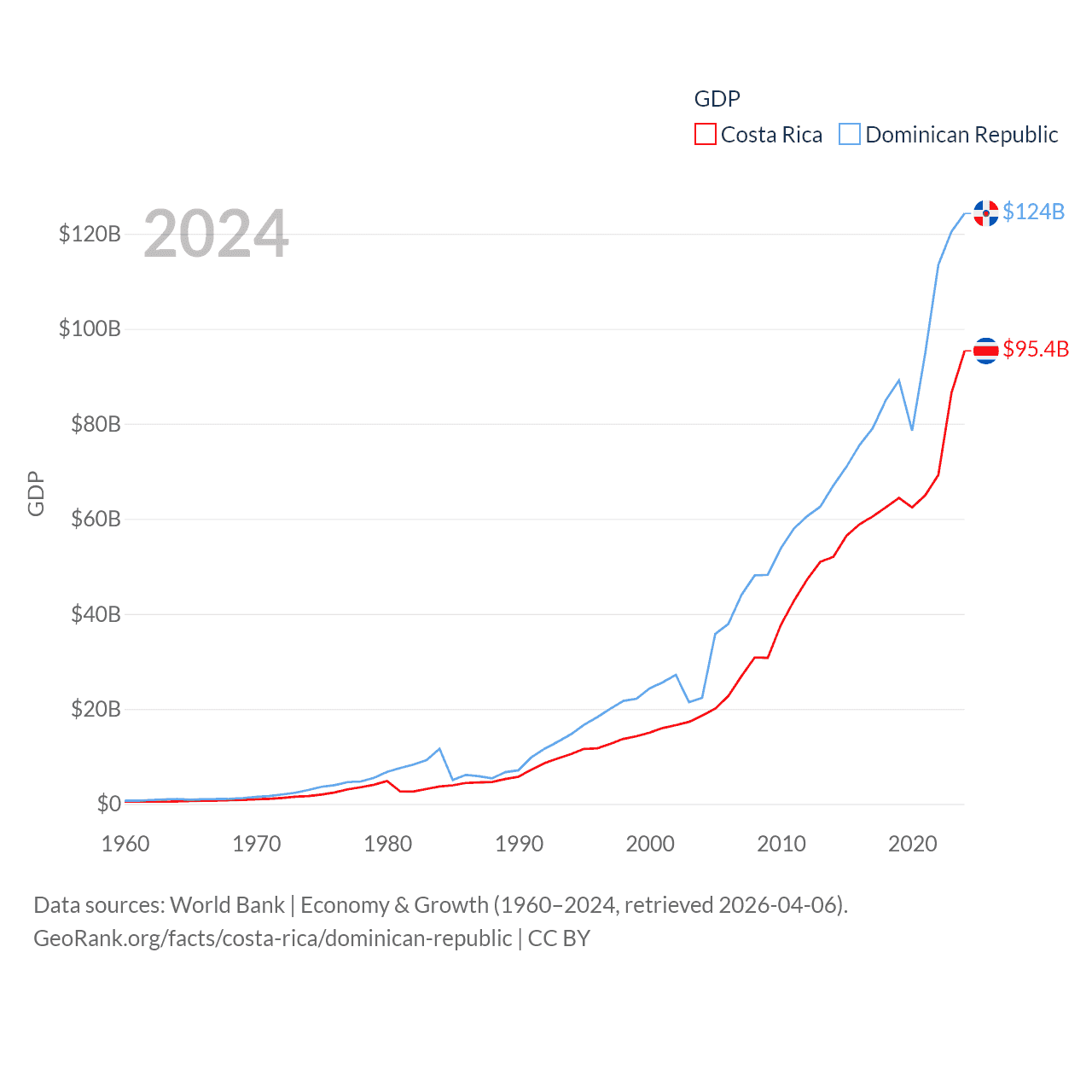By GDP, Costa Rica ranks 73/197 ($95.4B) and The Dominican Republic ranks 63/197 ($124B). By GDP per capita, Costa Rica ranks 62/197 ($18,587), while The Dominican Republic ranks 83/197 ($10,876).