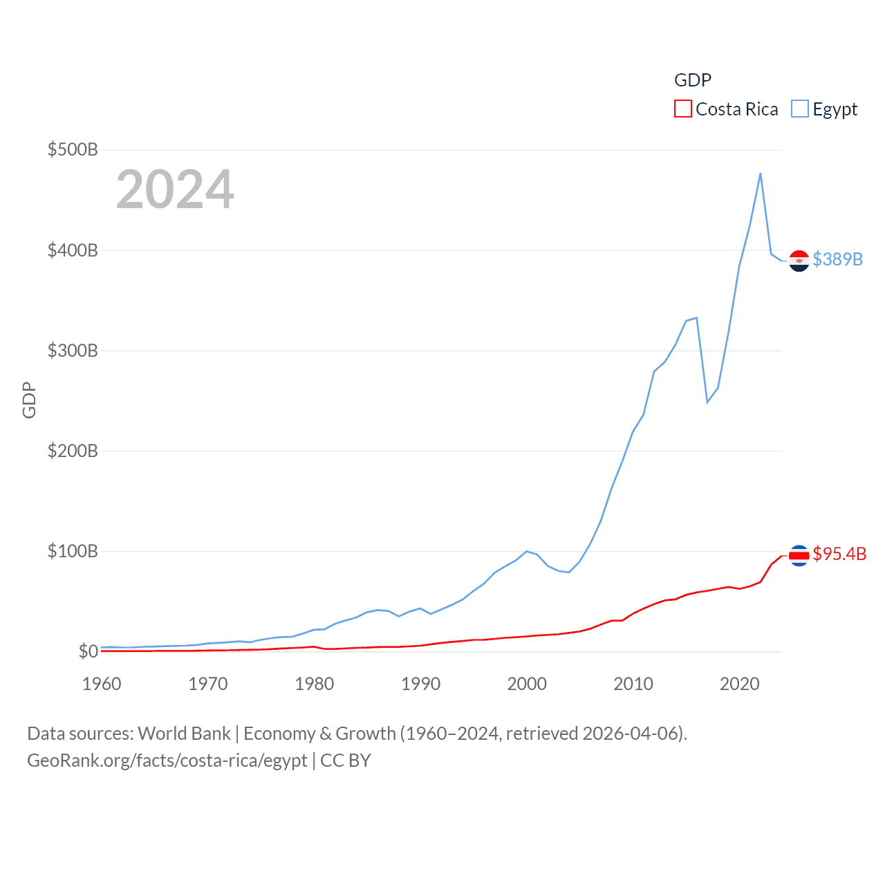 By GDP, Costa Rica ranks 73/197 ($95.4B) and Egypt ranks 41/197 ($389B). By GDP per capita, Costa Rica ranks 62/197 ($18,587), while Egypt ranks 138/197 ($3,338).