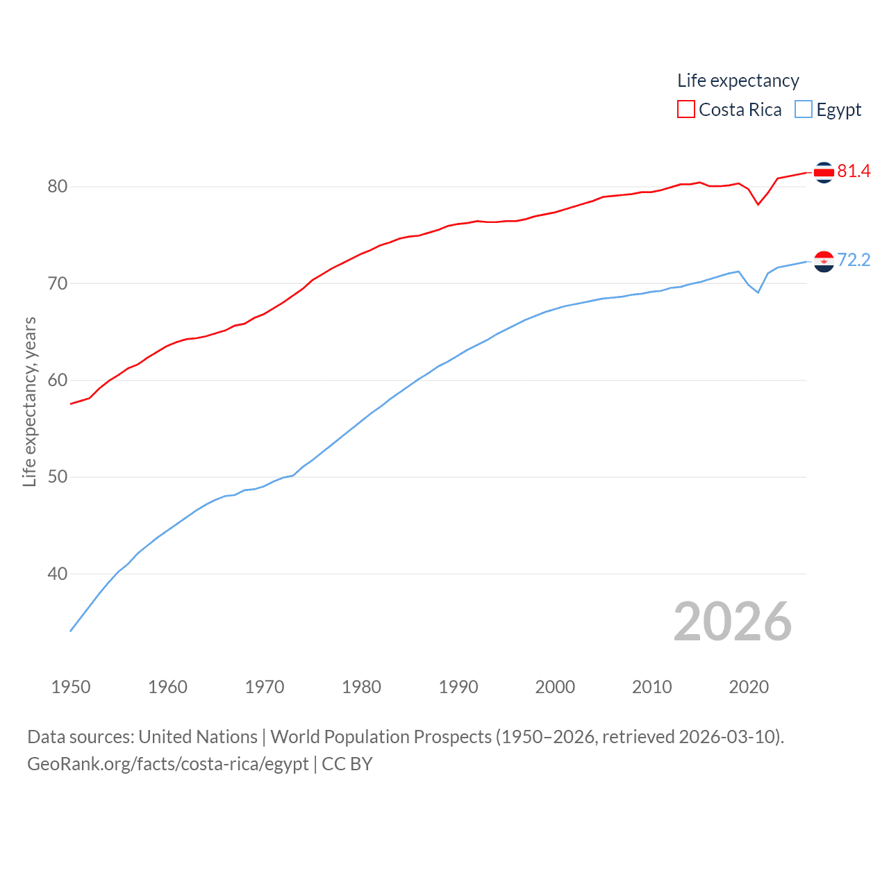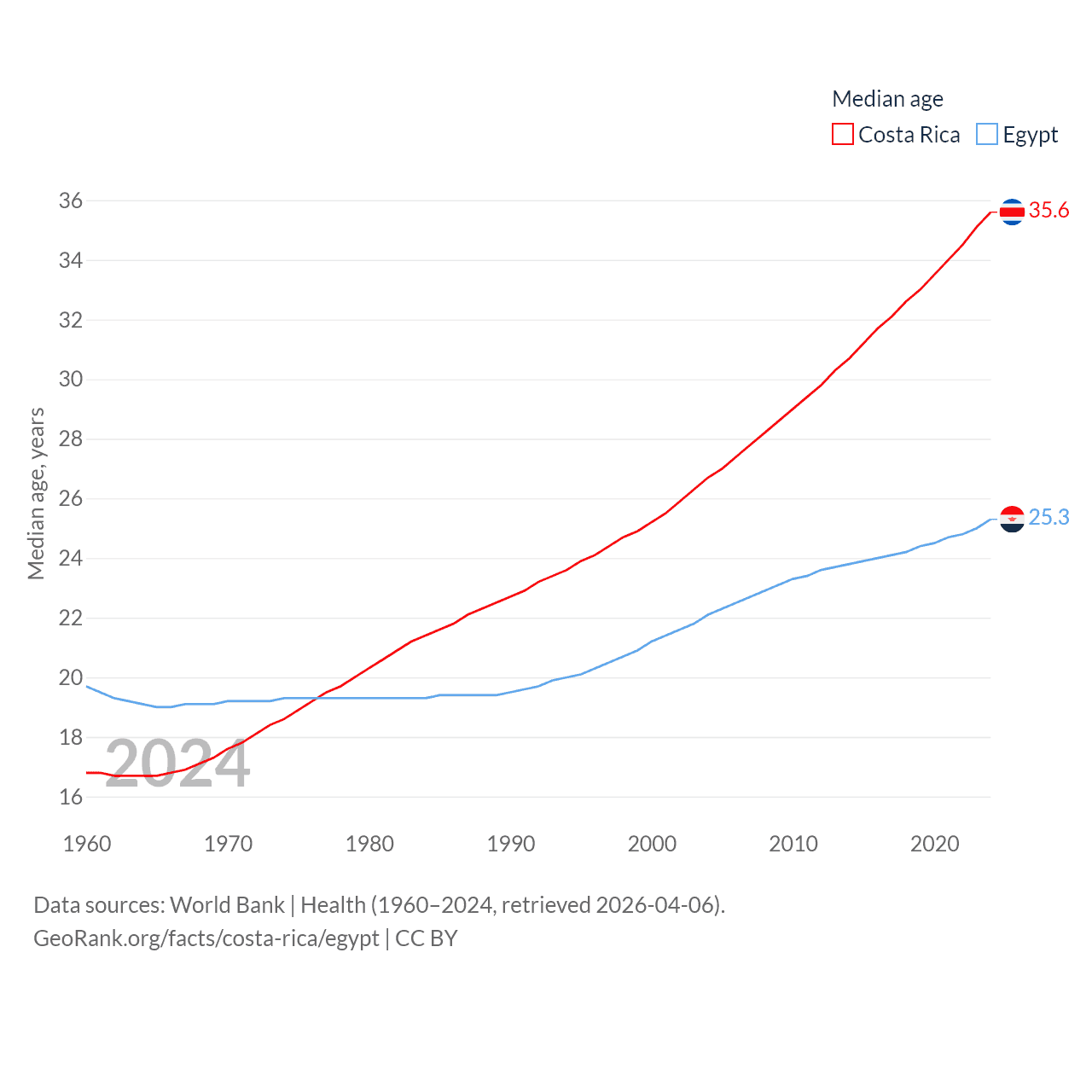 Costa Rica has a population of 5.13M (ranked 126/197), compared with 117M in Egypt (ranked 13/197). Costa Rica's land area is 19,714 sq mi versus 384,345 sq mi for Egypt (ranked 126th vs. 29th).