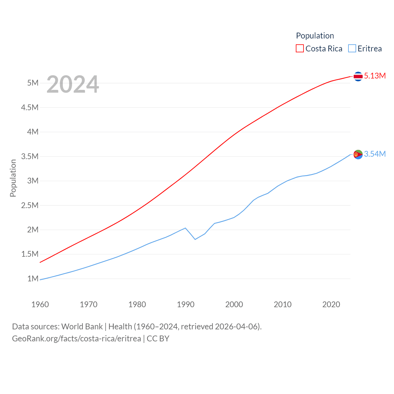 Costa Rica has a population of 5.13M (ranked 126/197), compared with 3.54M in Eritrea (ranked 131/197). Costa Rica's land area is 19,714 sq mi versus 46,787 sq mi for Eritrea (ranked 126th vs. 96th).