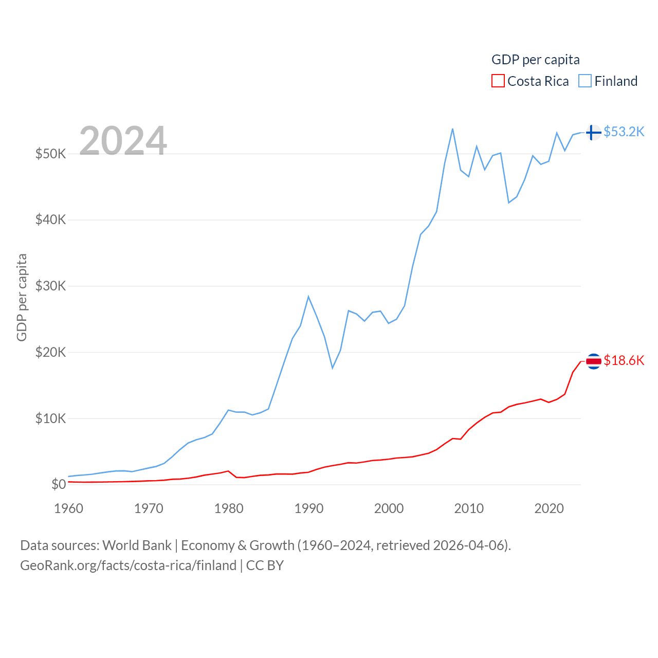 By GDP, Costa Rica ranks 73/197 ($95.4B) and Finland ranks 47/197 ($299B). By GDP per capita, Costa Rica ranks 62/197 ($18,587), while Finland ranks 23/197 ($53,150).