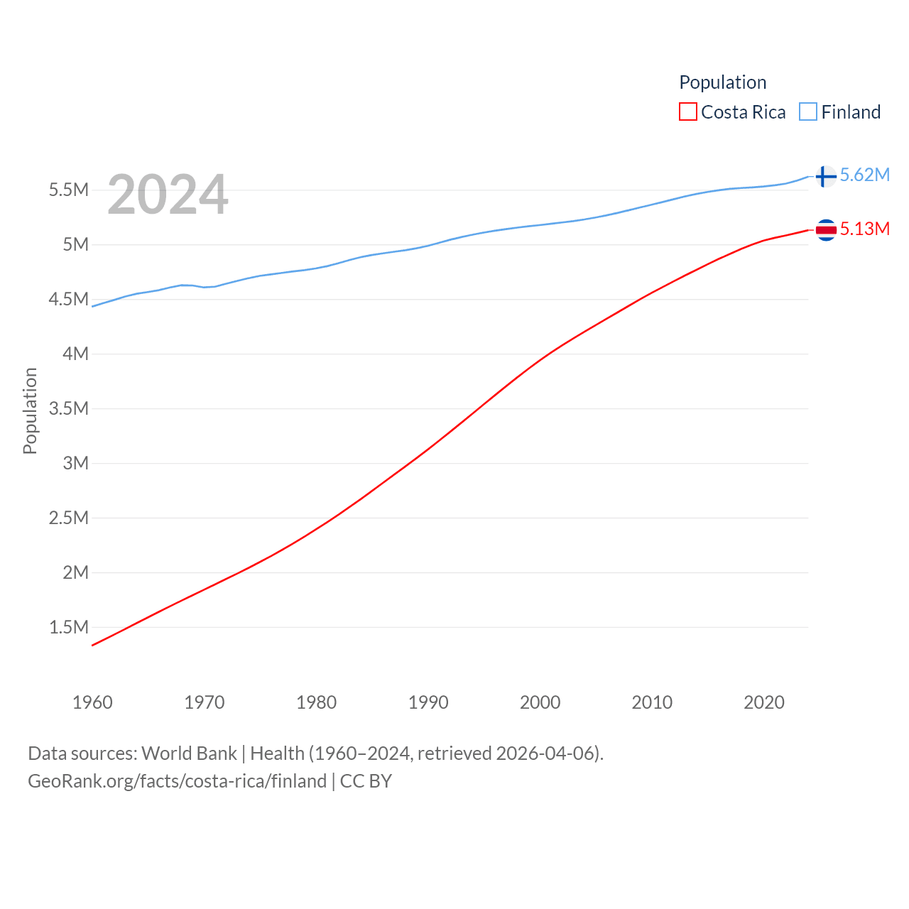 Costa Rica has a population of 5.13M (ranked 126/197), compared with 5.62M in Finland (ranked 116/197). Costa Rica's land area is 19,714 sq mi versus 117,360 sq mi for Finland (ranked 126th vs. 70th).