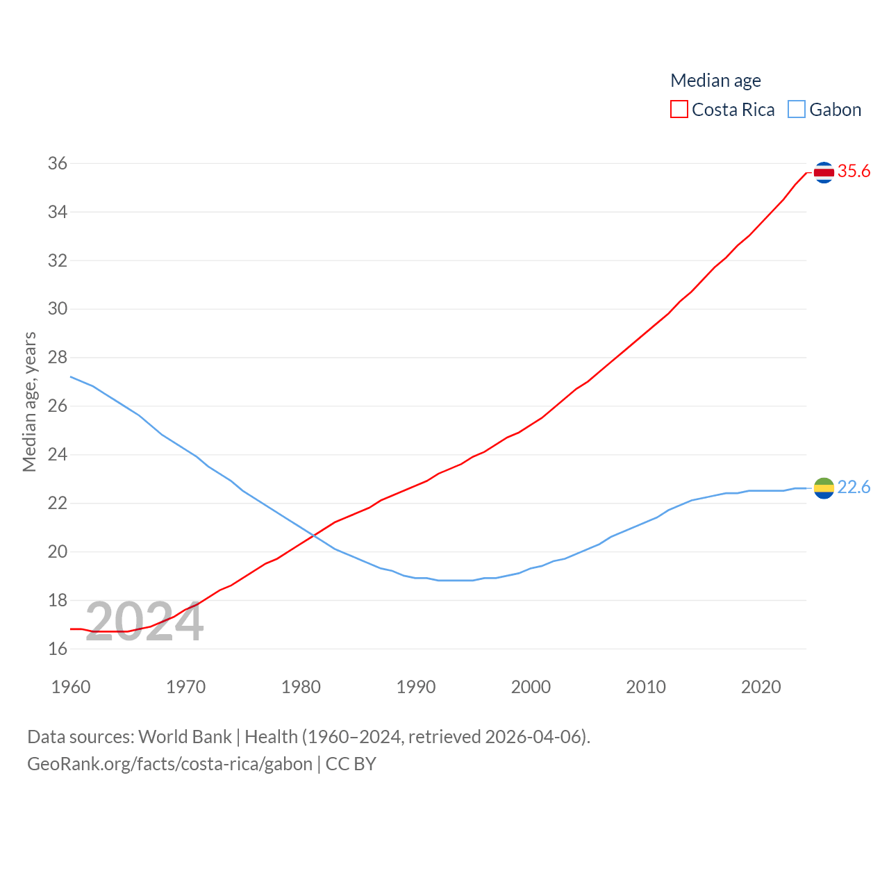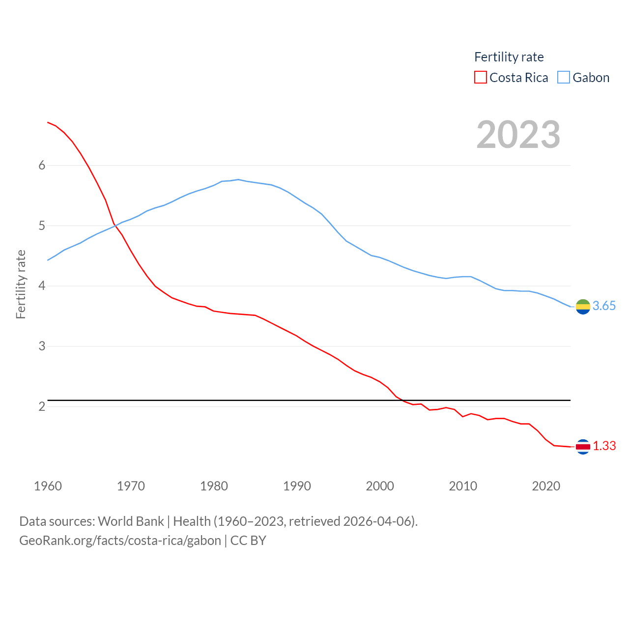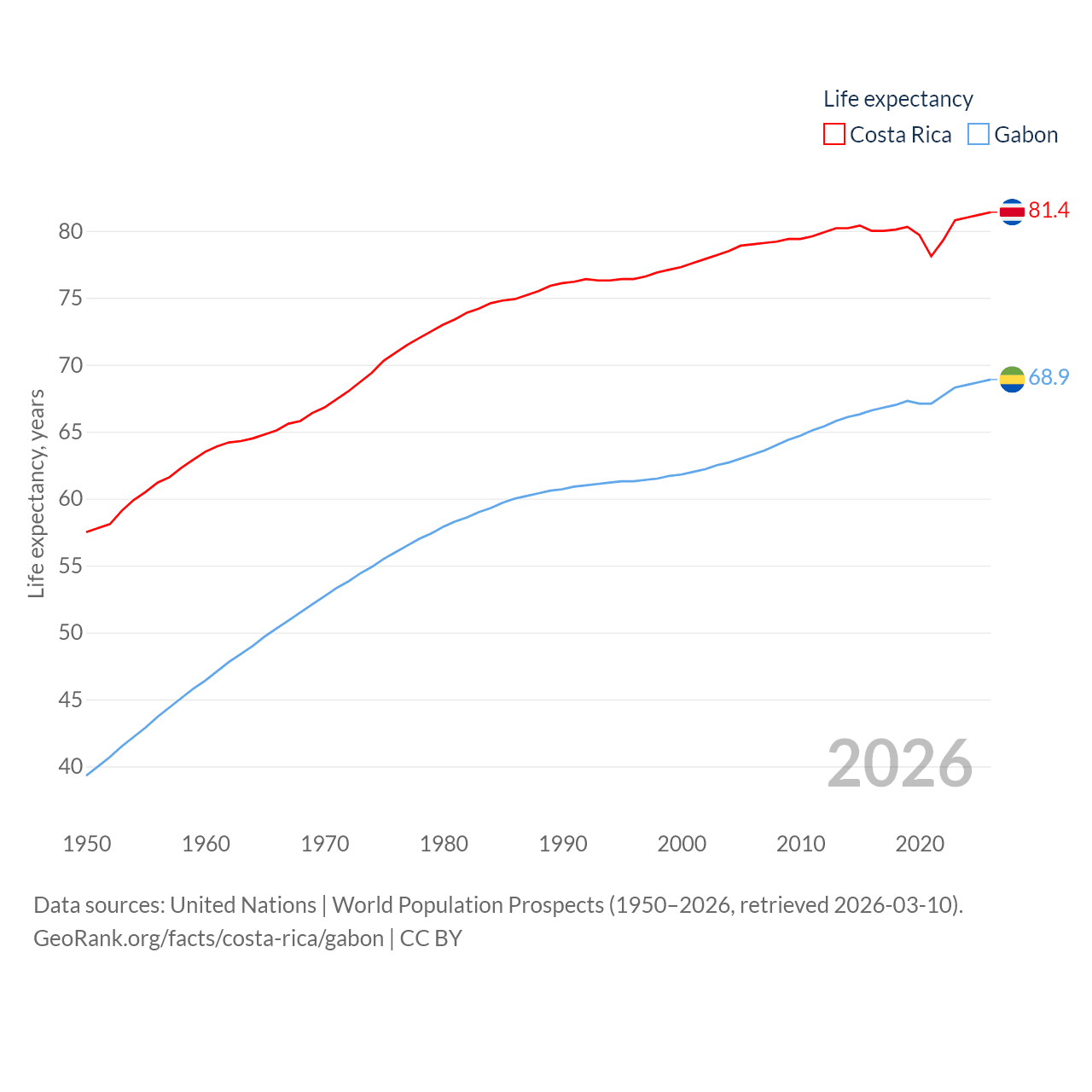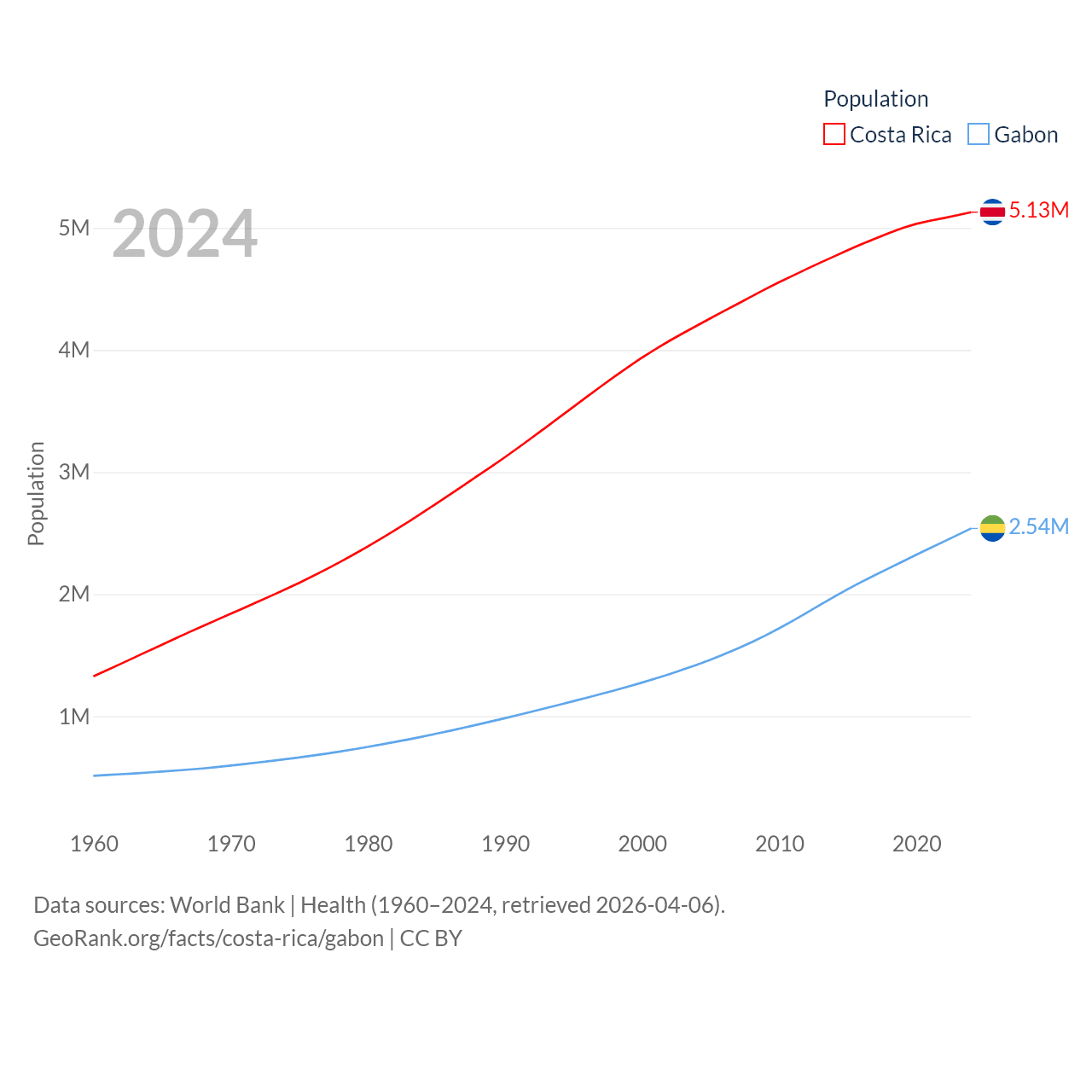 Costa Rica has a population of 5.13M (ranked 126/197), compared with 2.54M in Gabon (ranked 141/197). Costa Rica's land area is 19,714 sq mi versus 99,487 sq mi for Gabon (ranked 126th vs. 75th).