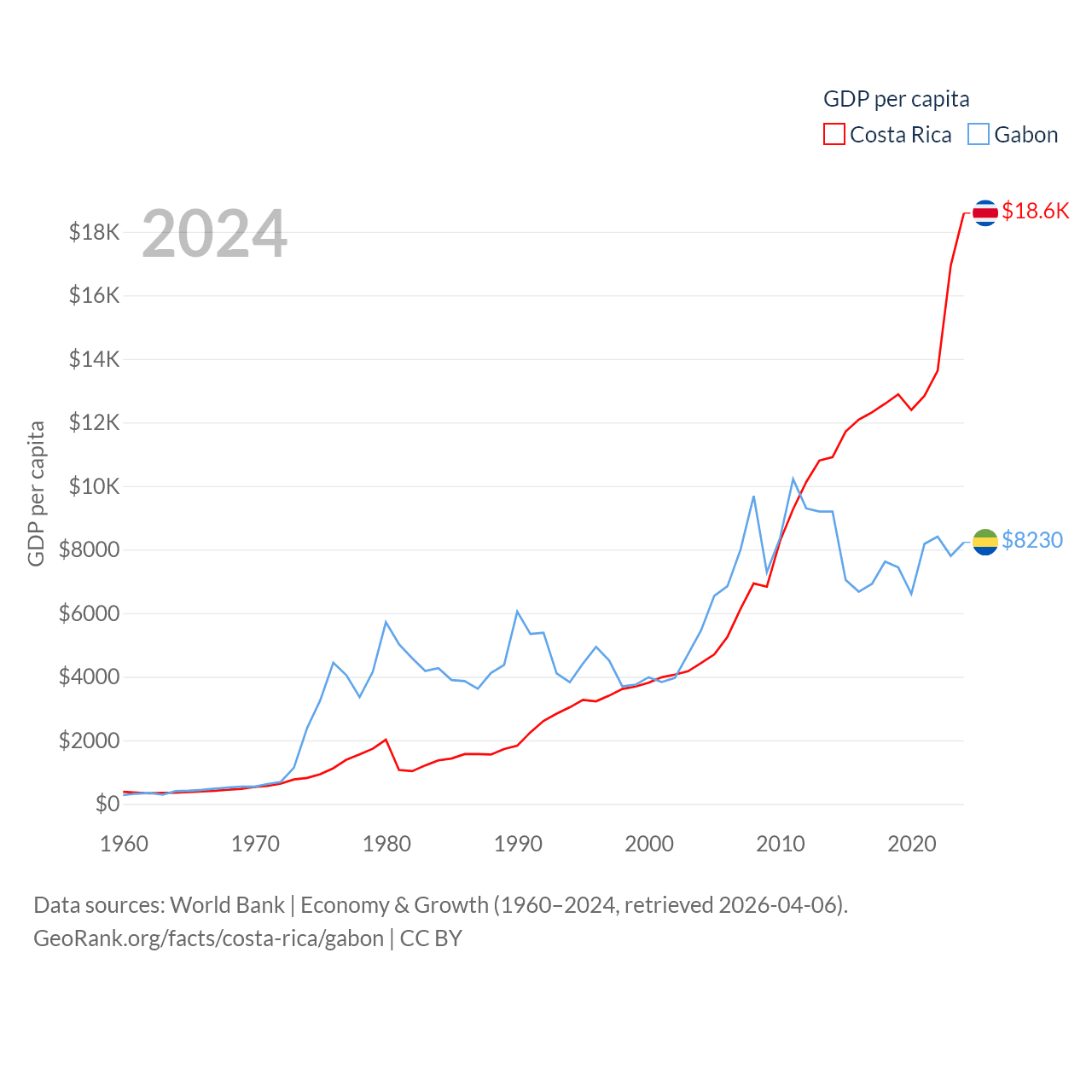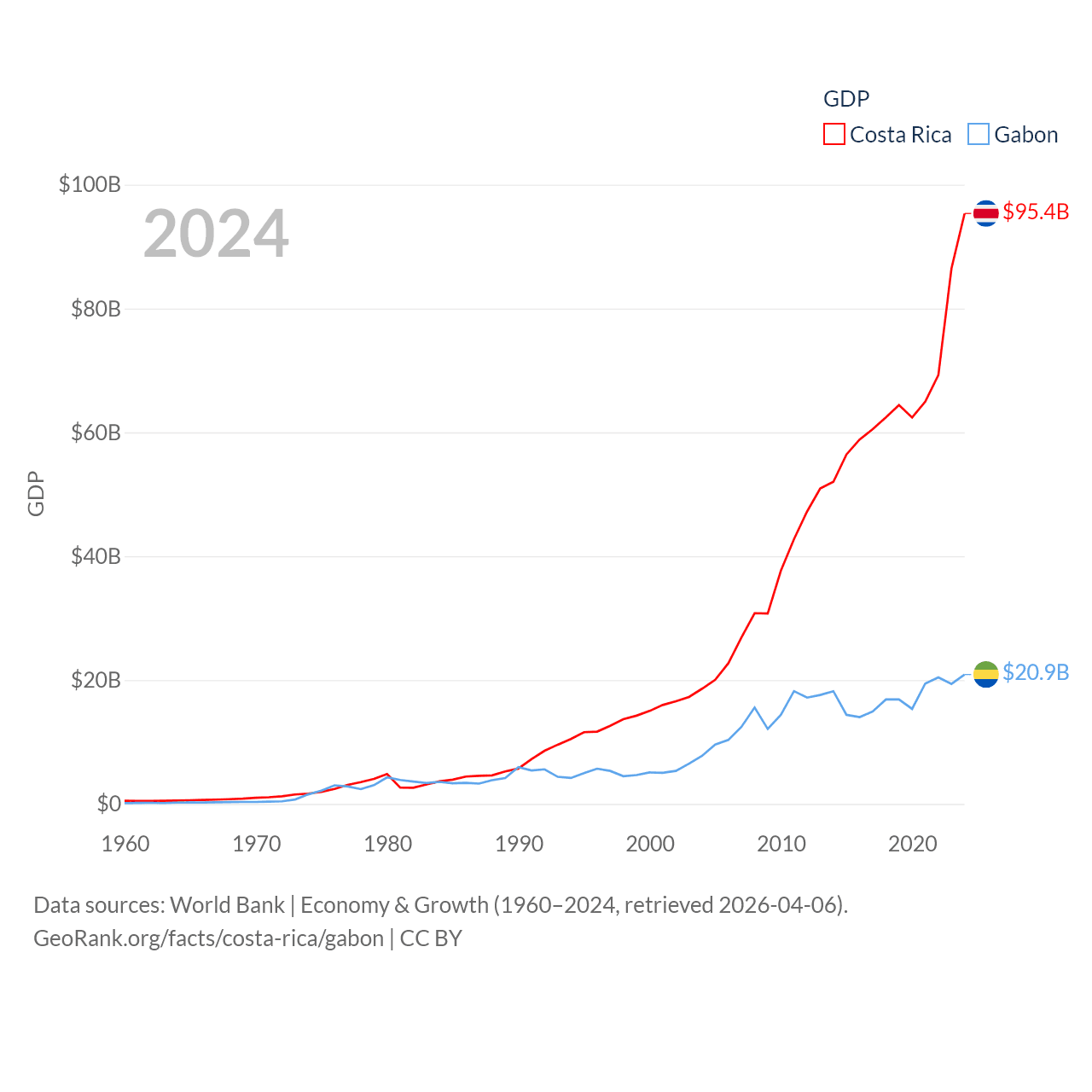 By GDP, Costa Rica ranks 73/197 ($95.4B) and Gabon ranks 127/197 ($20.9B). By GDP per capita, Costa Rica ranks 62/197 ($18,587), while Gabon ranks 93/197 ($8,230).