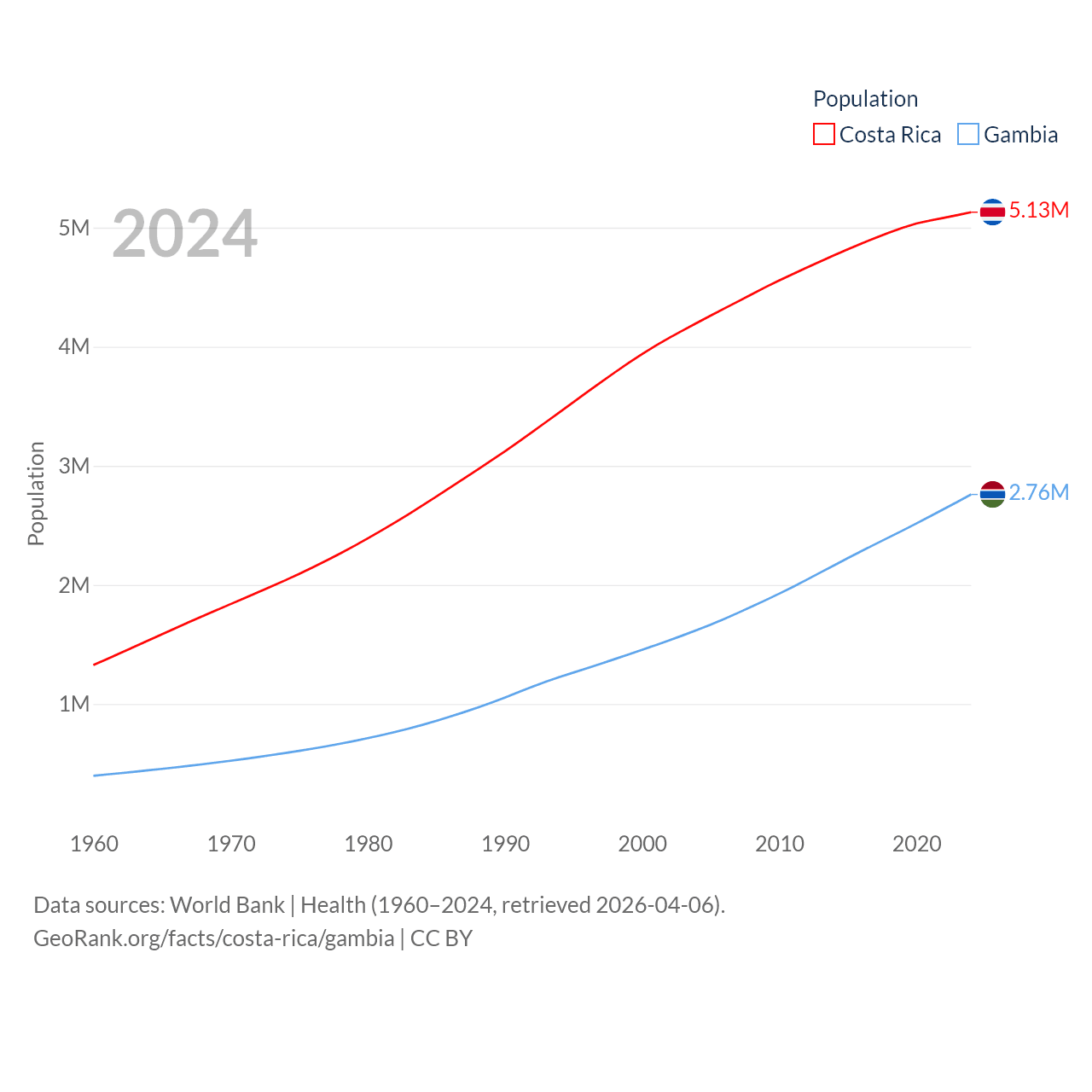 Costa Rica has a population of 5.13M (ranked 126/197), compared with 2.76M in The Gambia (ranked 140/197). Costa Rica's land area is 19,714 sq mi versus 3,907 sq mi for The Gambia (ranked 126th vs. 161st).