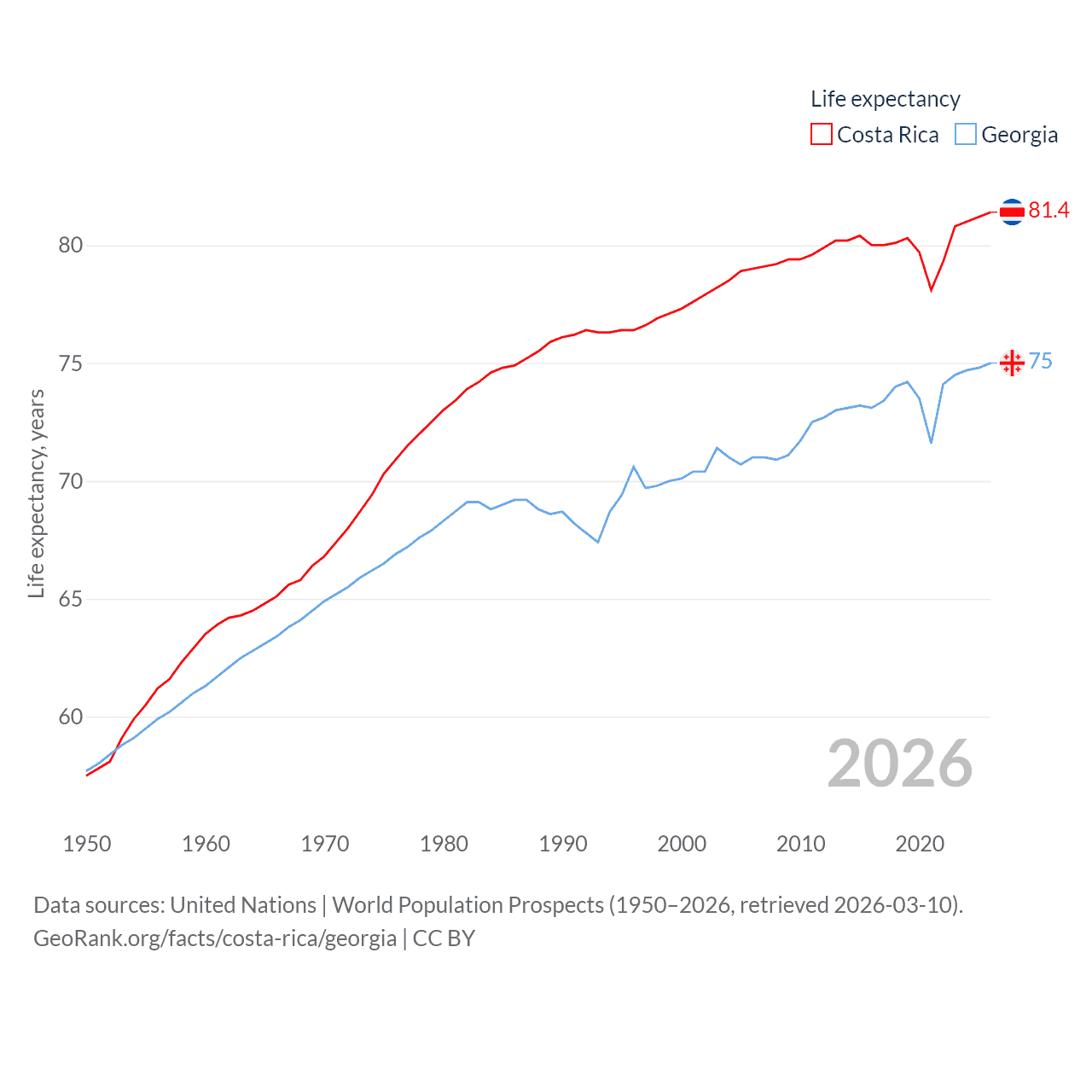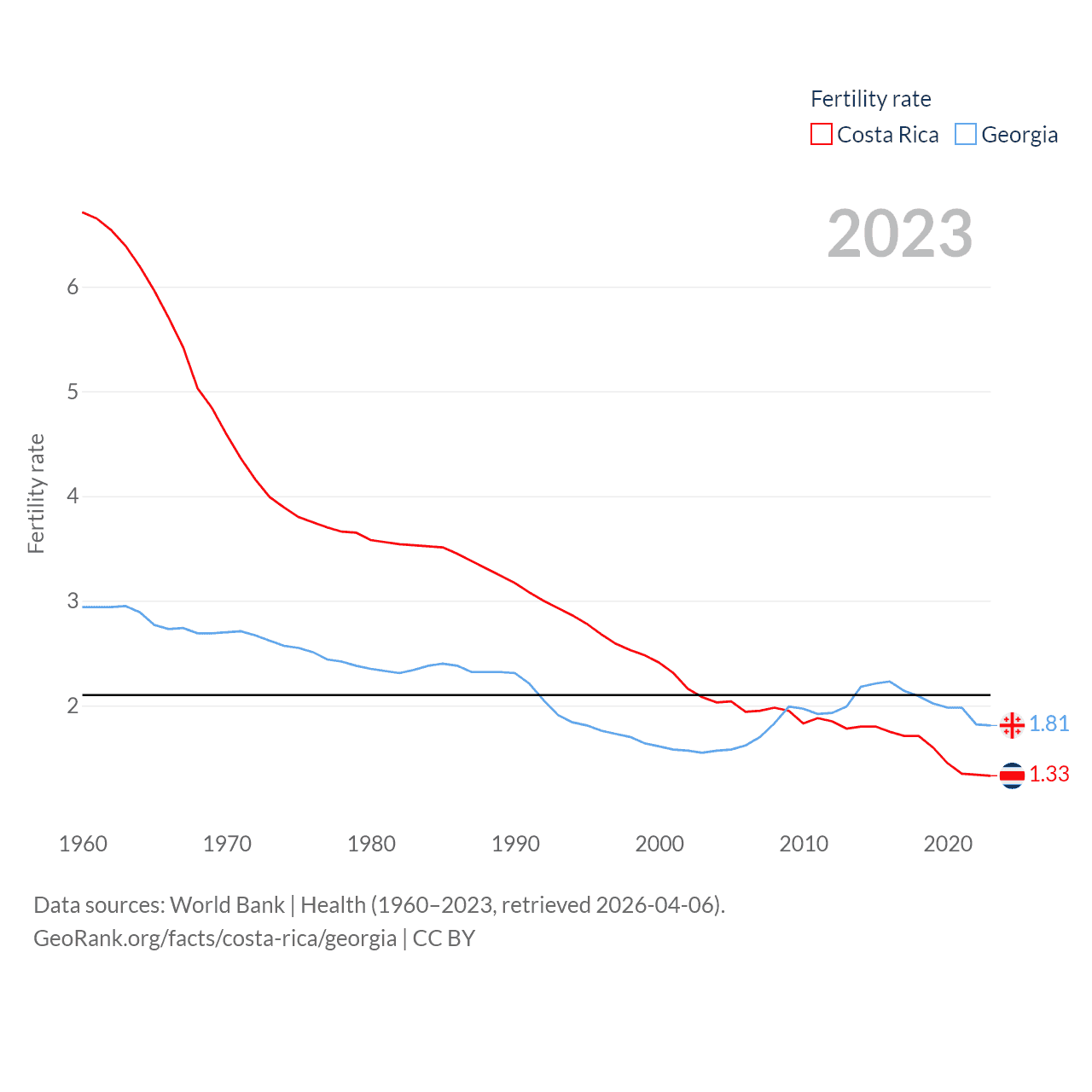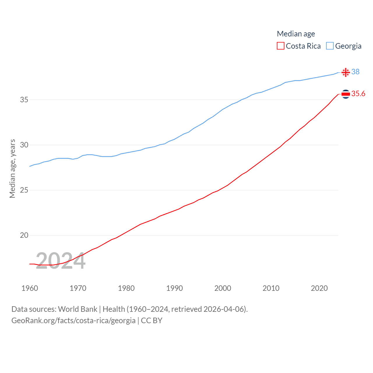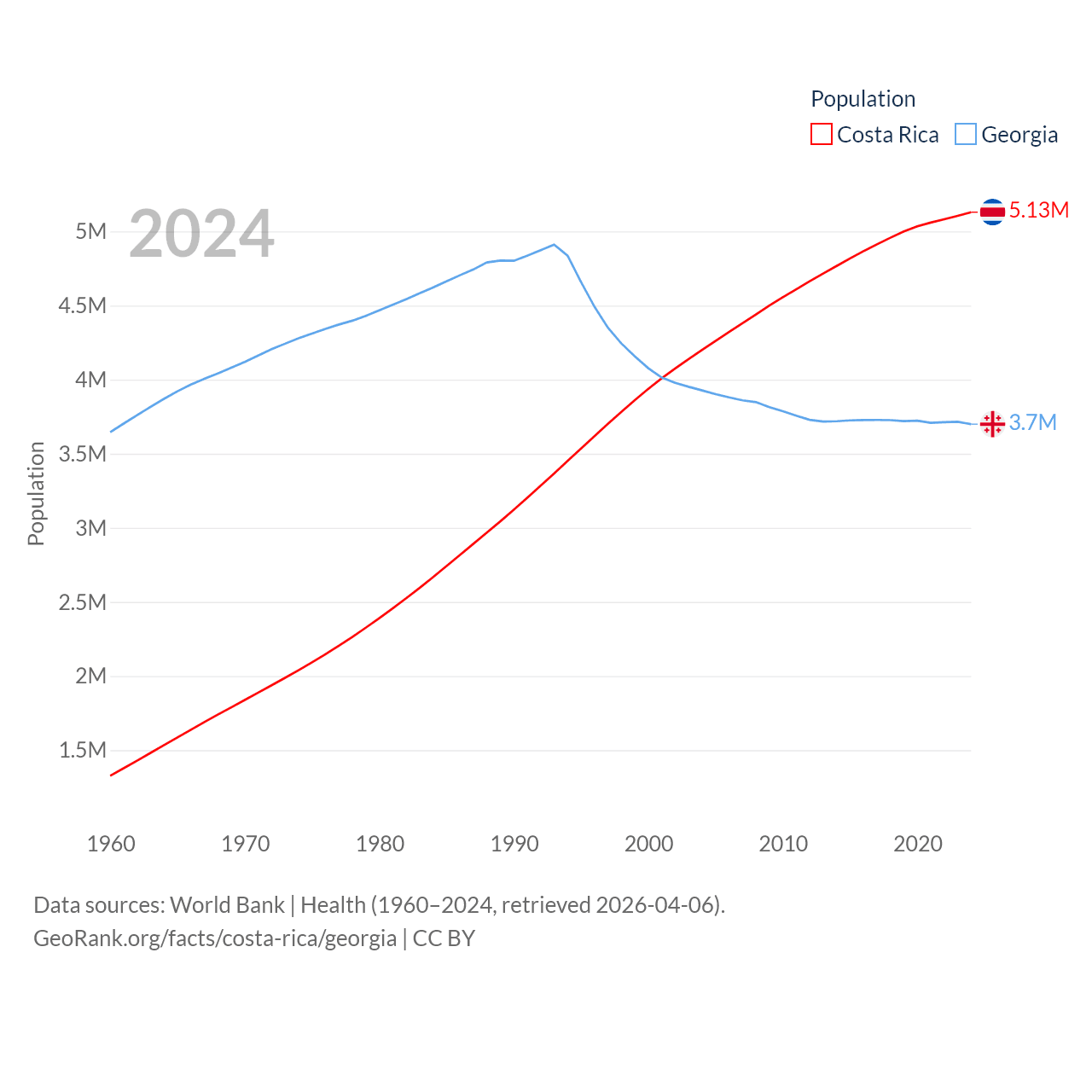Costa Rica has a population of 5.13M (ranked 126/197), compared with 3.7M in Georgia (ranked 130/197). Costa Rica's land area is 19,714 sq mi versus 26,830 sq mi for Georgia (ranked 126th vs. 118th).