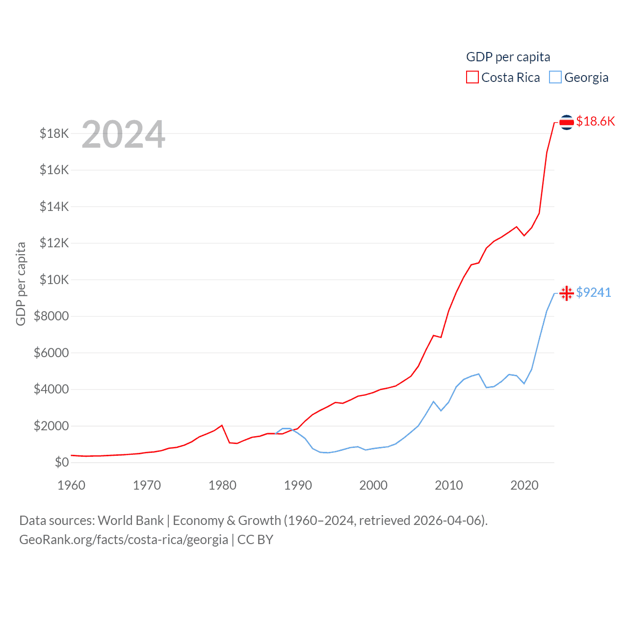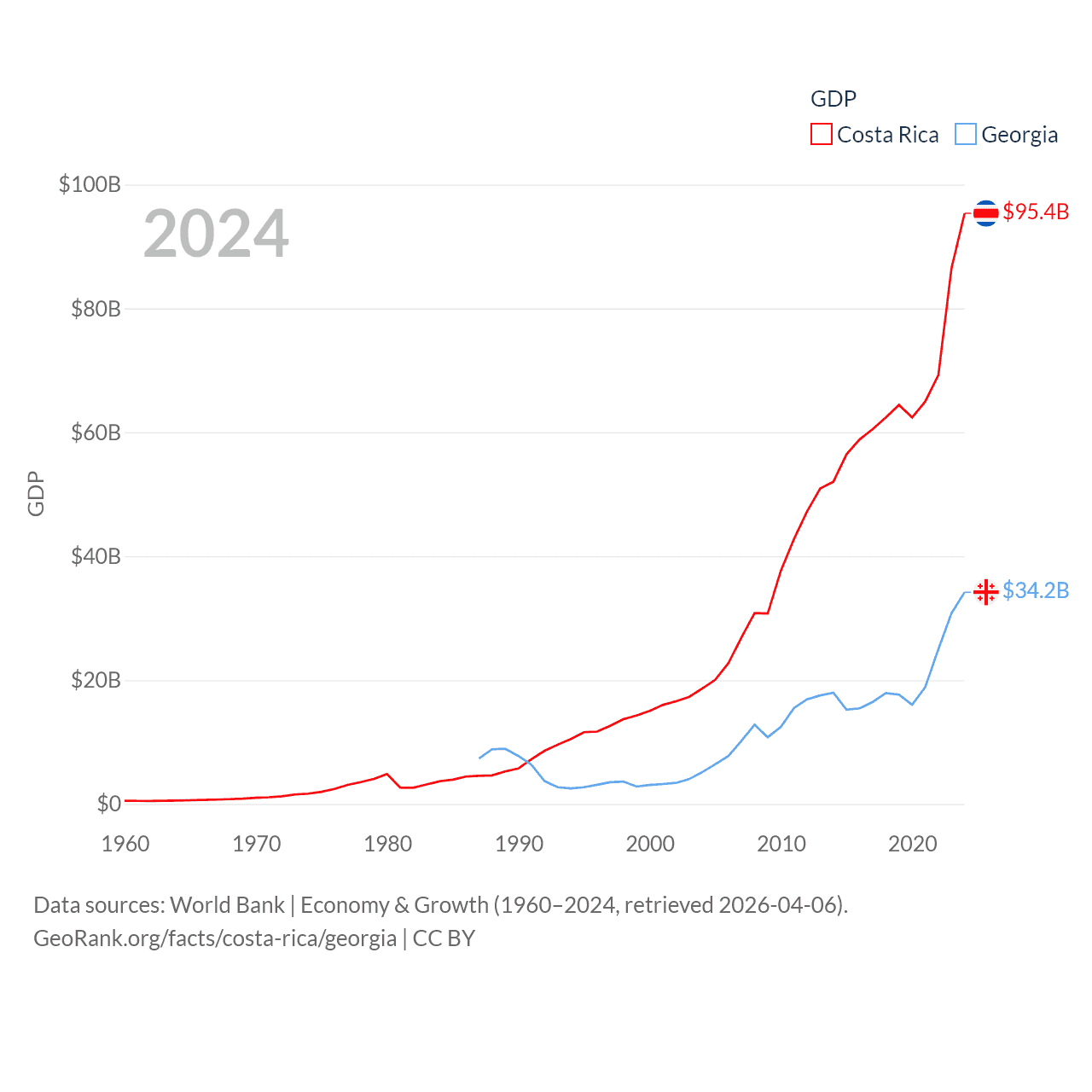 By GDP, Costa Rica ranks 73/197 ($95.4B) and Georgia ranks 107/197 ($34.2B). By GDP per capita, Costa Rica ranks 62/197 ($18,587), while Georgia ranks 89/197 ($9,241).