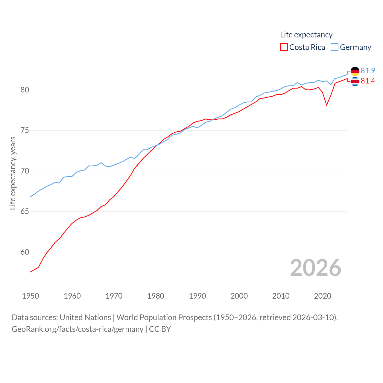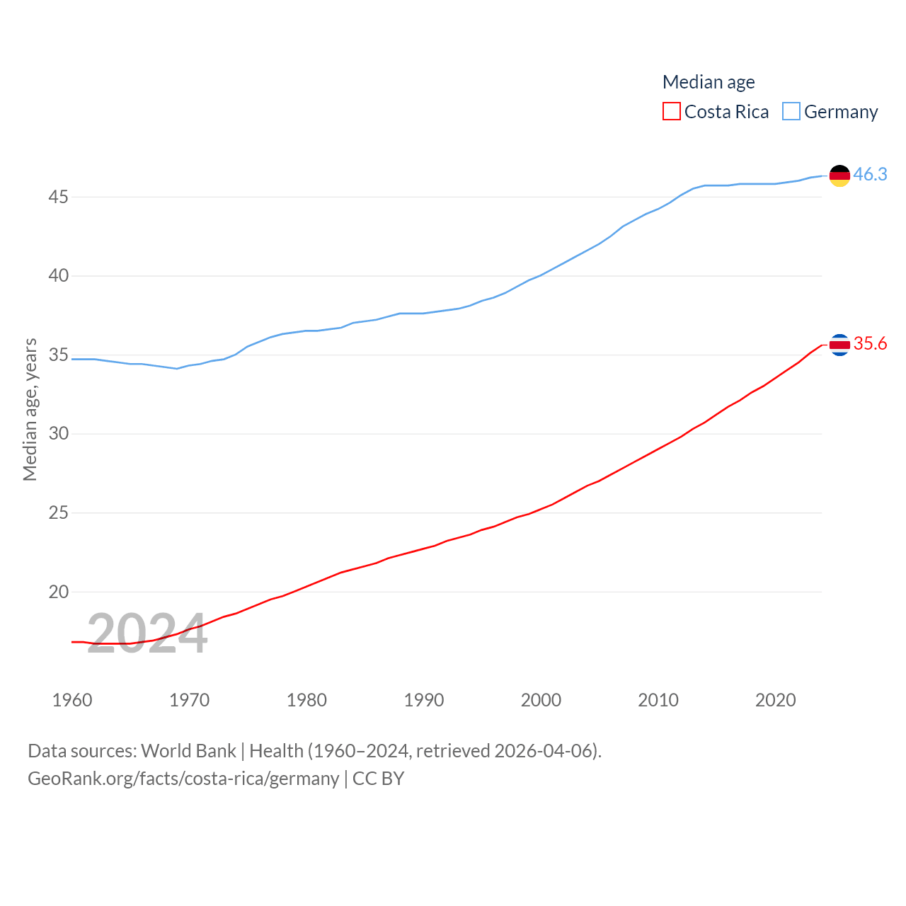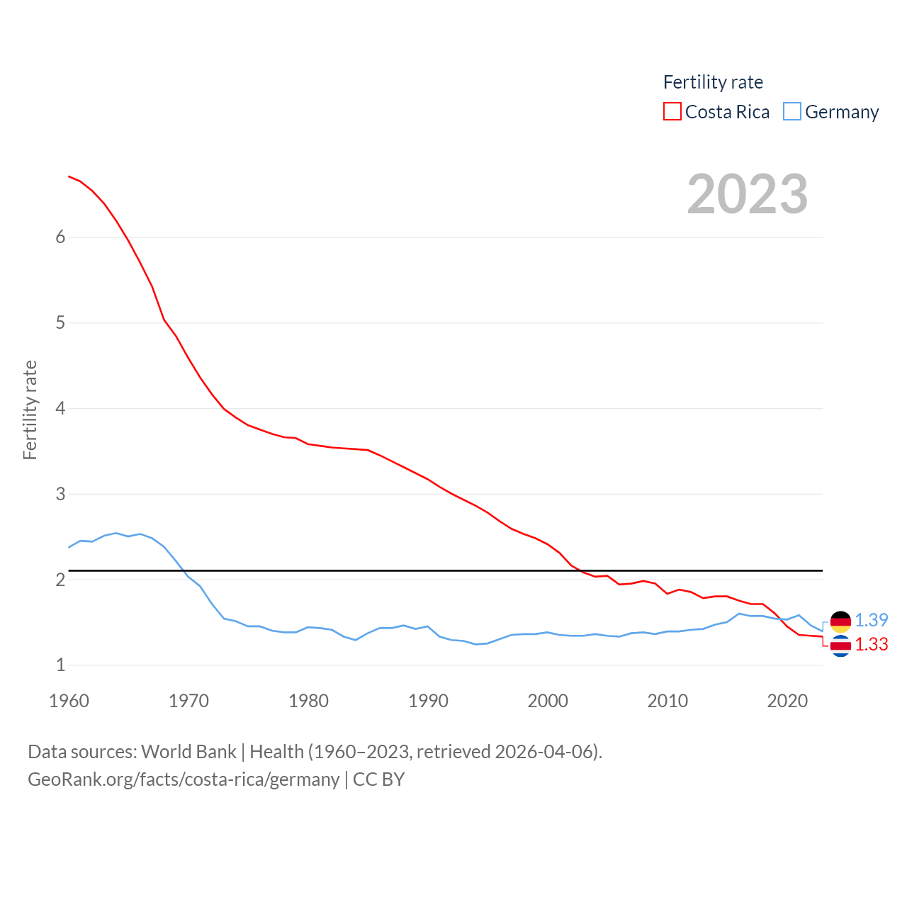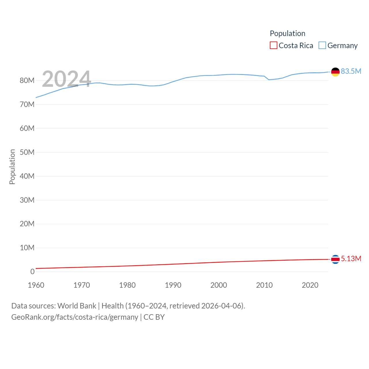 Costa Rica has a population of 5.13M (ranked 126/197), compared with 83.5M in Germany (ranked 19/197). Costa Rica's land area is 19,714 sq mi versus 134,916 sq mi for Germany (ranked 126th vs. 63rd).