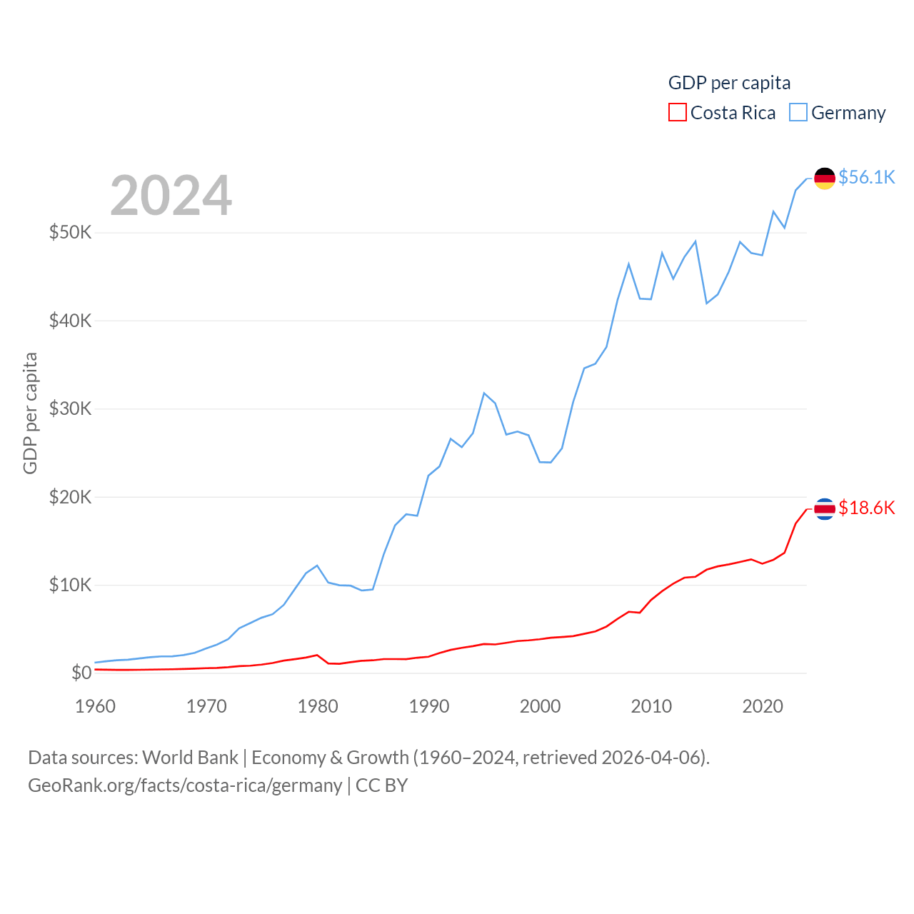 By GDP, Costa Rica ranks 73/197 ($95.4B) and Germany ranks 3/197 ($4.69T). By GDP per capita, Costa Rica ranks 62/197 ($18,587), while Germany ranks 19/197 ($56,104).