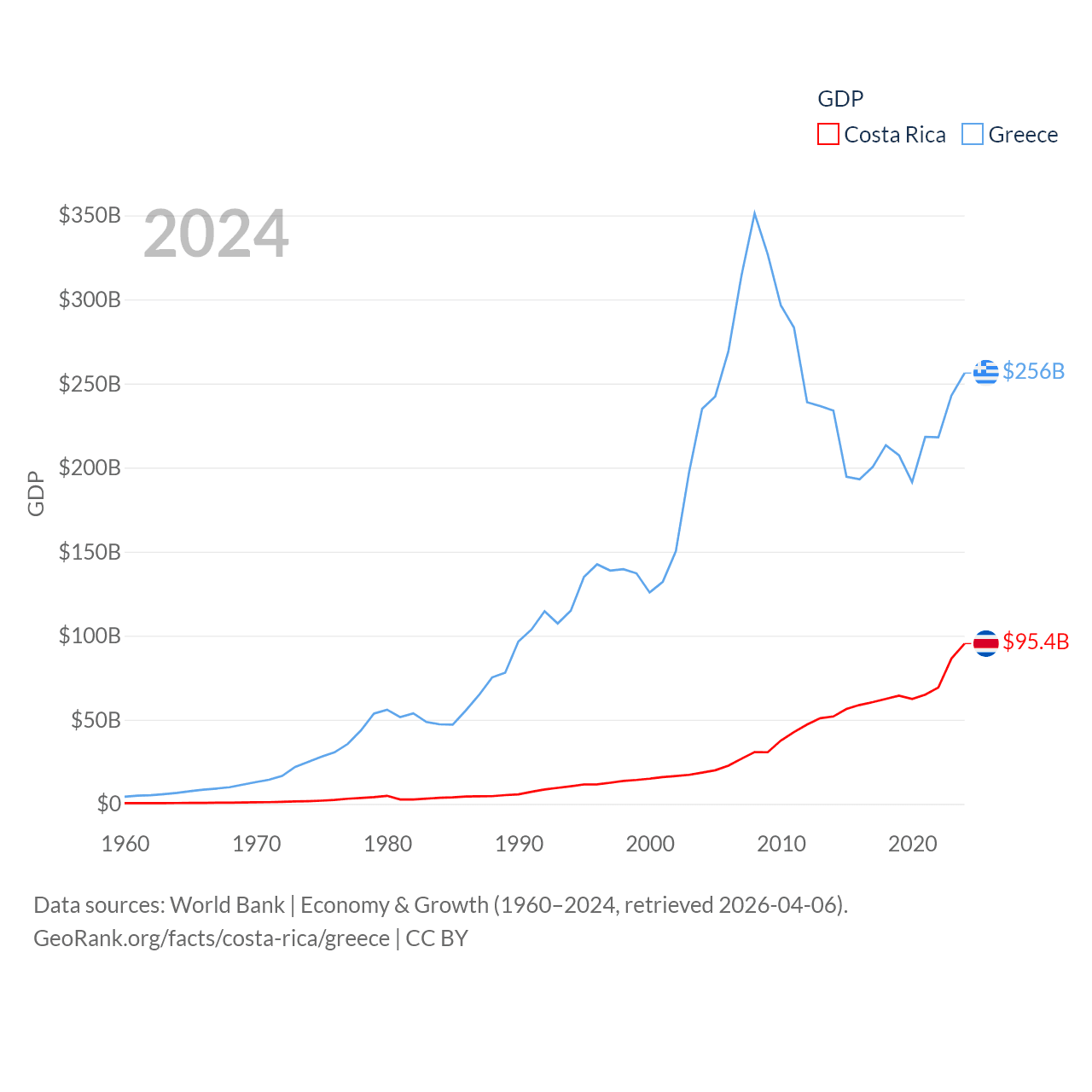 By GDP, Costa Rica ranks 73/197 ($95.4B) and Greece ranks 53/197 ($256B). By GDP per capita, Costa Rica ranks 62/197 ($18,587), while Greece ranks 49/197 ($24,626).
