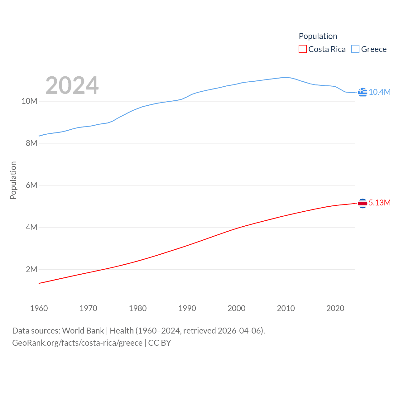 Costa Rica has a population of 5.13M (ranked 126/197), compared with 10.4M in Greece (ranked 94/197). Costa Rica's land area is 19,714 sq mi versus 49,769 sq mi for Greece (ranked 126th vs. 95th).
