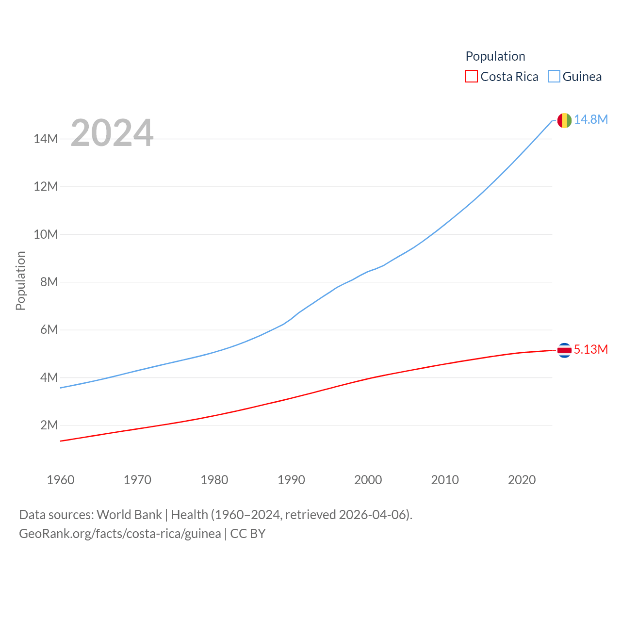 Costa Rica has a population of 5.13M (ranked 126/197), compared with 14.8M in Guinea (ranked 75/197). Costa Rica's land area is 19,714 sq mi versus 94,873 sq mi for Guinea (ranked 126th vs. 77th).