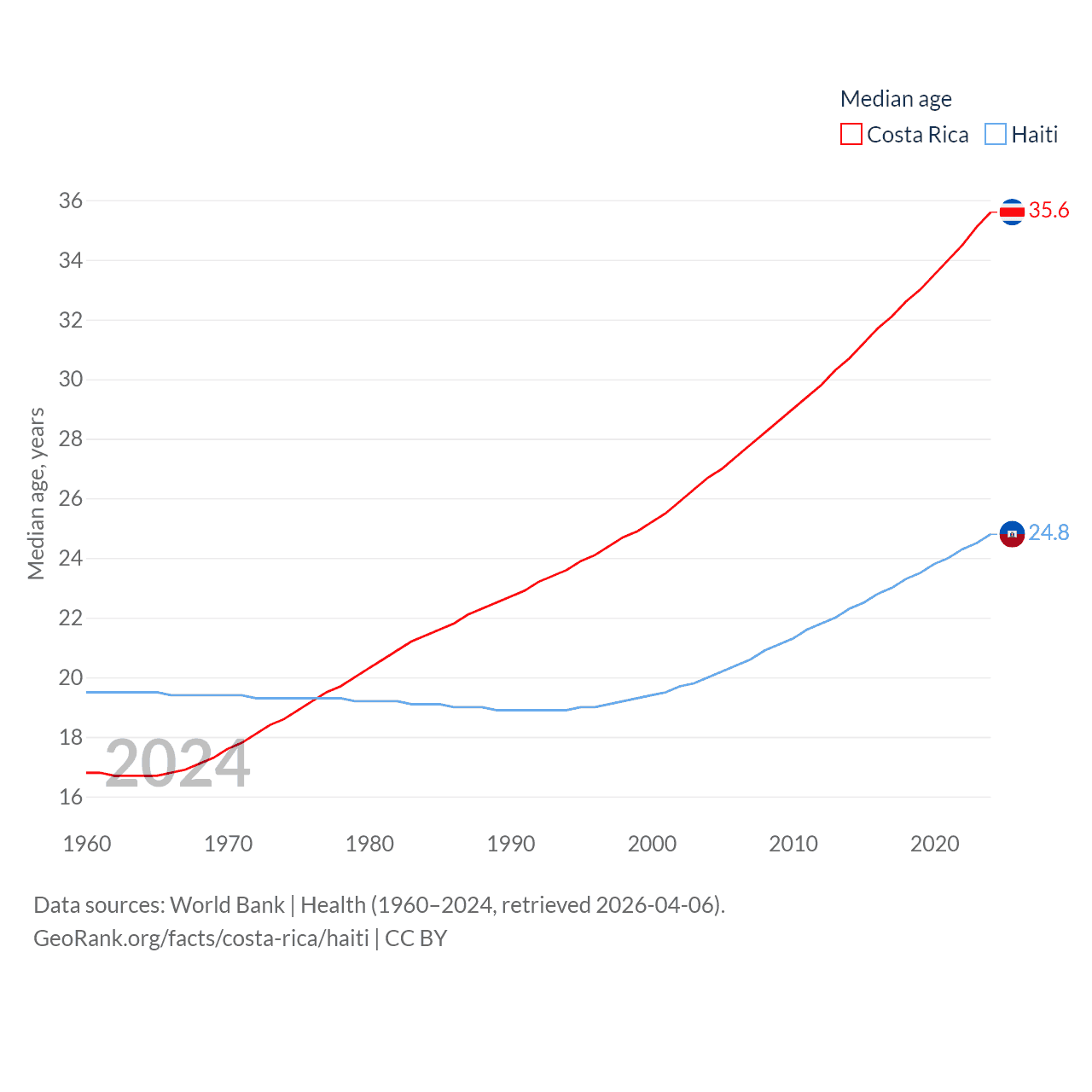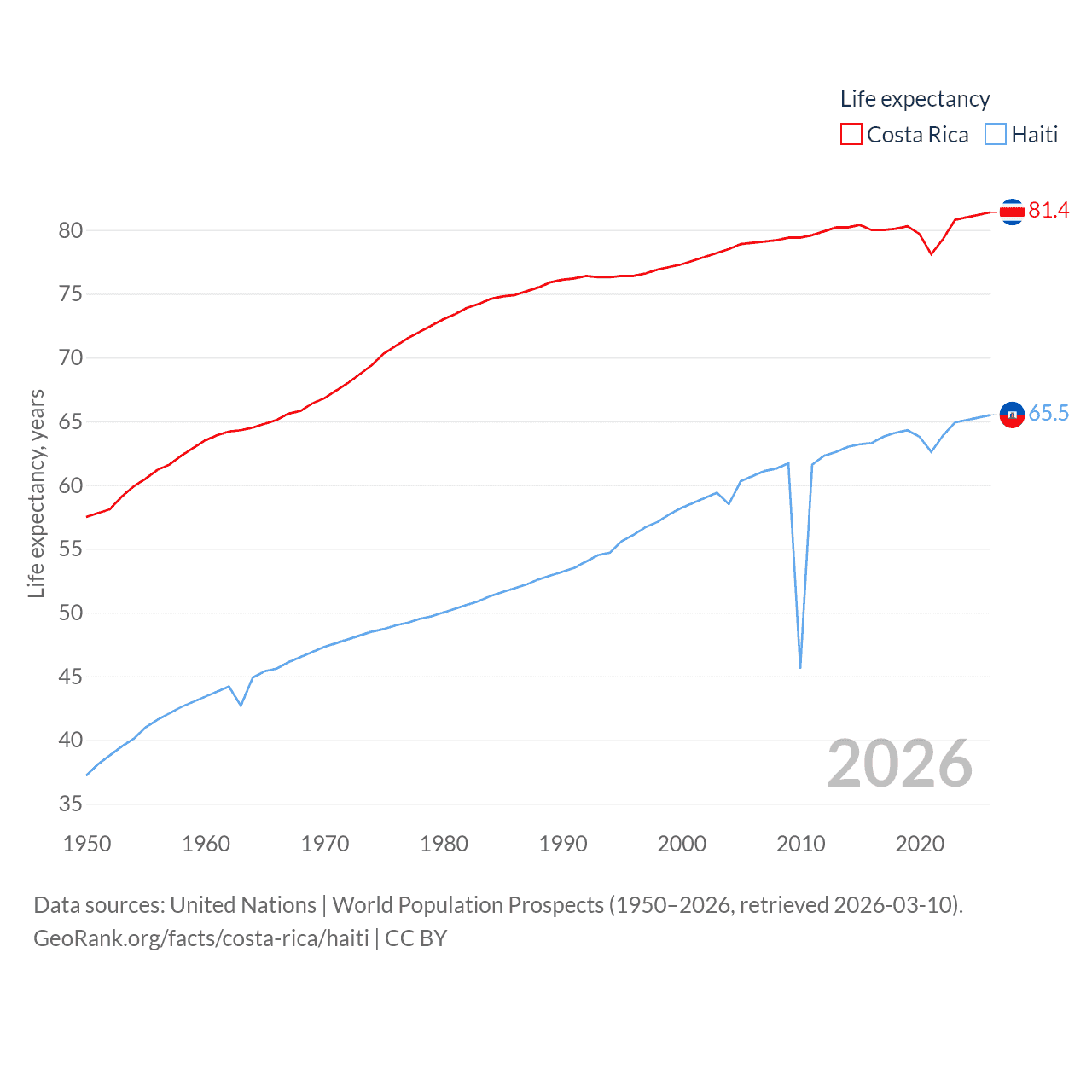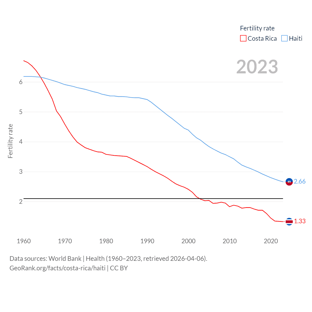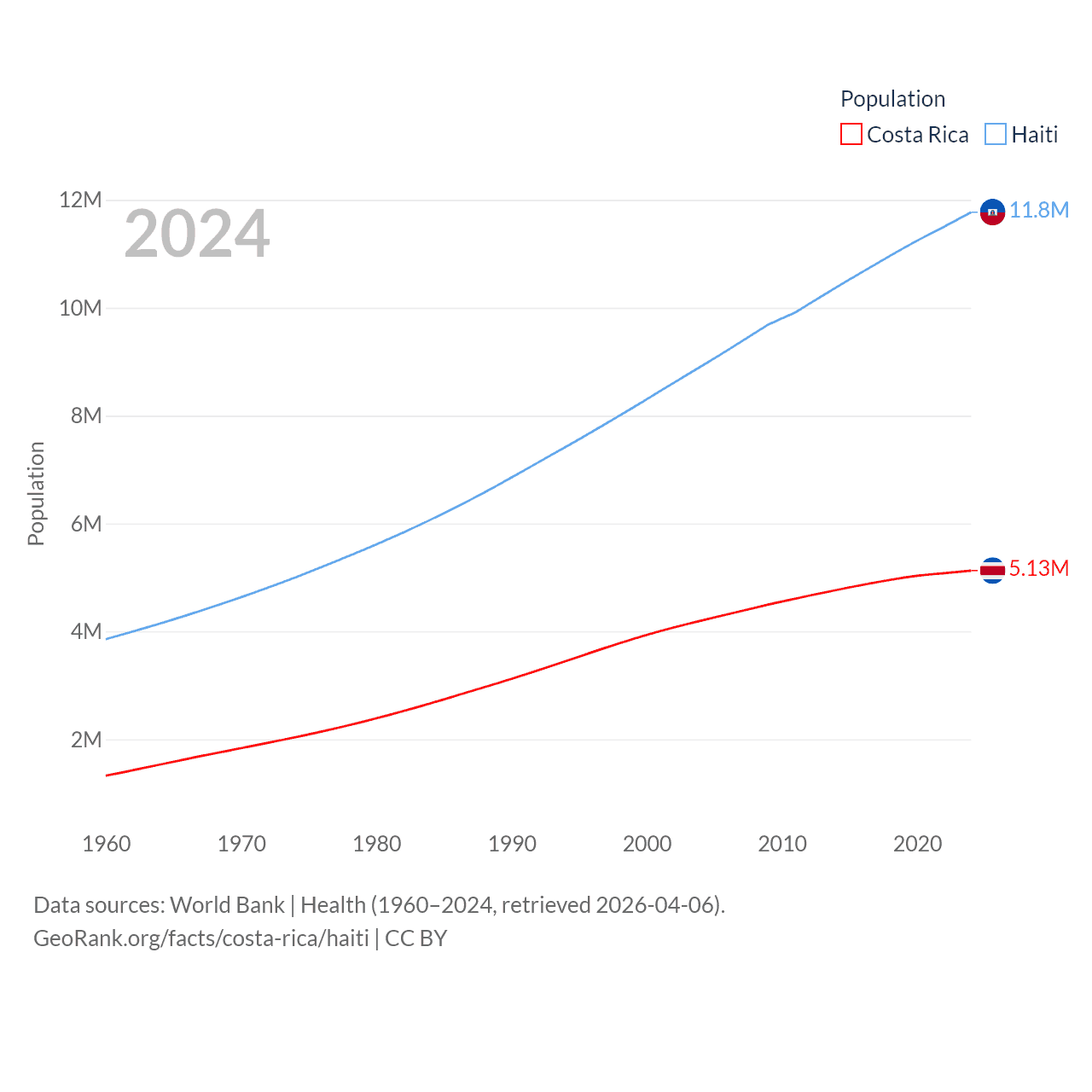 Costa Rica has a population of 5.13M (ranked 126/197), compared with 11.8M in Haiti (ranked 83/197). Costa Rica's land area is 19,714 sq mi versus 10,641 sq mi for Haiti (ranked 126th vs. 142nd).