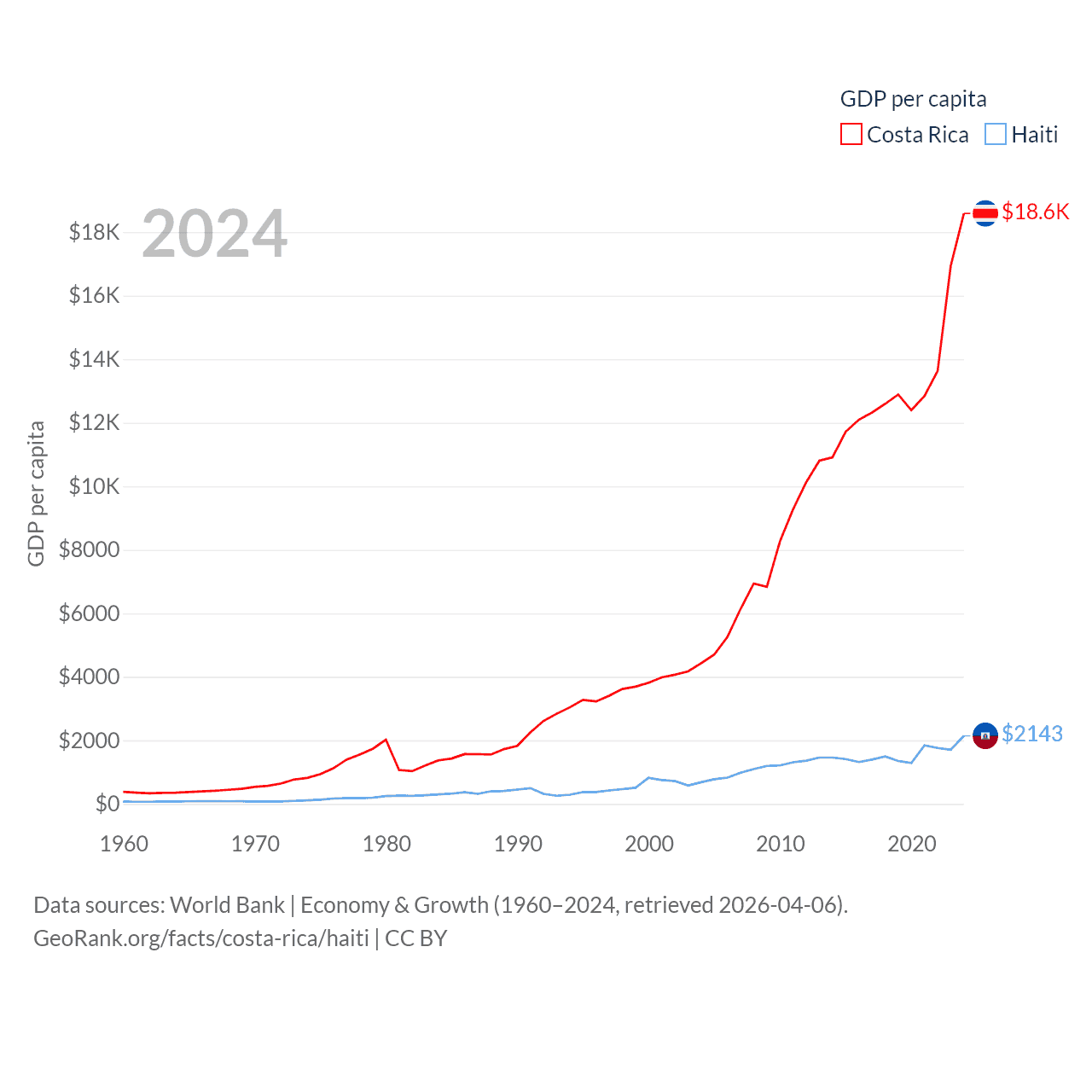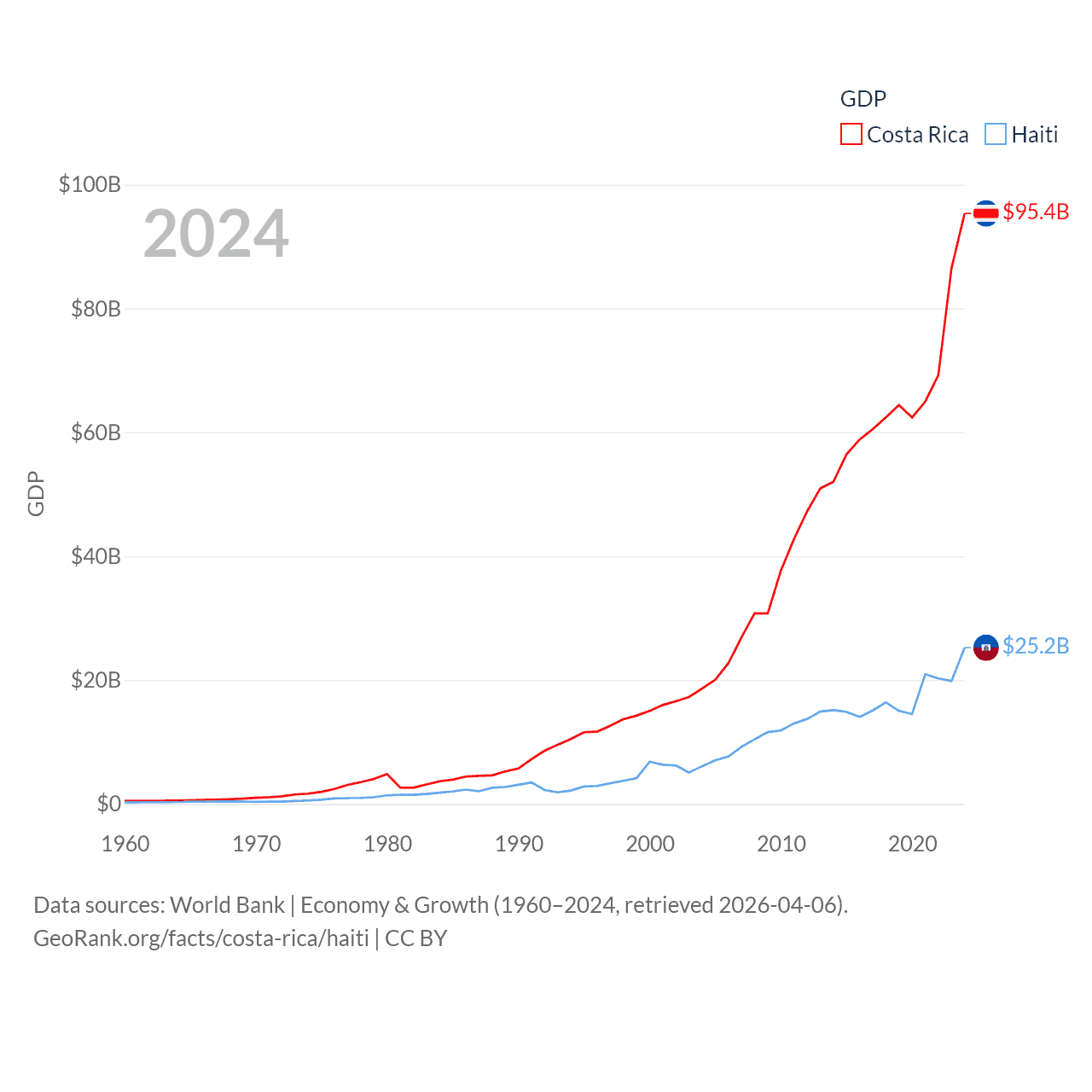 By GDP, Costa Rica ranks 73/197 ($95.4B) and Haiti ranks 117/197 ($25.2B). By GDP per capita, Costa Rica ranks 62/197 ($18,587), while Haiti ranks 153/197 ($2,143).