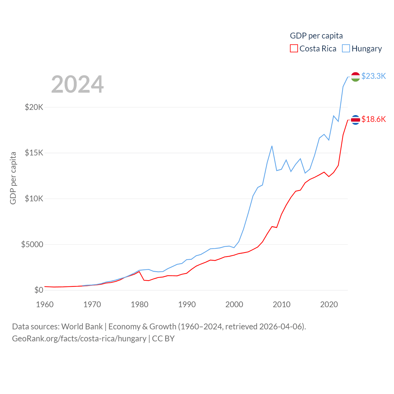 By GDP, Costa Rica ranks 73/197 ($95.4B) and Hungary ranks 55/197 ($223B). By GDP per capita, Costa Rica ranks 62/197 ($18,587), while Hungary ranks 55/197 ($23,292).