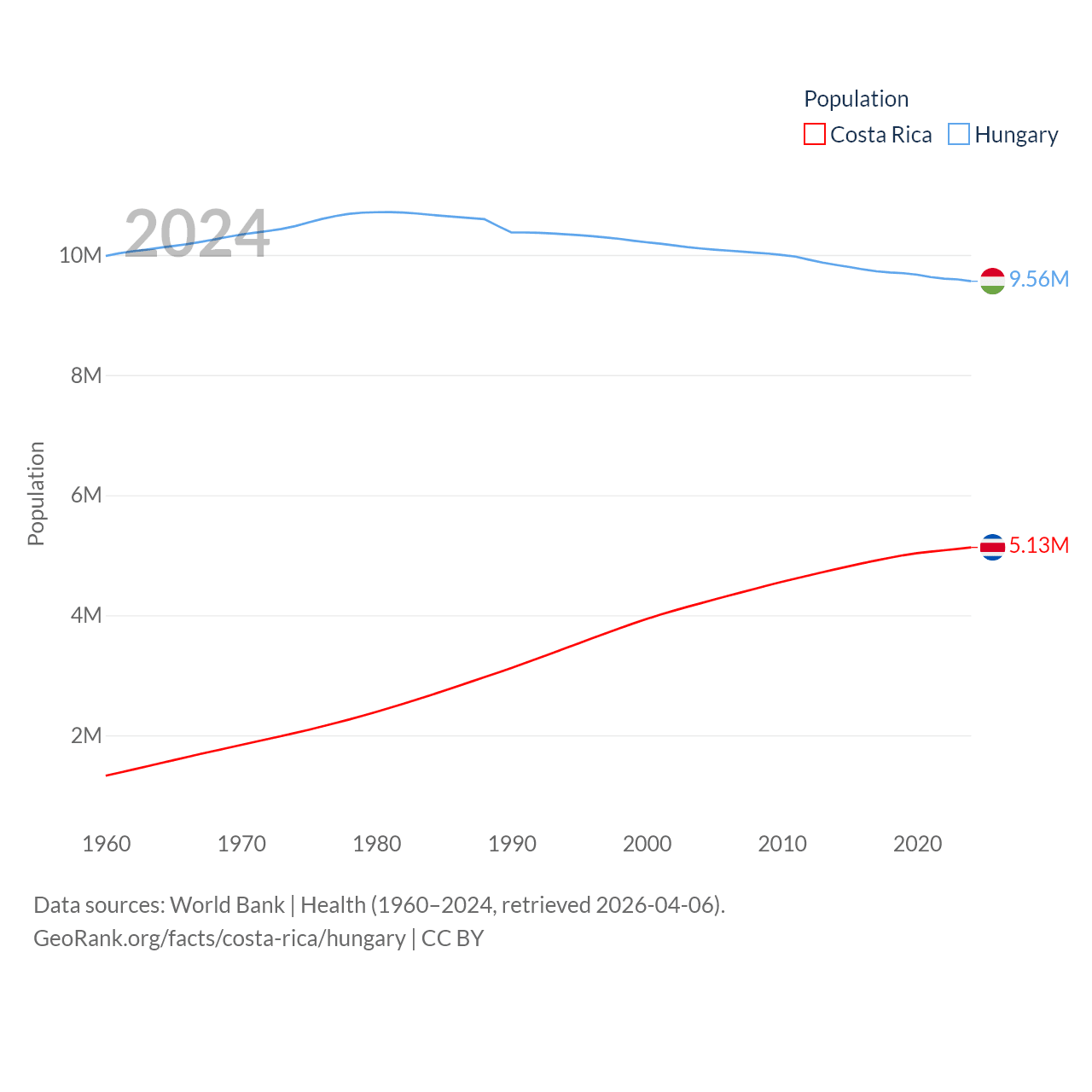 Costa Rica has a population of 5.13M (ranked 126/197), compared with 9.56M in Hungary (ranked 97/197). Costa Rica's land area is 19,714 sq mi versus 35,236 sq mi for Hungary (ranked 126th vs. 109th).